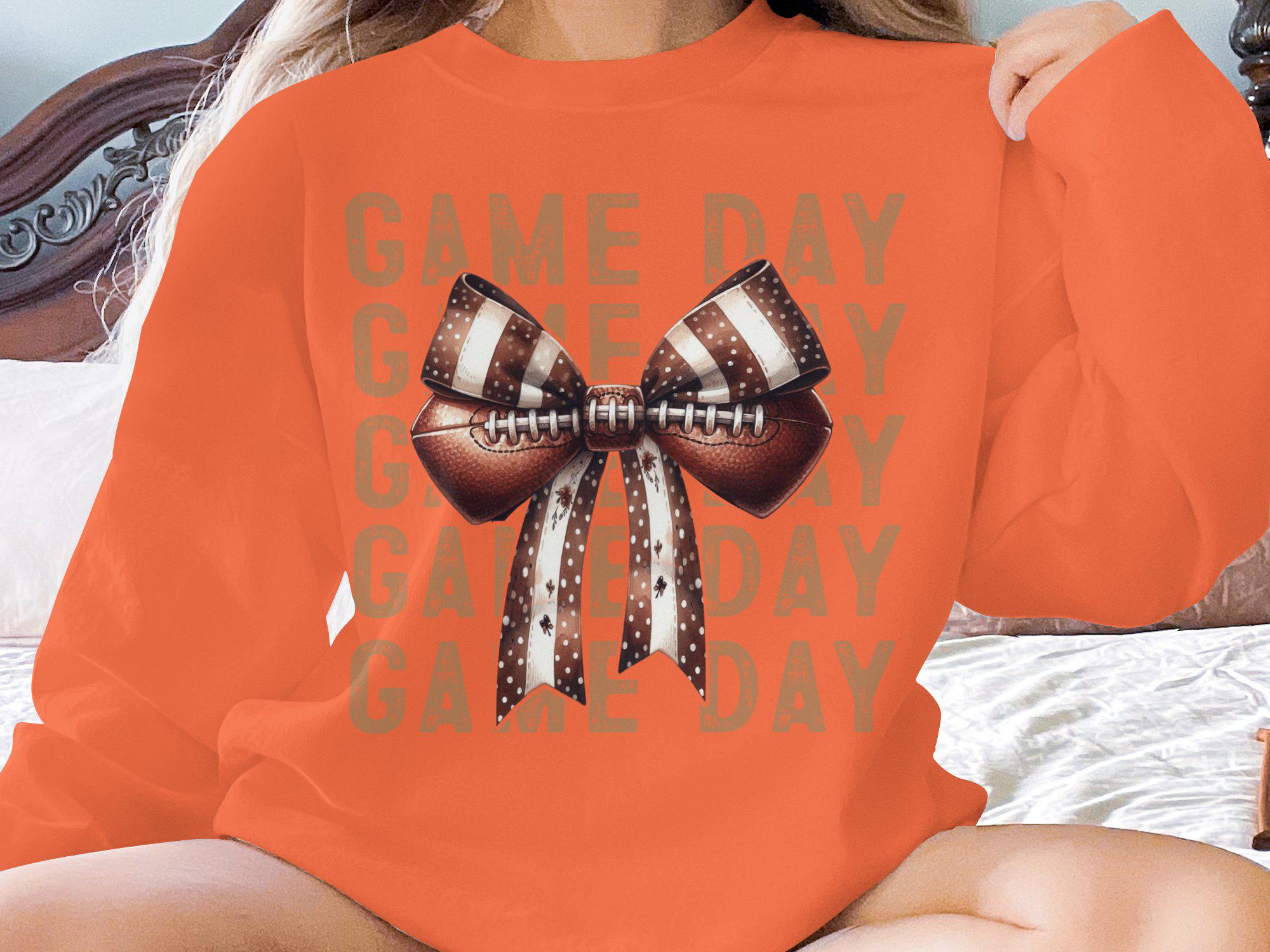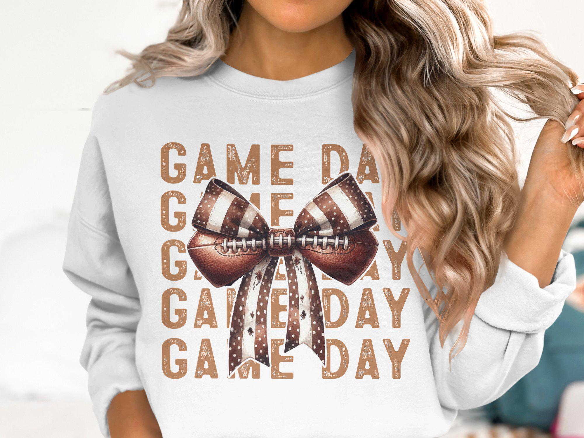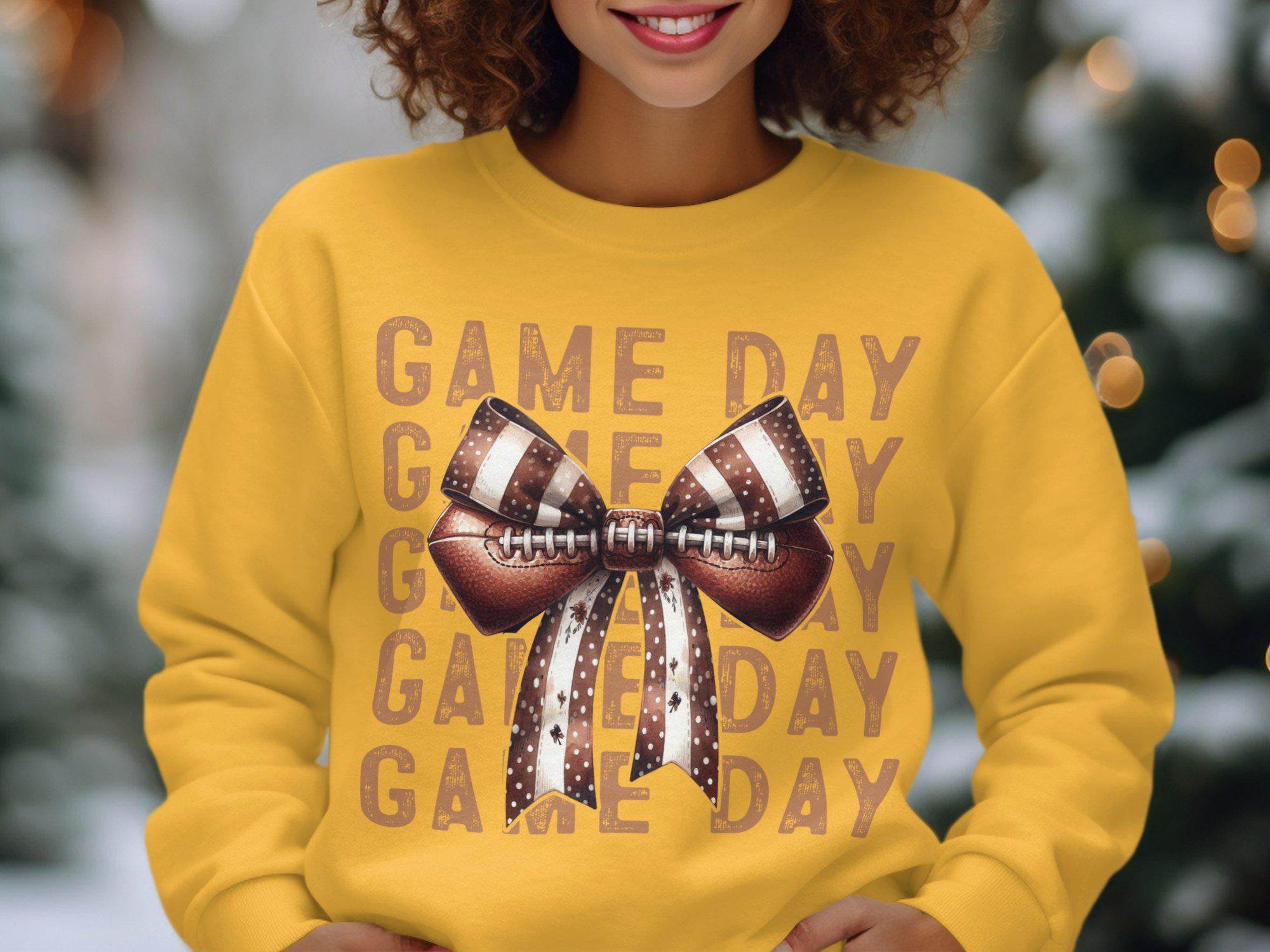 Show your team spirit with this cozy sweatshirt featuring a cute football bow design. Perfect for game day, cheerleaders, or any sports fan, this comfortable top is a must-have for supporting your favorite team. Makes a fantastic gift for sports enthusiasts. Celebrate game day in style and comfort!