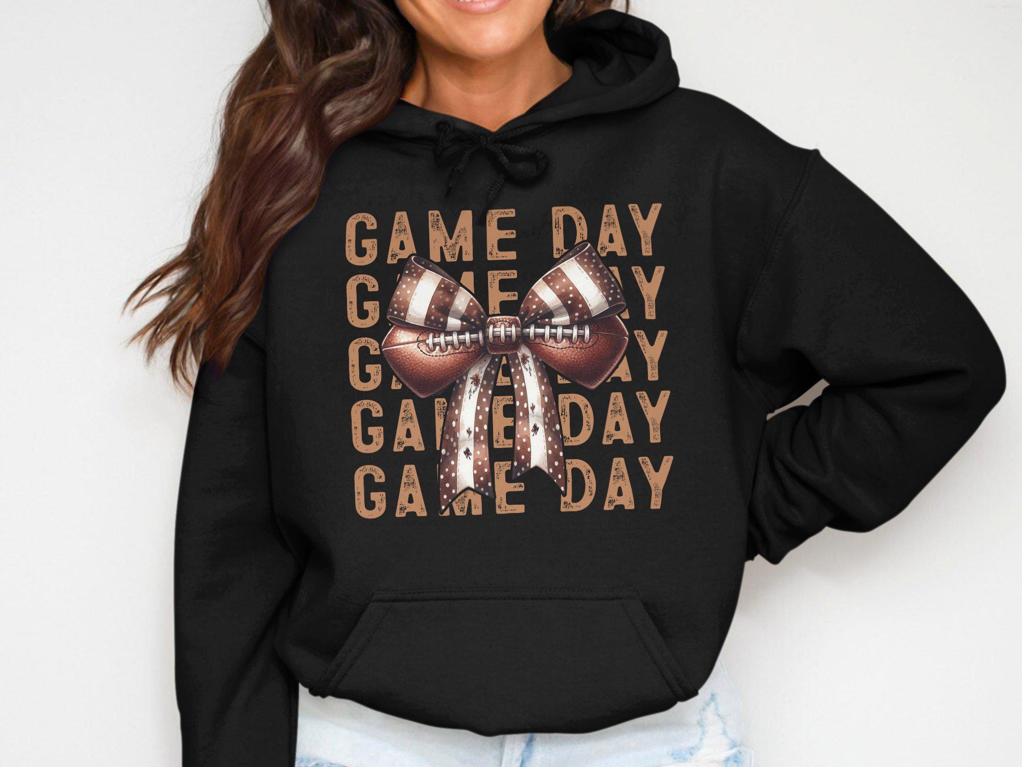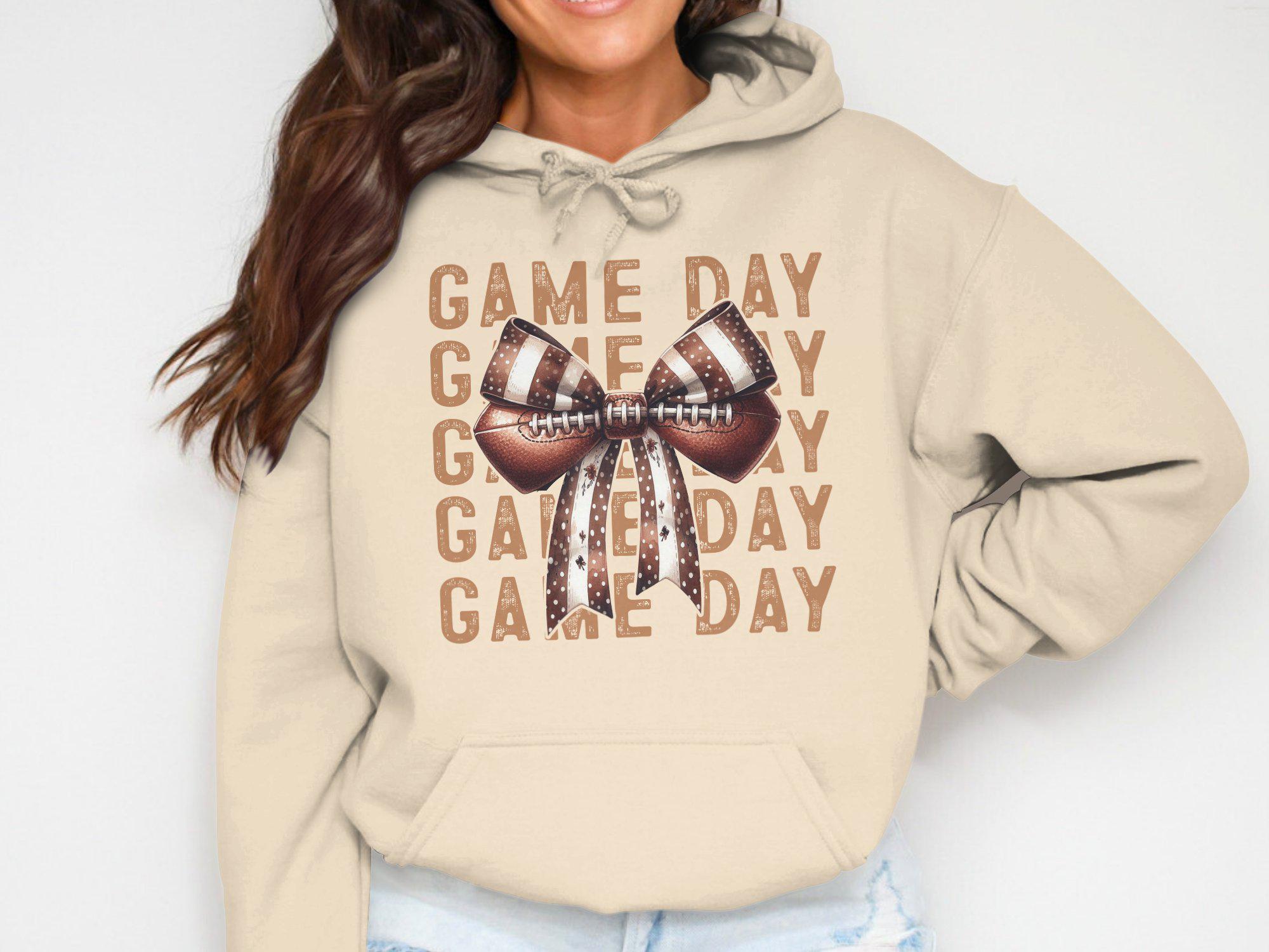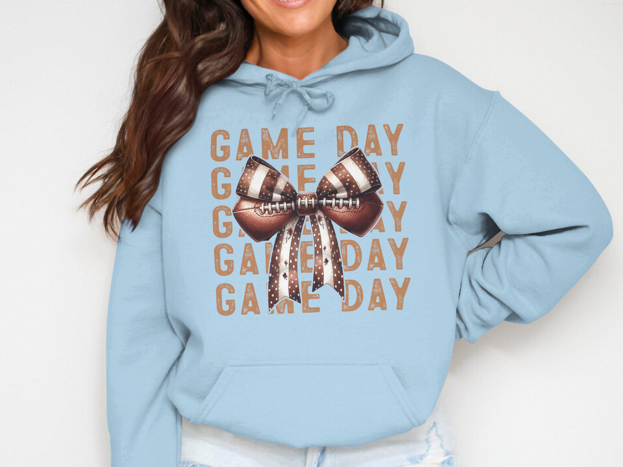Show your team spirit with this cozy sweatshirt featuring a cute football bow design. Perfect for game day, cheerleaders, or any sports fan, this comfortable top is a must-have for supporting your favorite team. Makes a fantastic gift for sports enthusiasts. Celebrate game day in style and comfort!