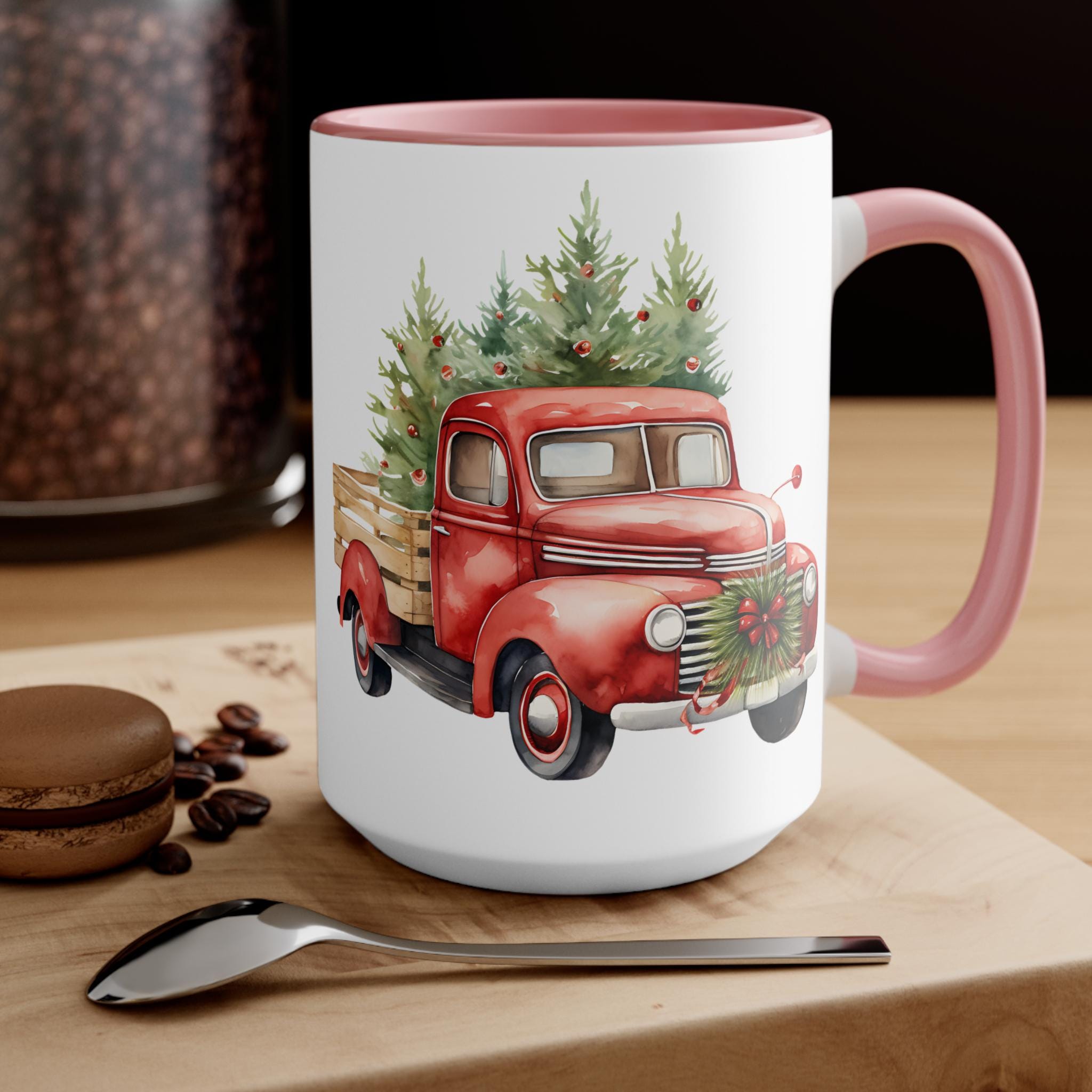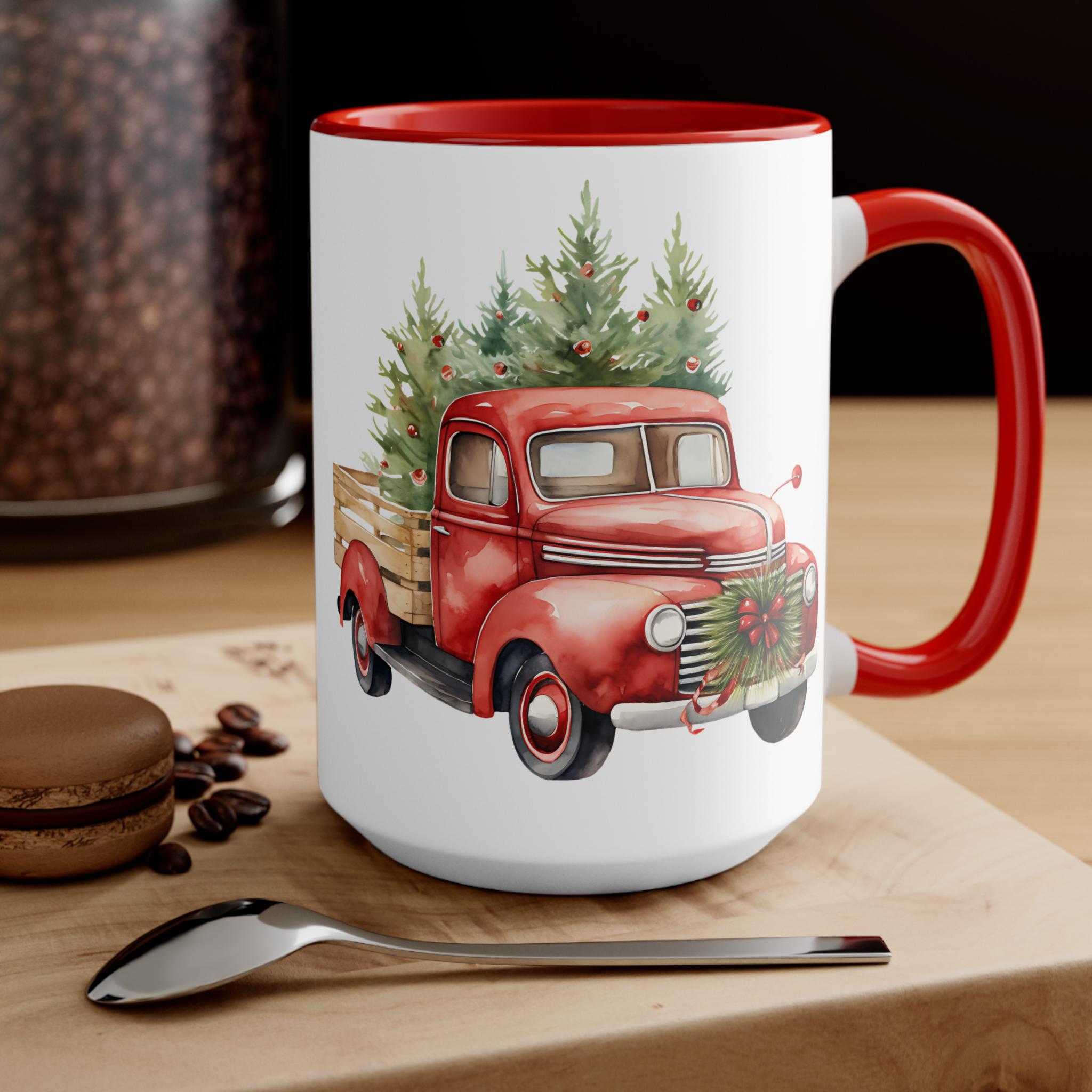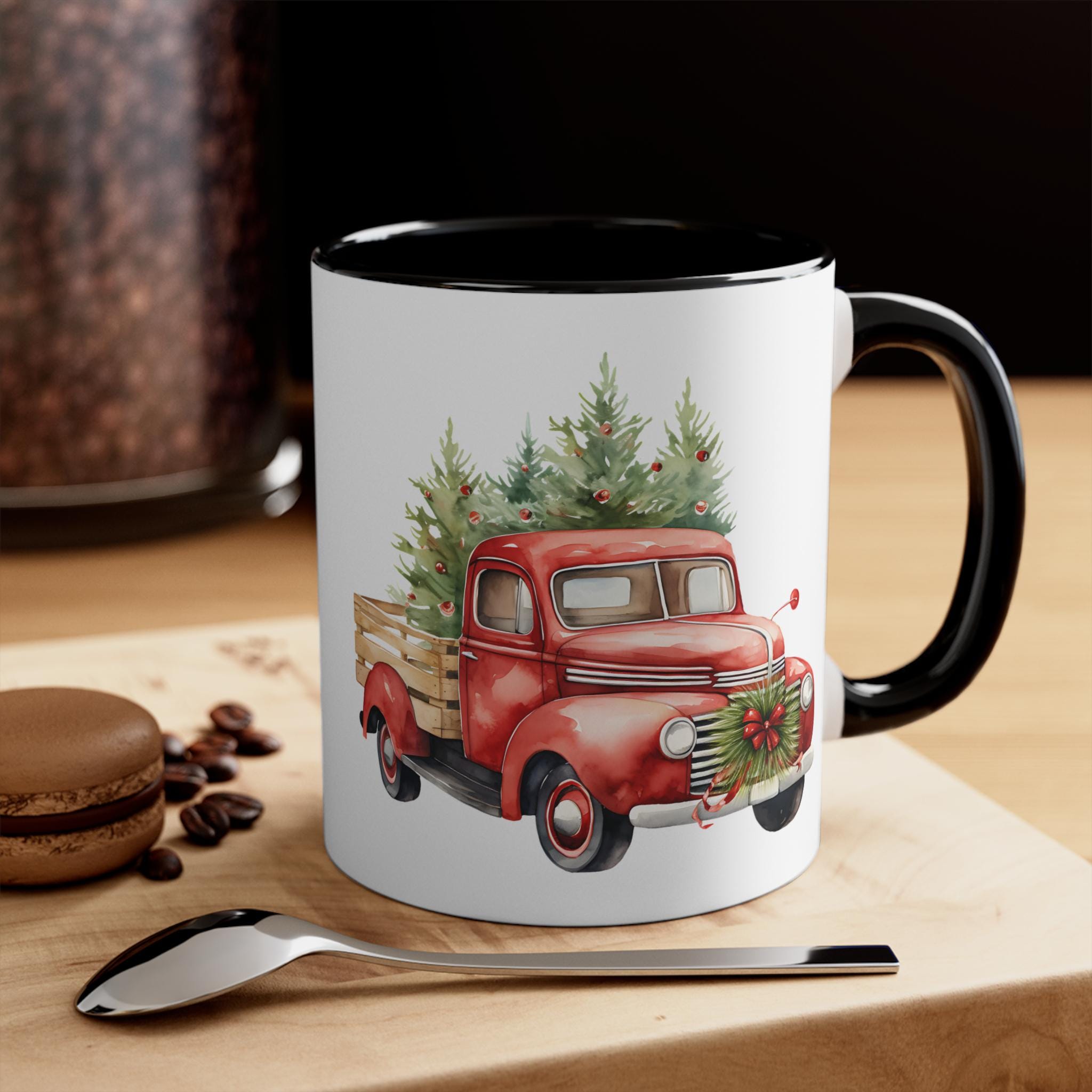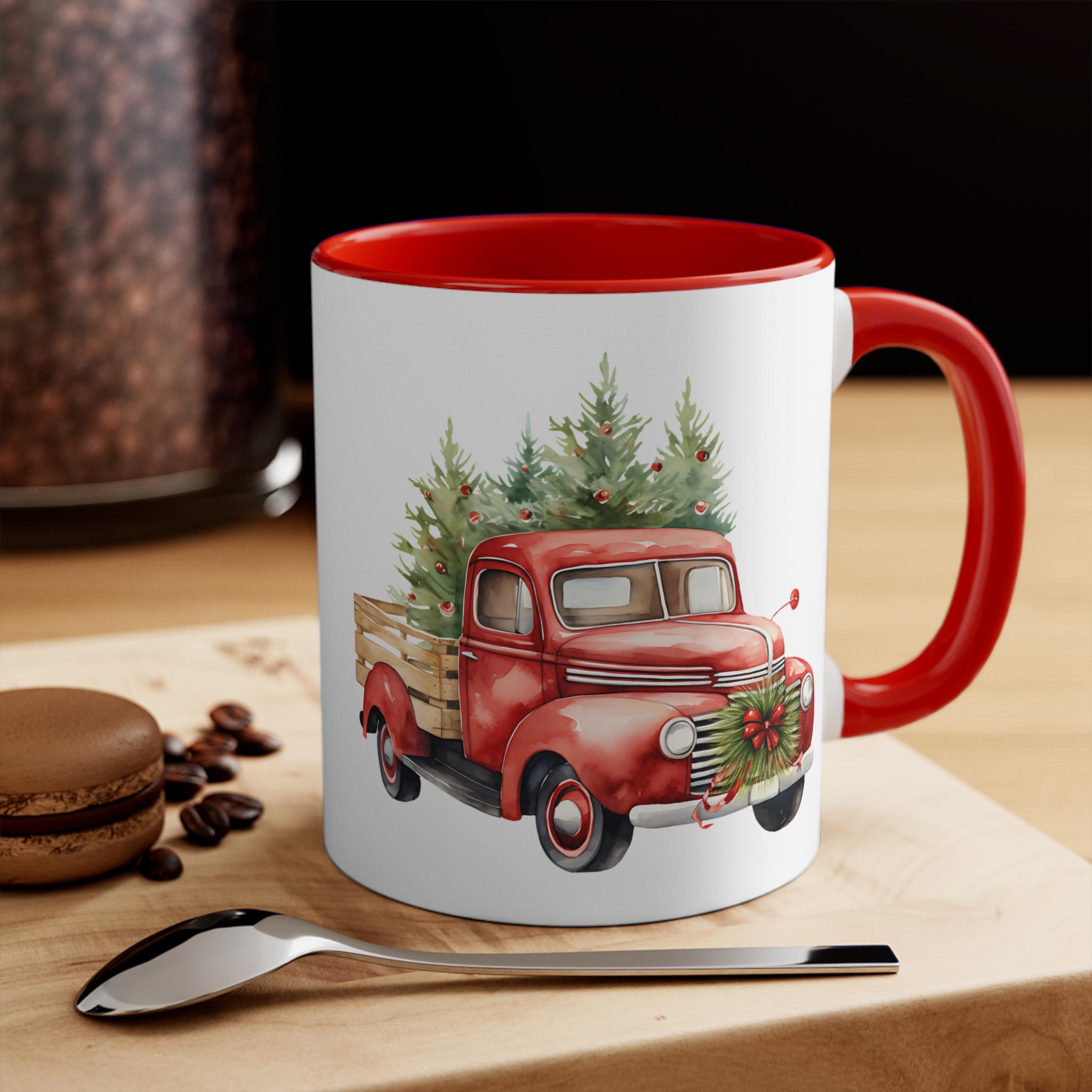 Vintage Red Truck Christmas Accent Mug, perfect for adding a festive touch to your morning coffee or tea. The vibrant colors and vintage design bring a cozy and nostalgic vibe, making it ideal for Christmas enthusiasts and collectors. Suitable for microwave and dishwasher use, with two size options available.