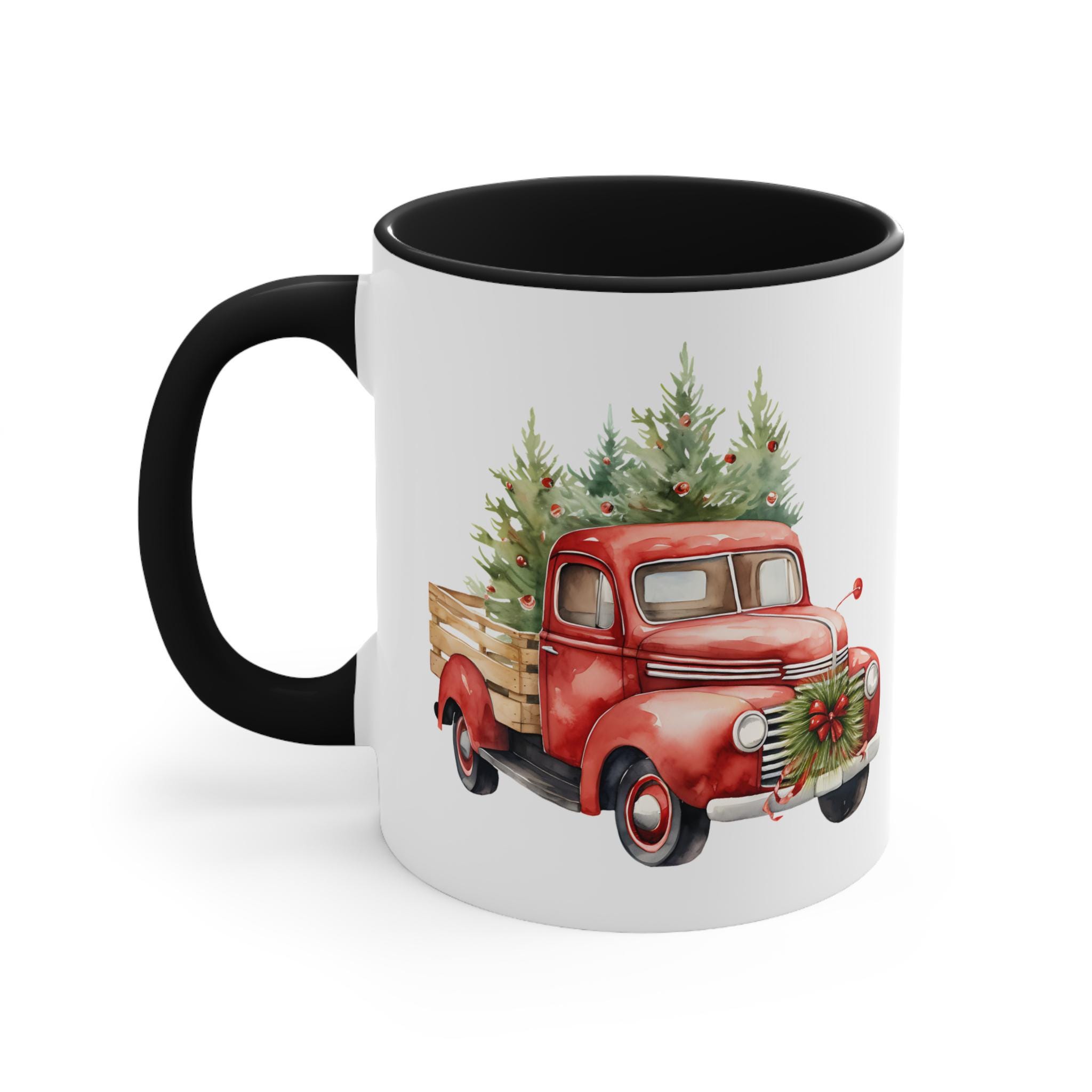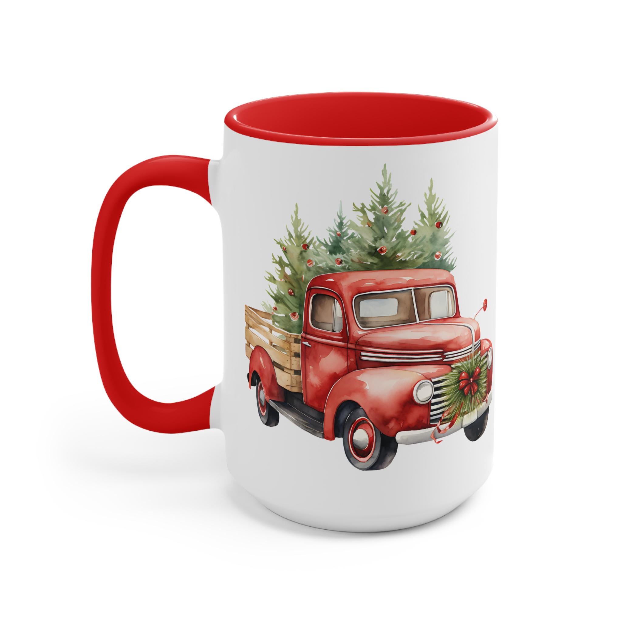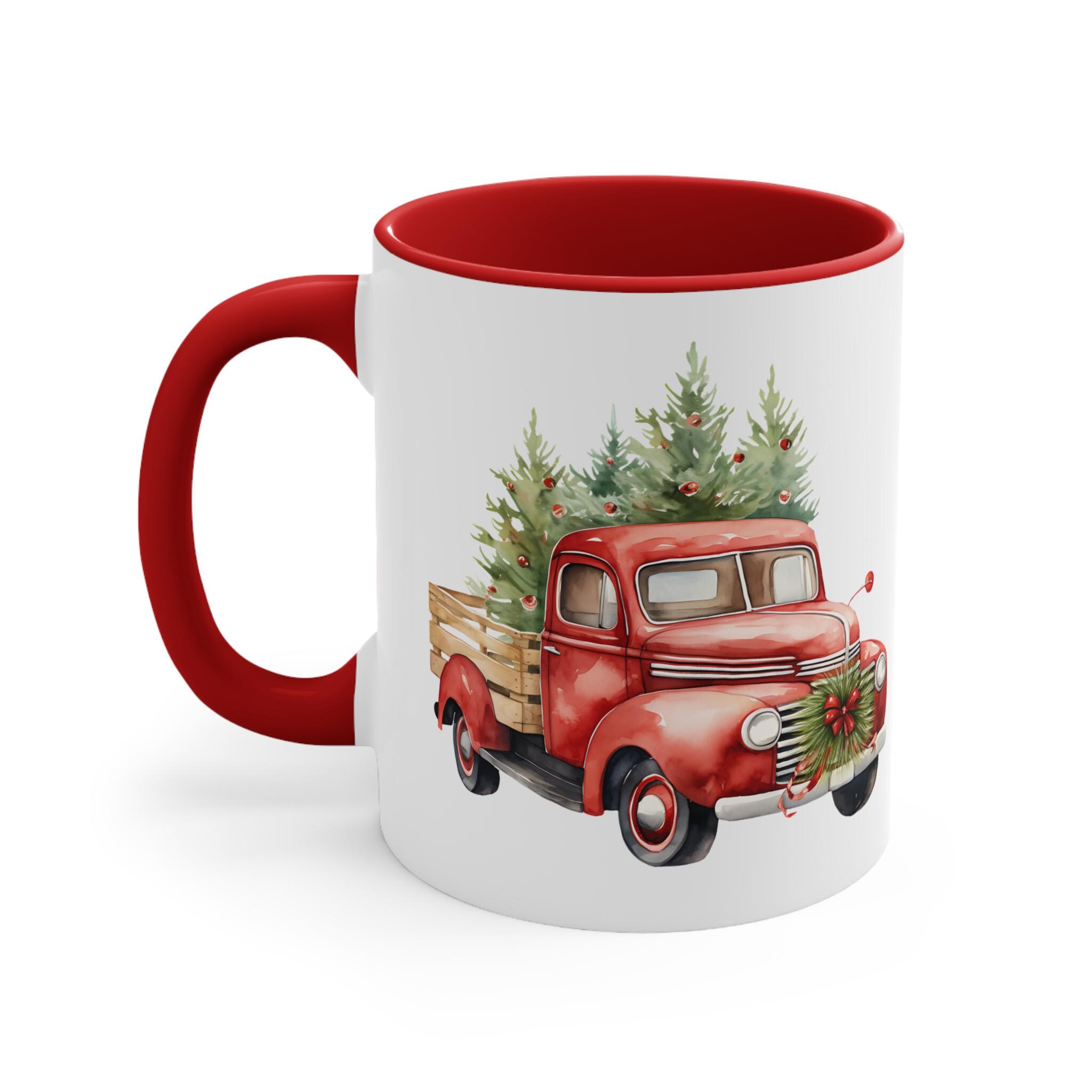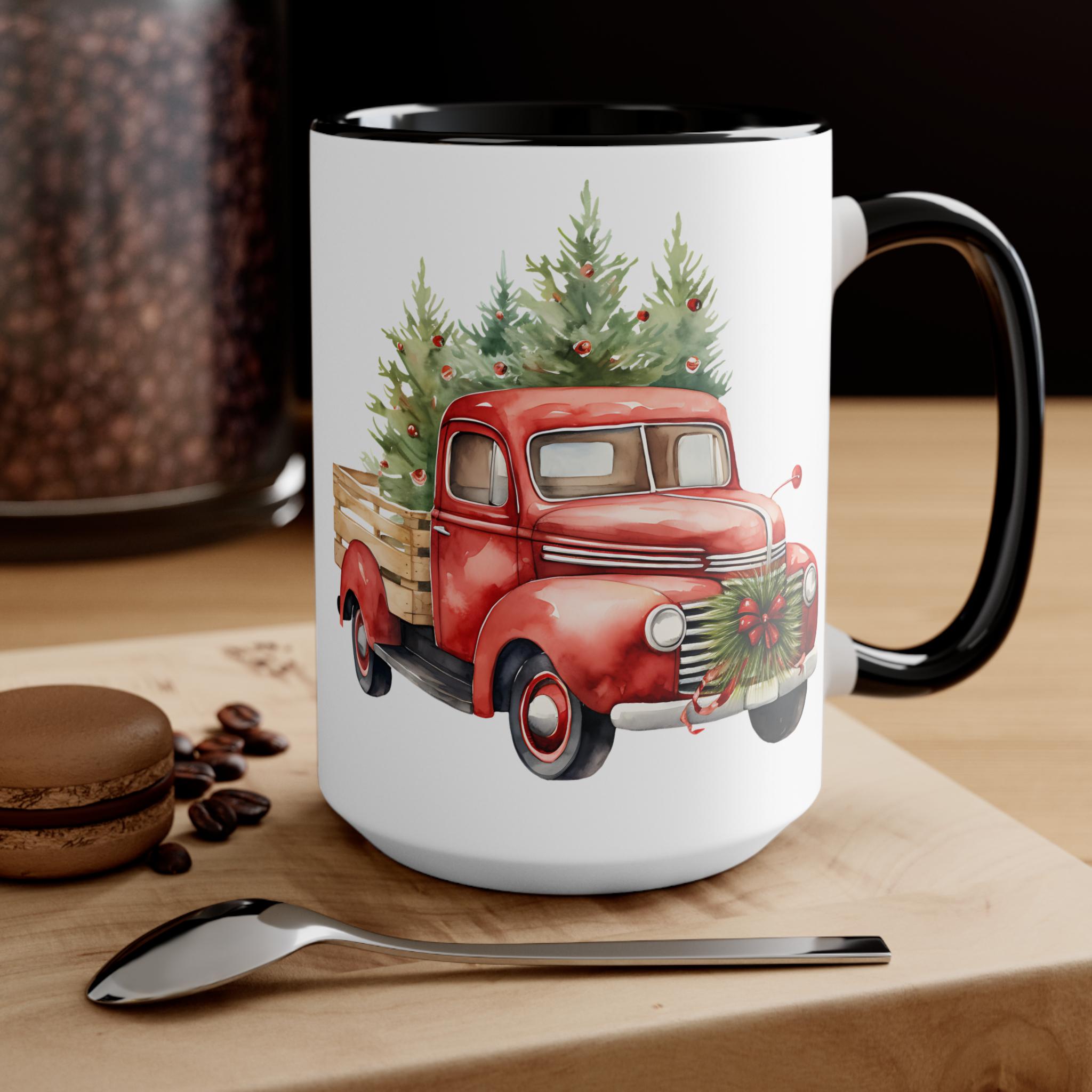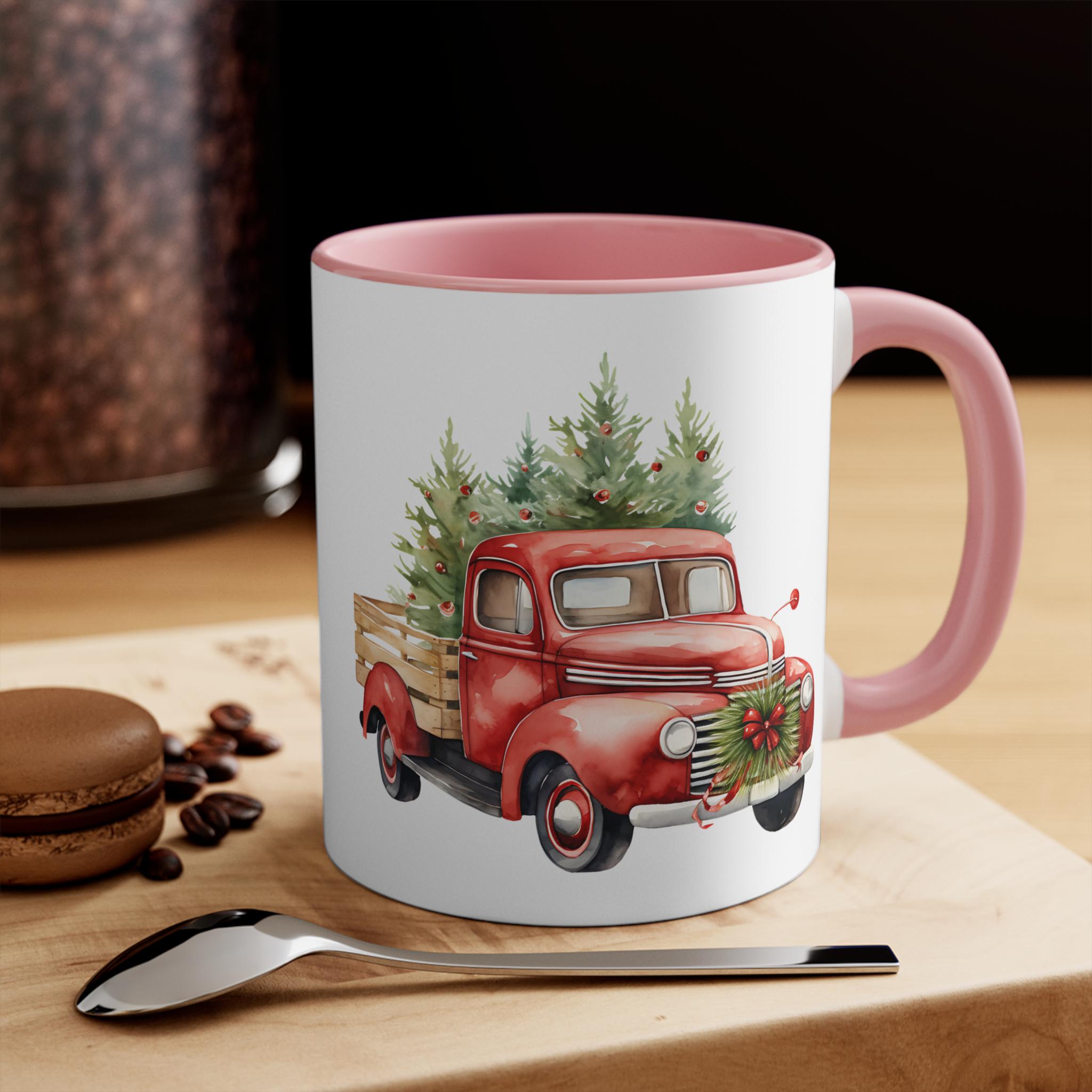 Vintage Red Truck Christmas Accent Mug, perfect for adding a festive touch to your morning coffee or tea. The vibrant colors and vintage design bring a cozy and nostalgic vibe, making it ideal for Christmas enthusiasts and collectors. Suitable for microwave and dishwasher use, with two size options available.