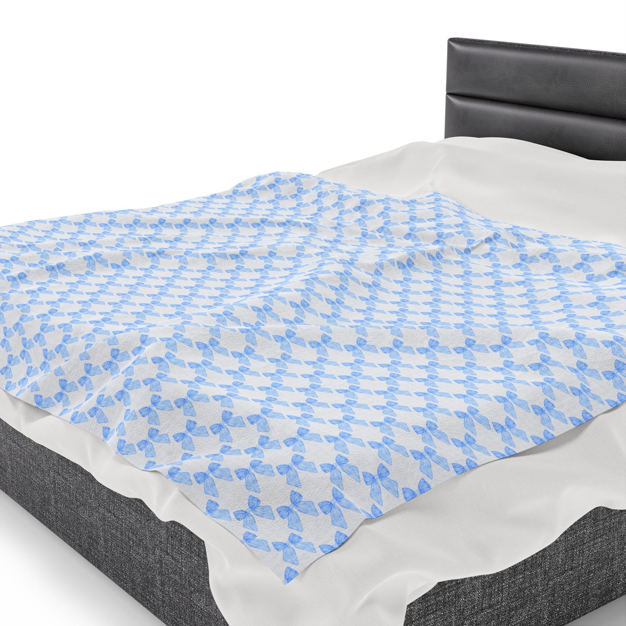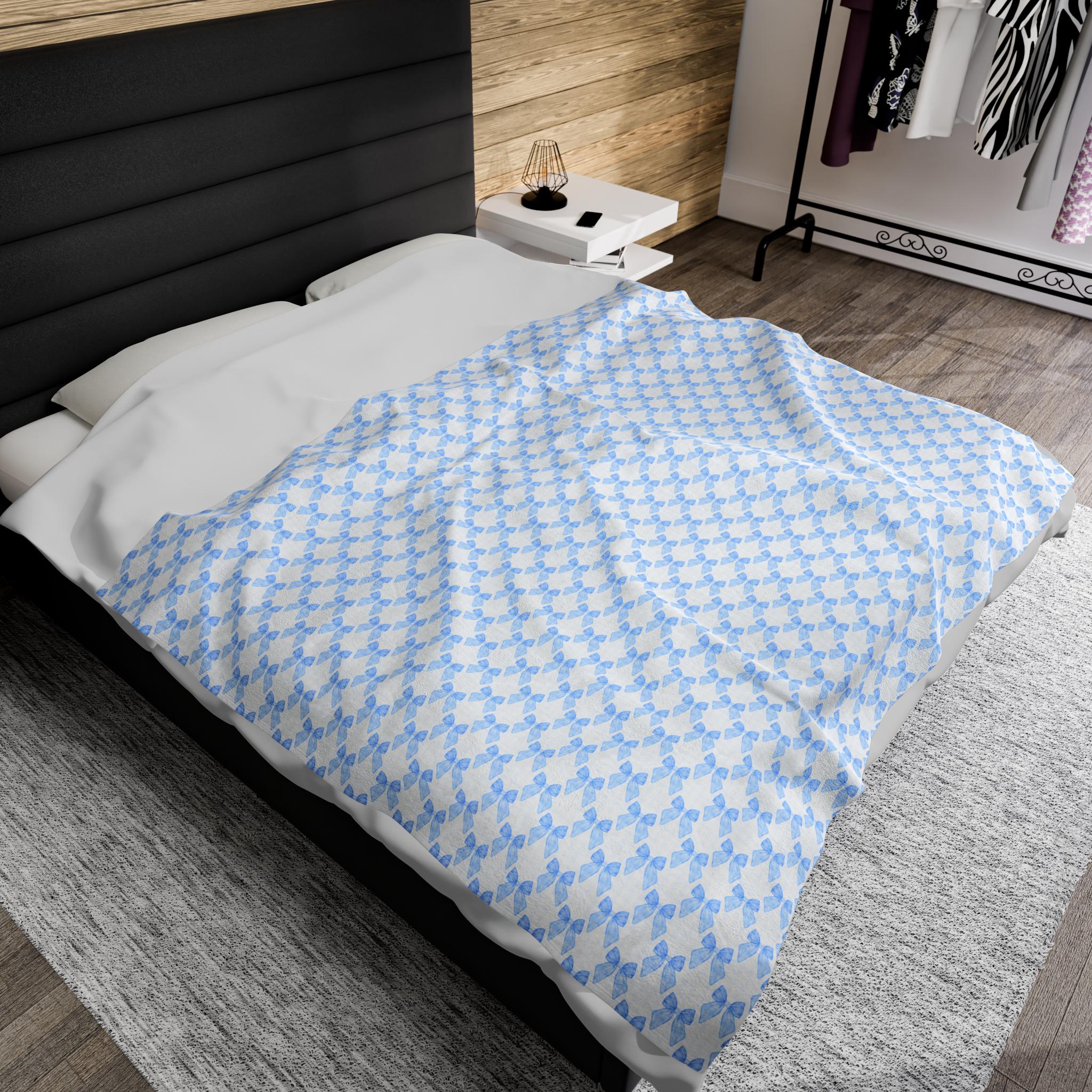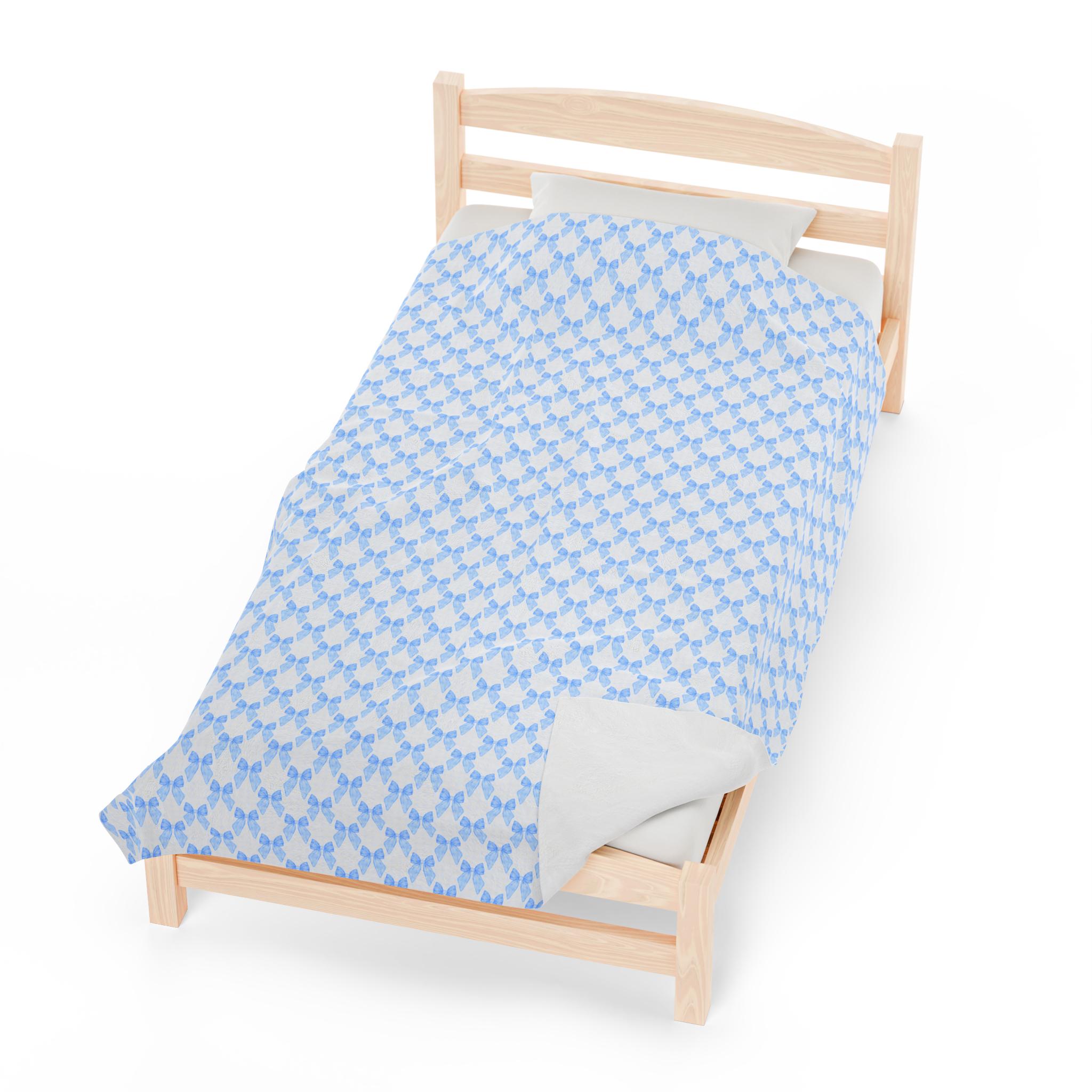 Coquette Blue Bow Blanket, Coquette Nursery Decor, Coquette Blanket for New Mom & Baby. This velveteen plush blanket provides a cozy and stylish addition to any nursery or new mom's collection. The design is perfect for those who appreciate a touch of elegance and charm in their baby's essentials. Ideal for baby showers, birthdays, and newborn celebrations.