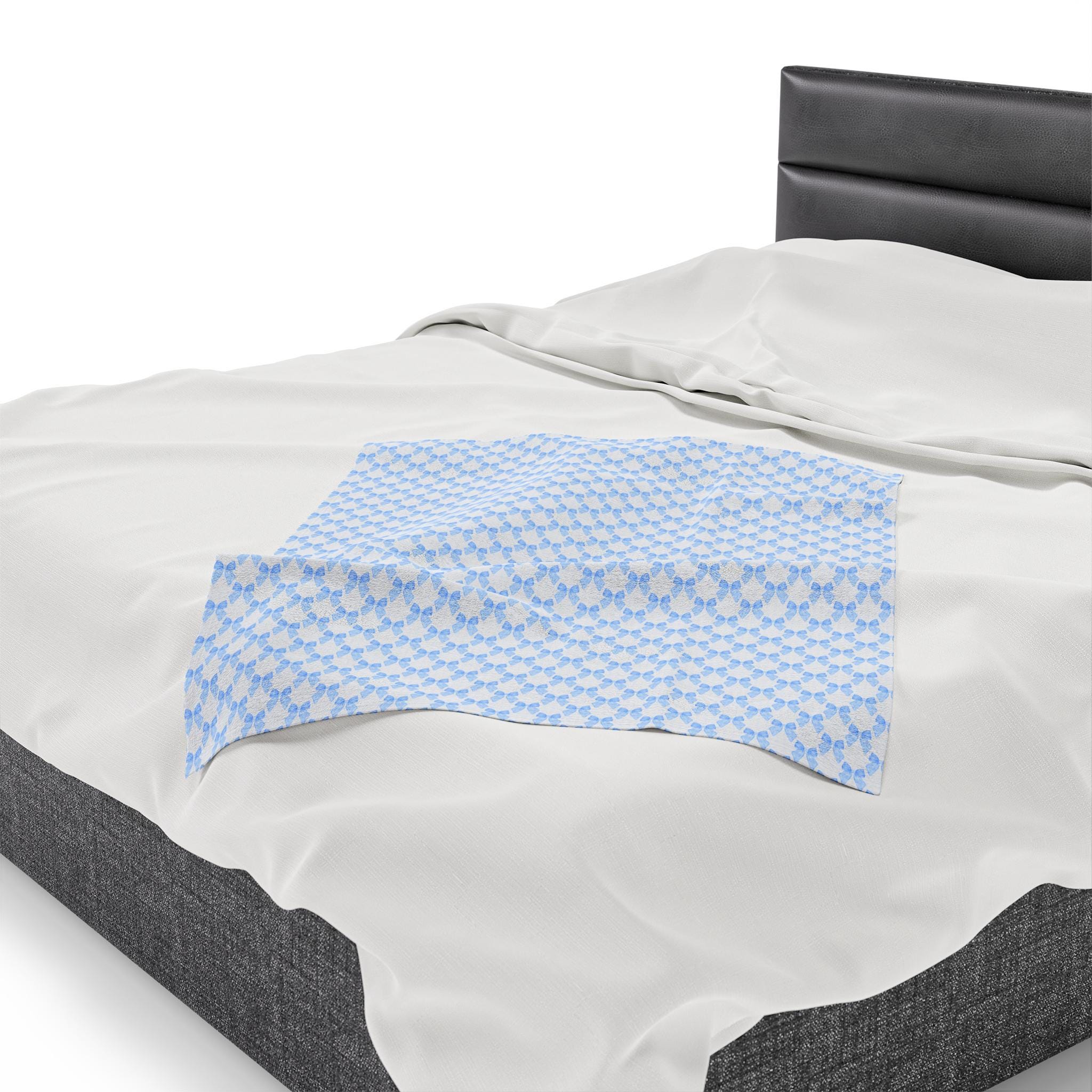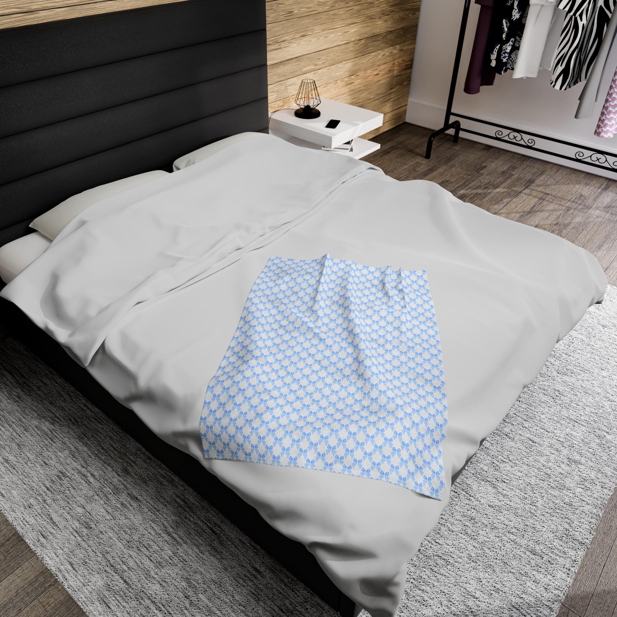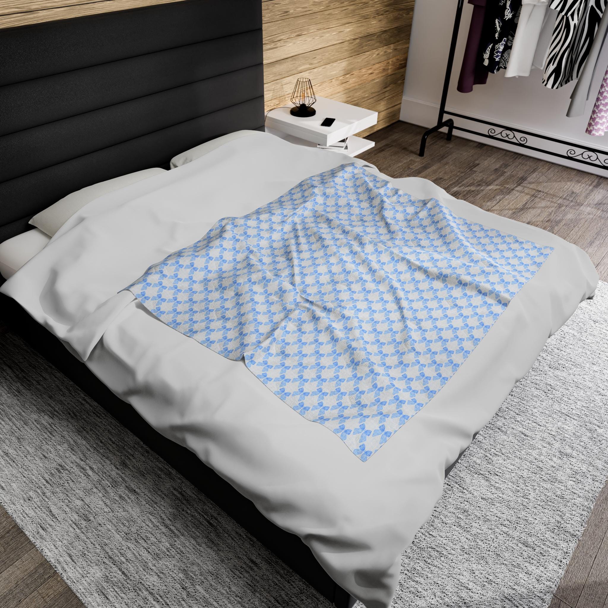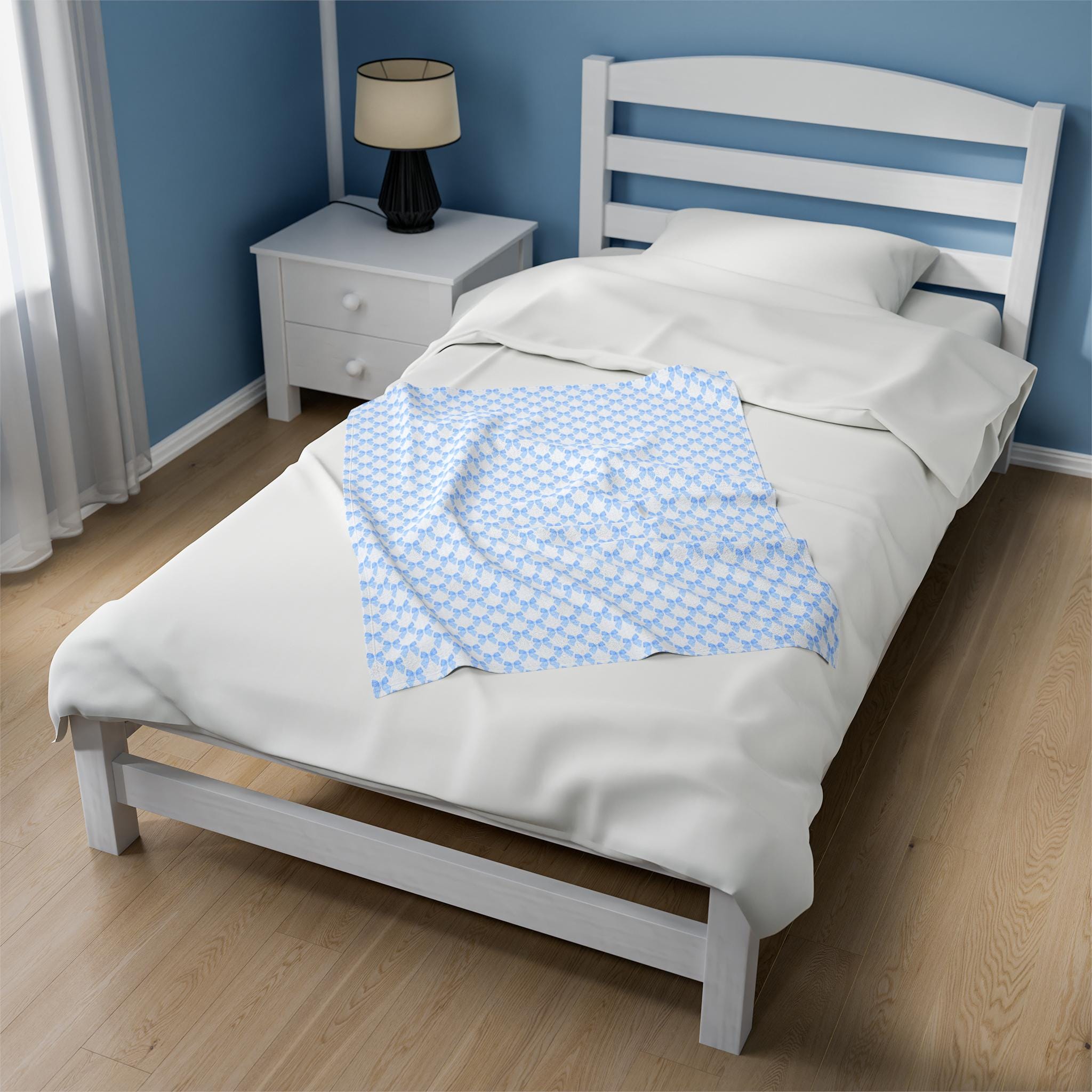 Coquette Blue Bow Blanket, Coquette Nursery Decor, Coquette Blanket for New Mom & Baby. This velveteen plush blanket provides a cozy and stylish addition to any nursery or new mom's collection. The design is perfect for those who appreciate a touch of elegance and charm in their baby's essentials. Ideal for baby showers, birthdays, and newborn celebrations.