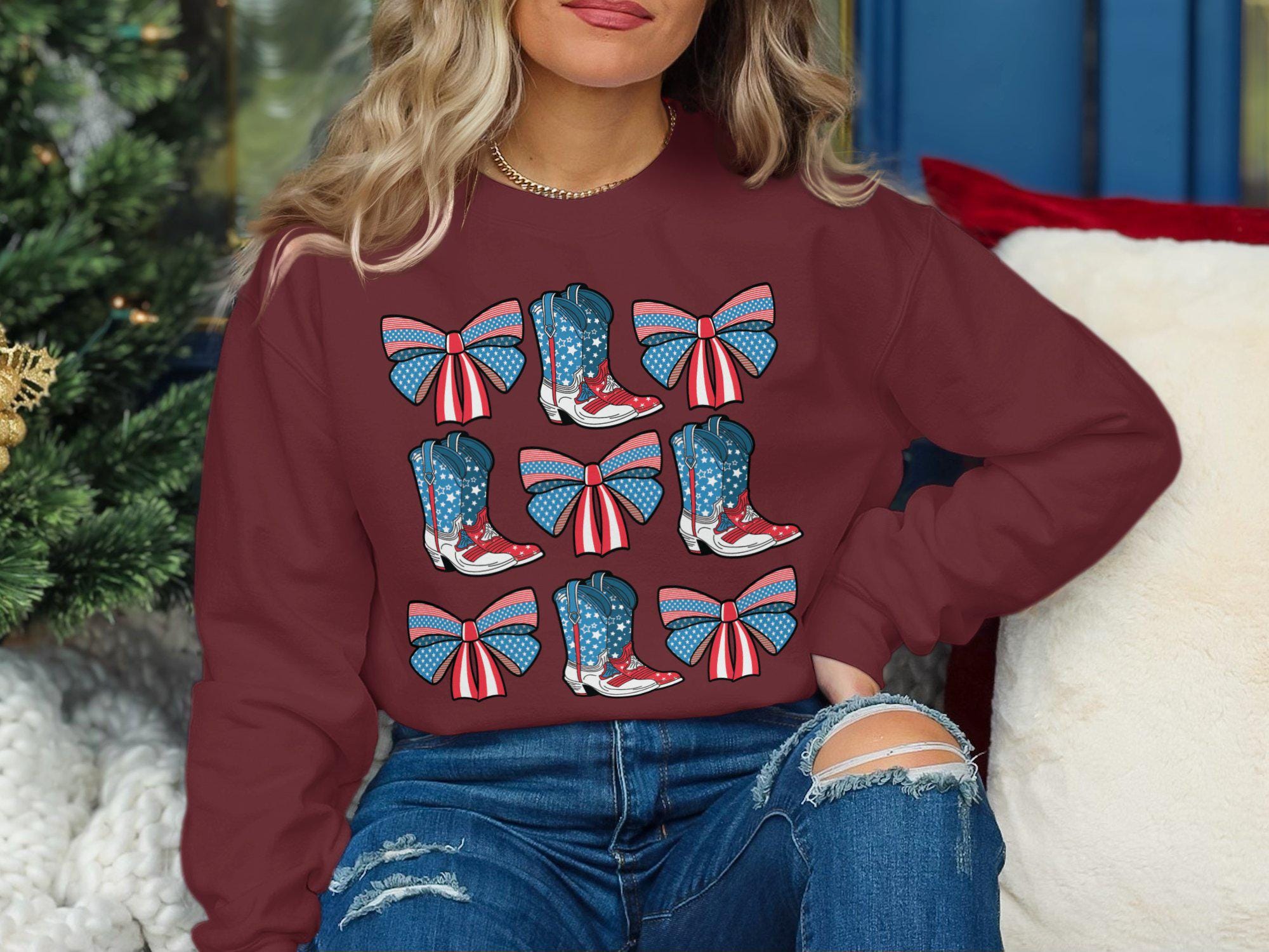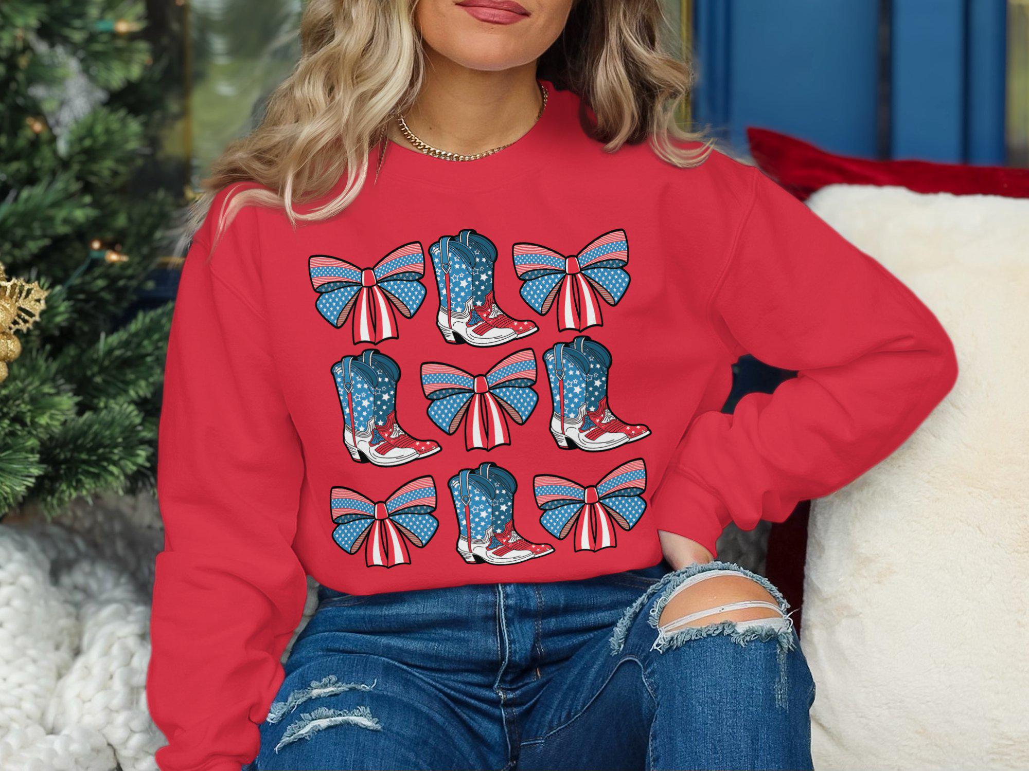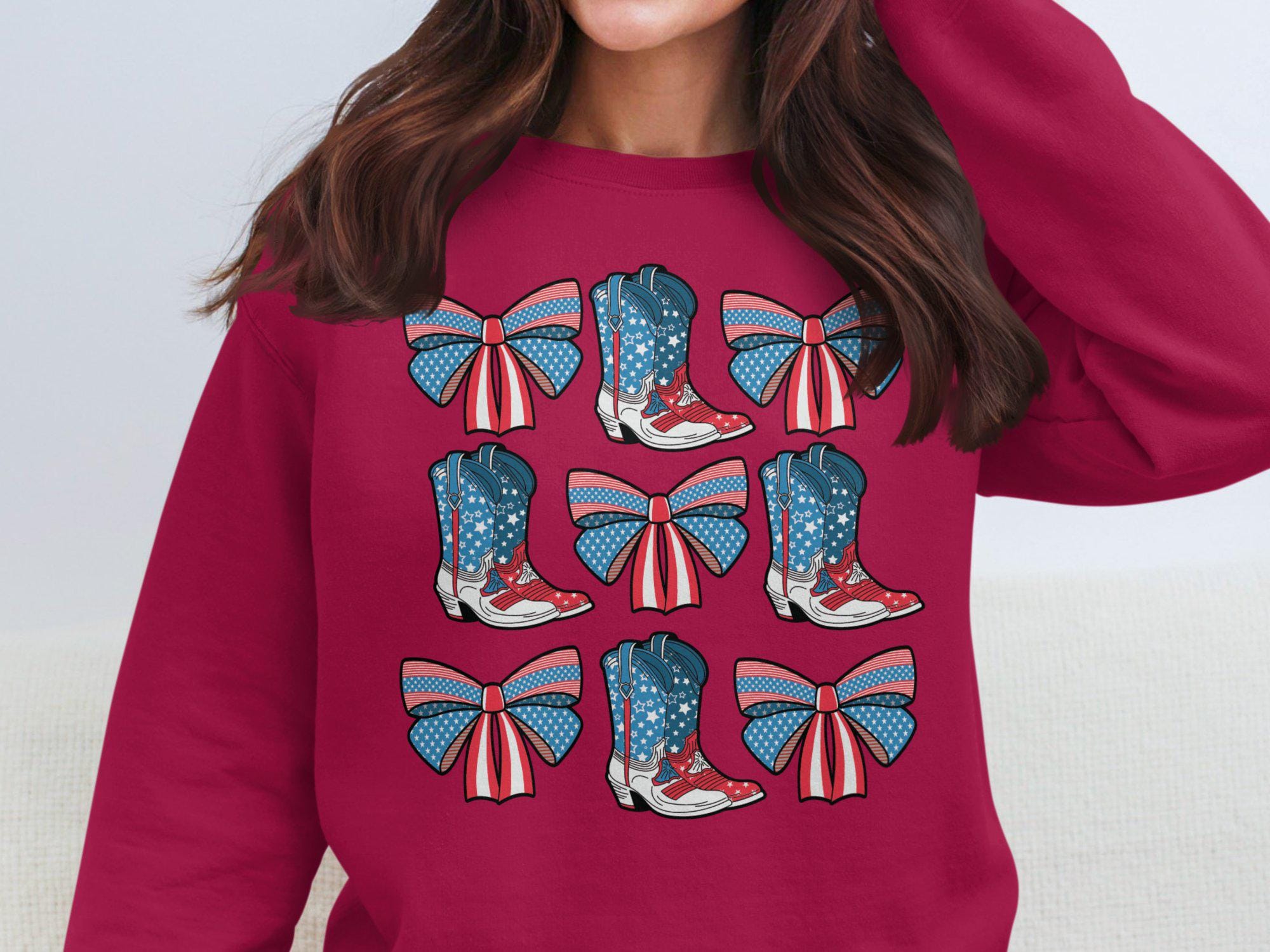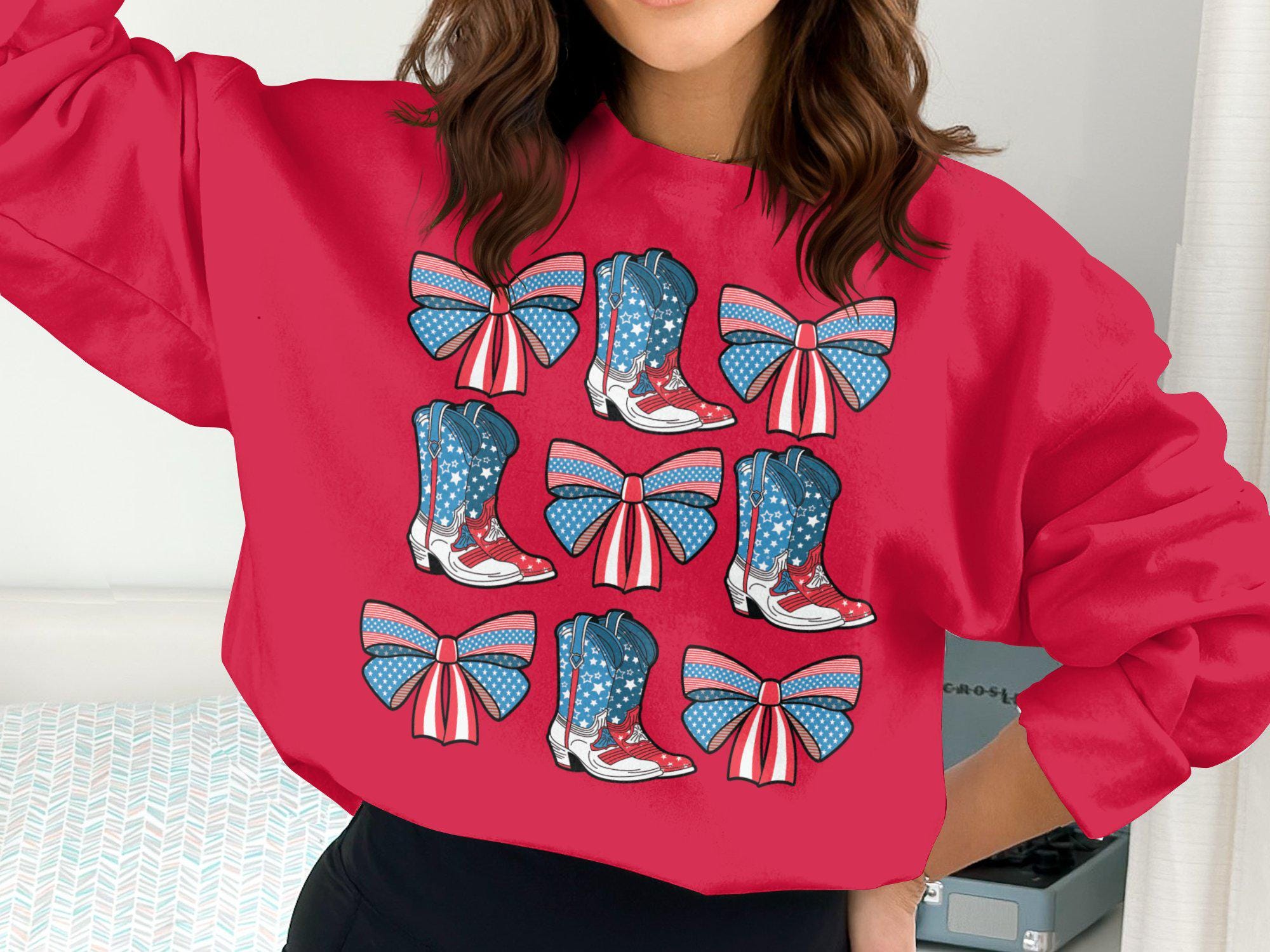 Celebrate your American pride with our Patriotic Cowboy Boots Sweatshirt. This cozy sweatshirt features a unique design of cowboy boots adorned with the stars and stripes alongside patriotic bows, making it perfect for 4th of July celebrations, western-themed parties, or simply showing off your love for the USA. Ideal for fans of country style and American-themed apparel. It's a great addition to your wardrobe for year-round patriotism.
