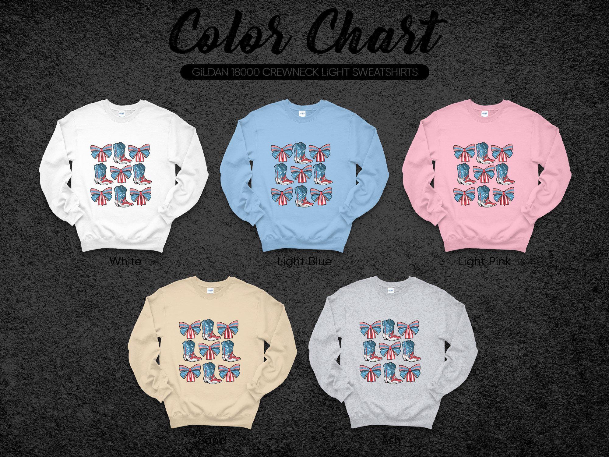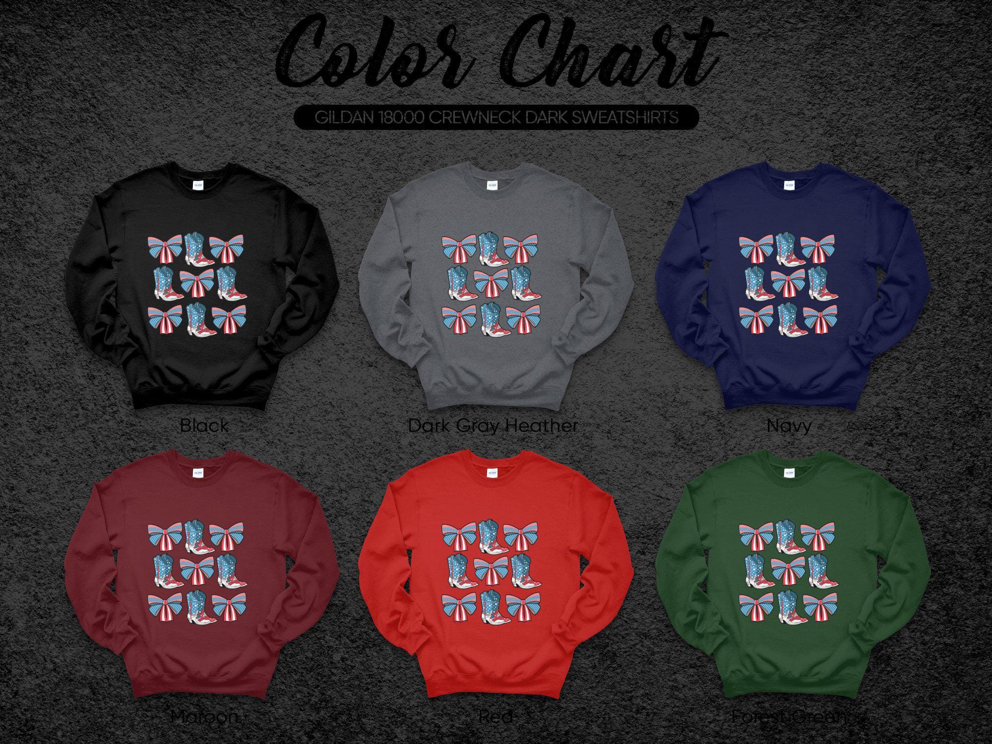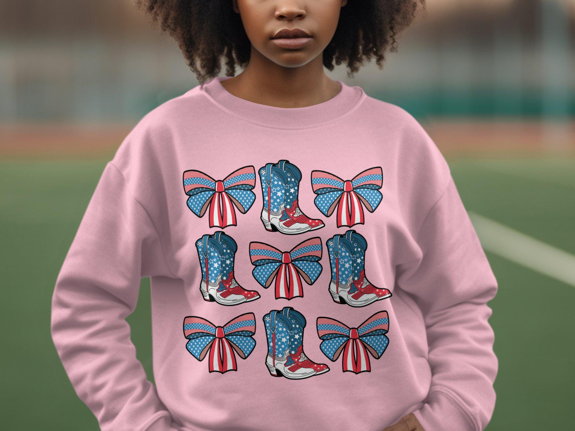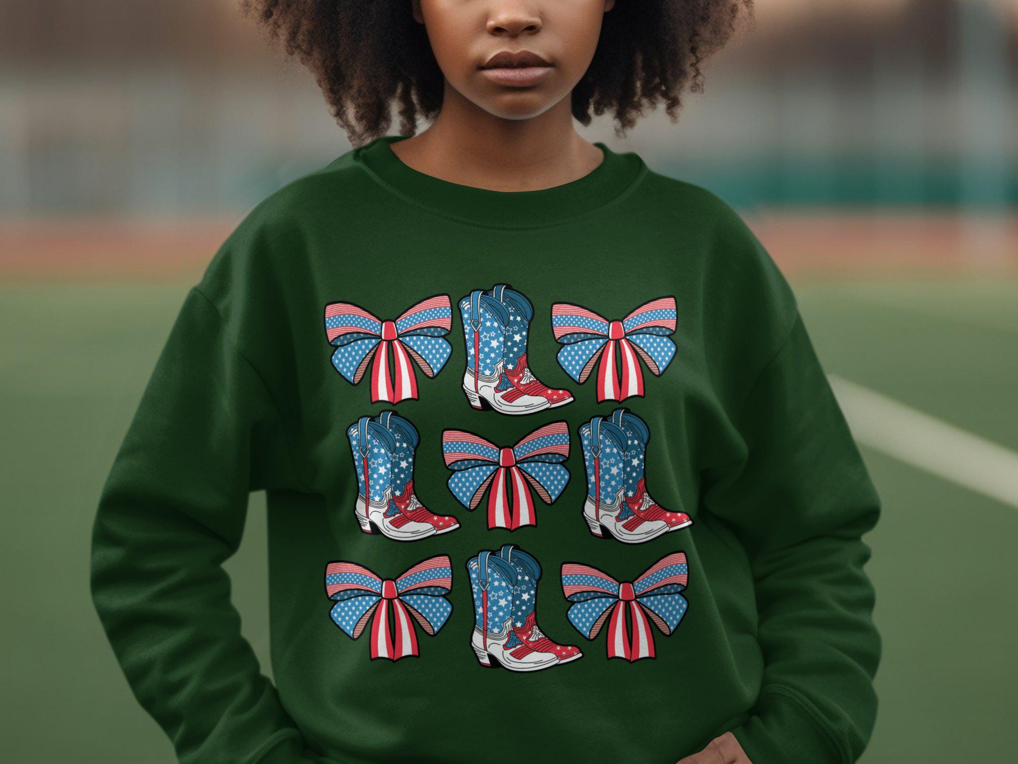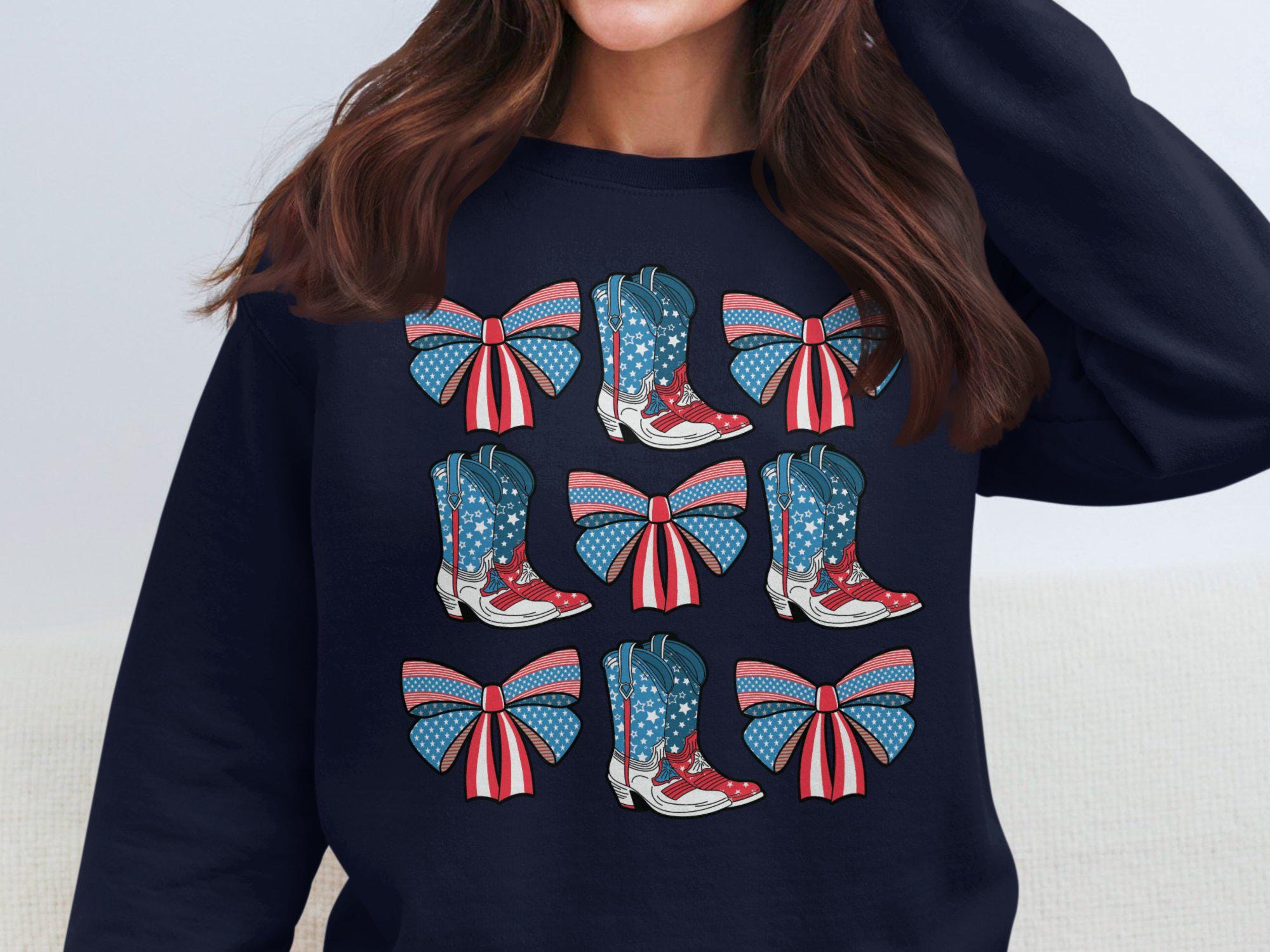 Celebrate your American pride with our Patriotic Cowboy Boots Sweatshirt. This cozy sweatshirt features a unique design of cowboy boots adorned with the stars and stripes alongside patriotic bows, making it perfect for 4th of July celebrations, western-themed parties, or simply showing off your love for the USA. Ideal for fans of country style and American-themed apparel. It's a great addition to your wardrobe for year-round patriotism.