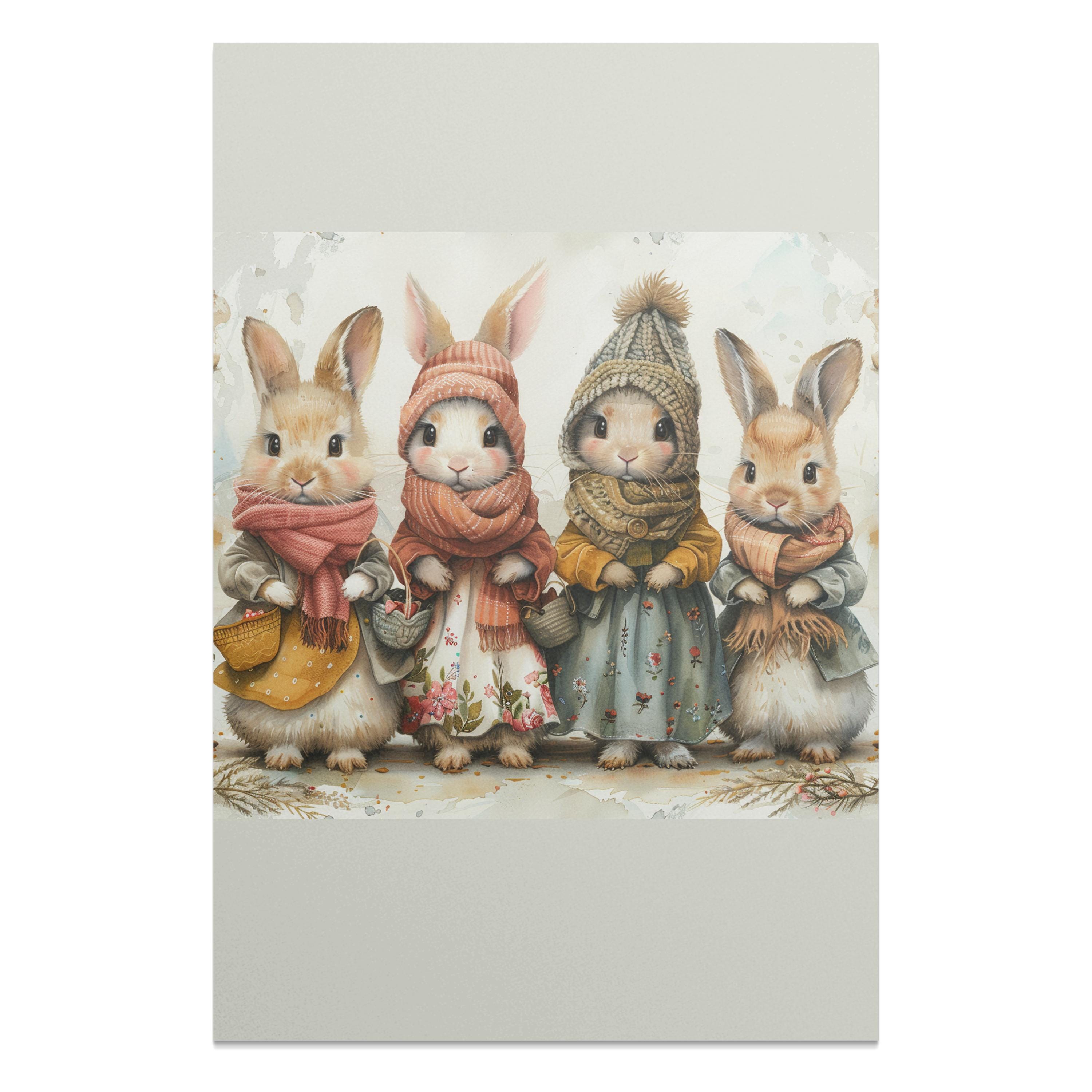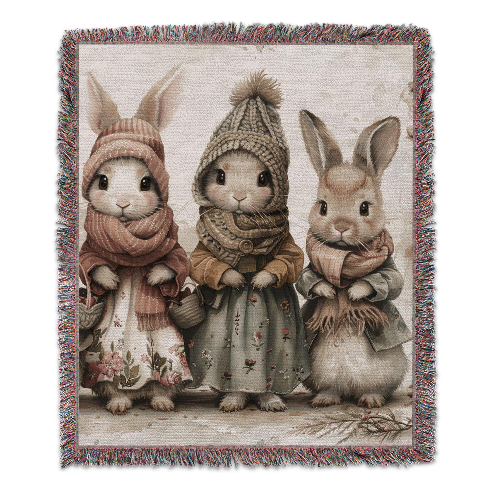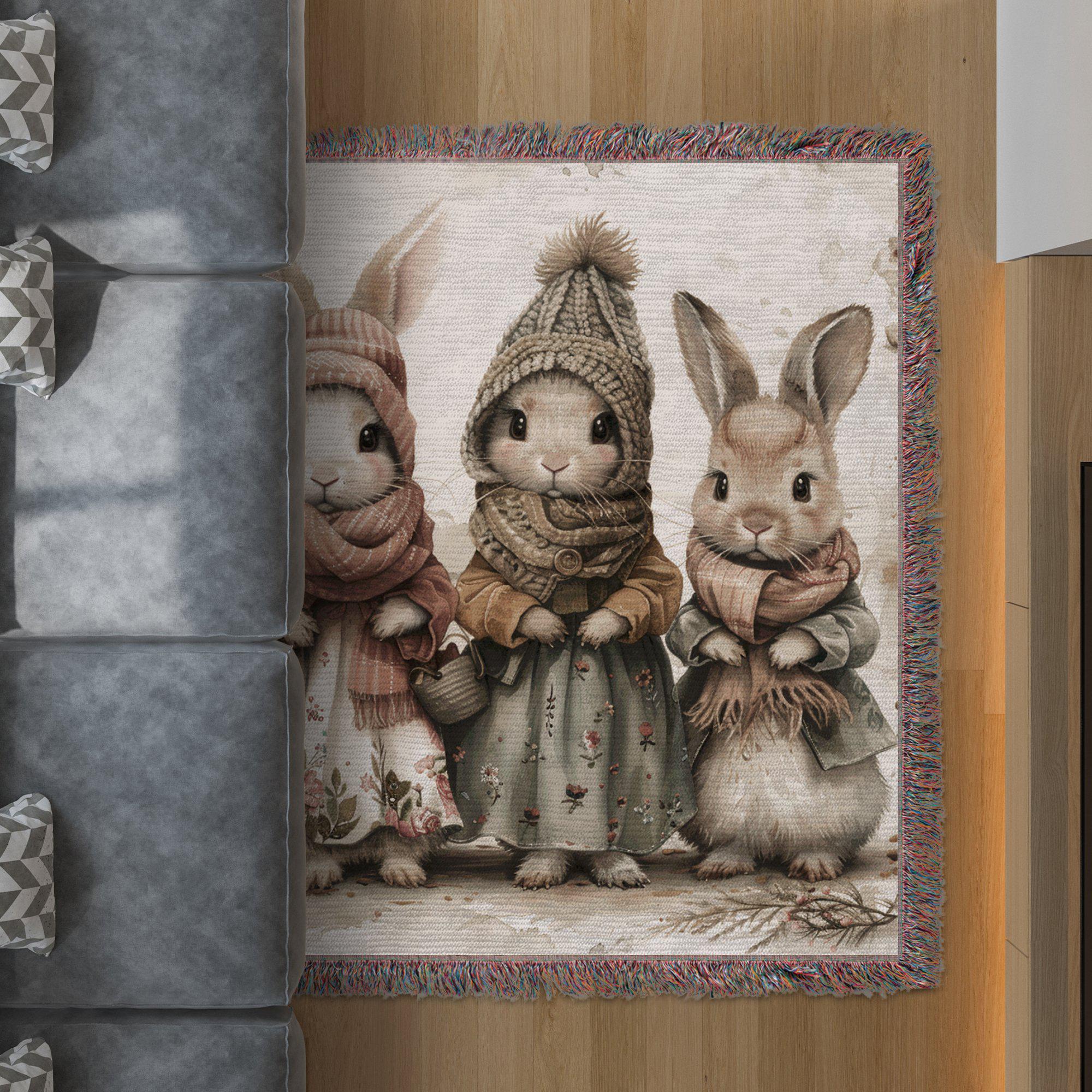 This cute bunny blanket features adorable rabbits dressed in cozy outfits. Perfect for adding charm to any room, this blanket also makes an excellent gift. Ideal for kids' rooms, it is soft, warm, and beautifully designed. Additional matching options include a woven pillow, poster print, and candle.