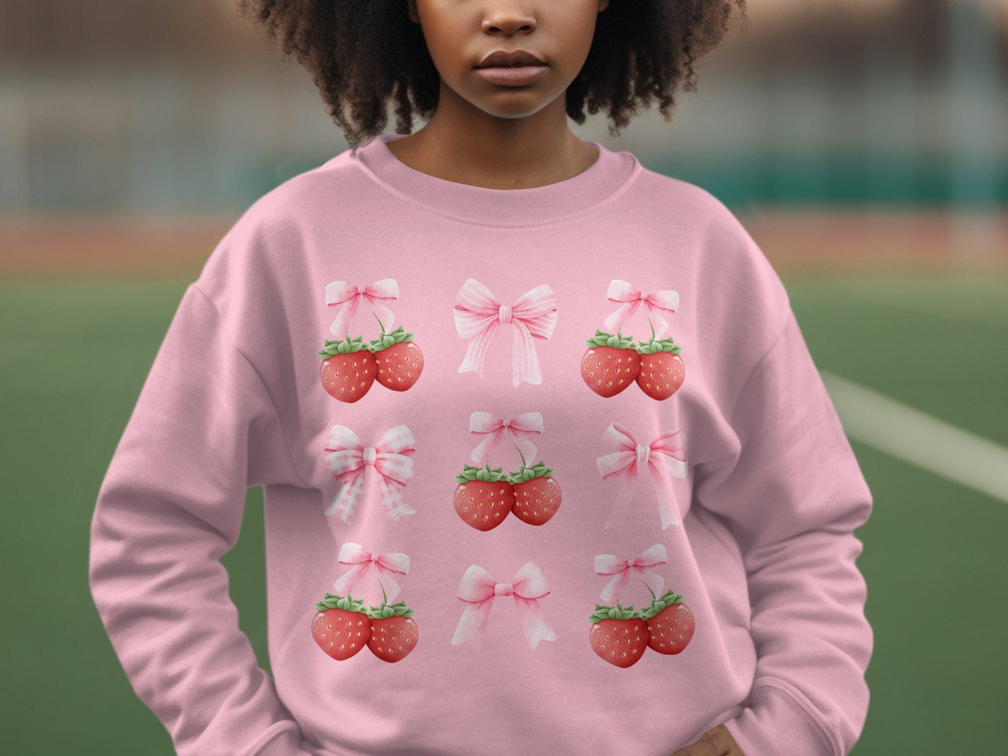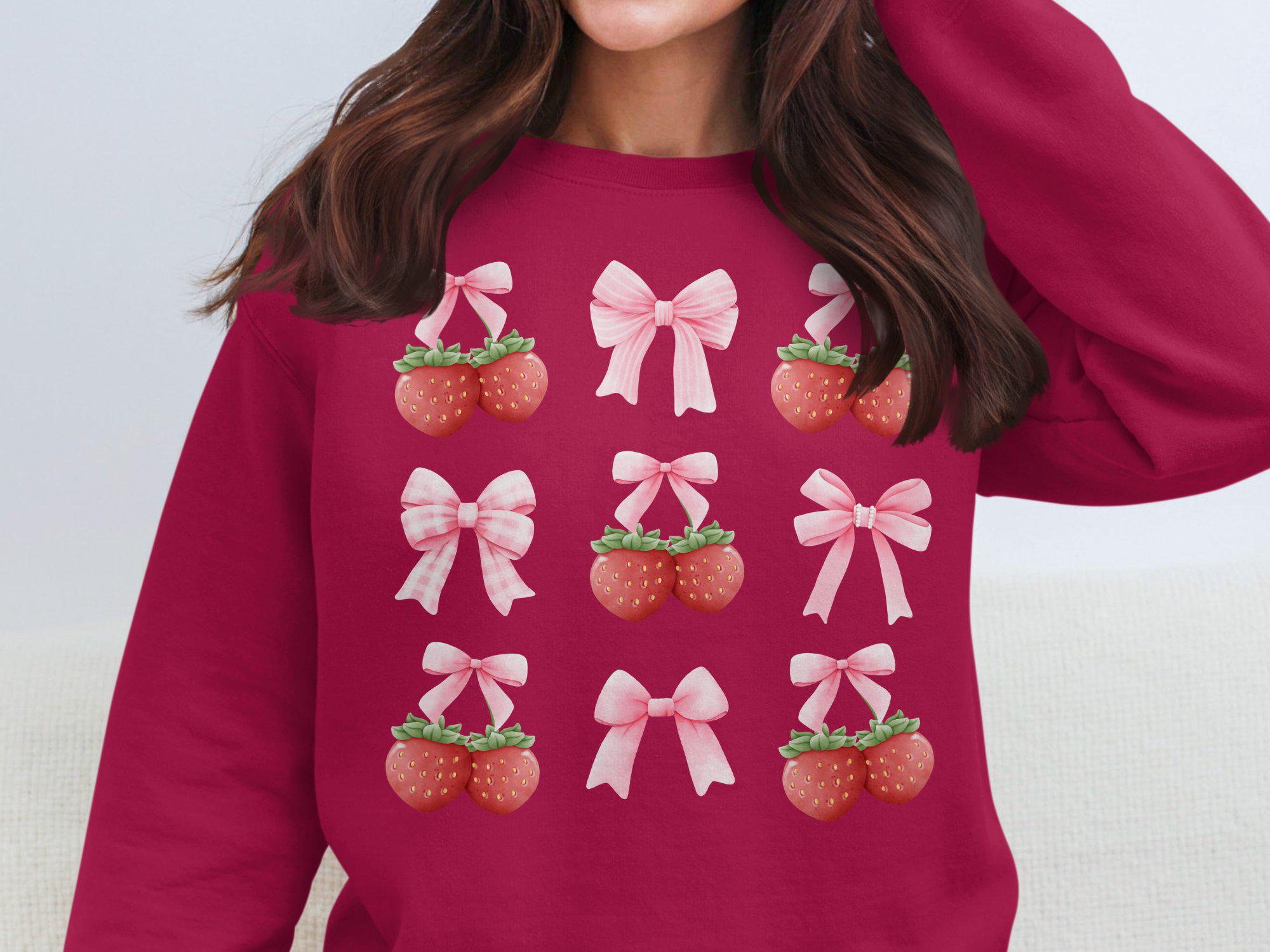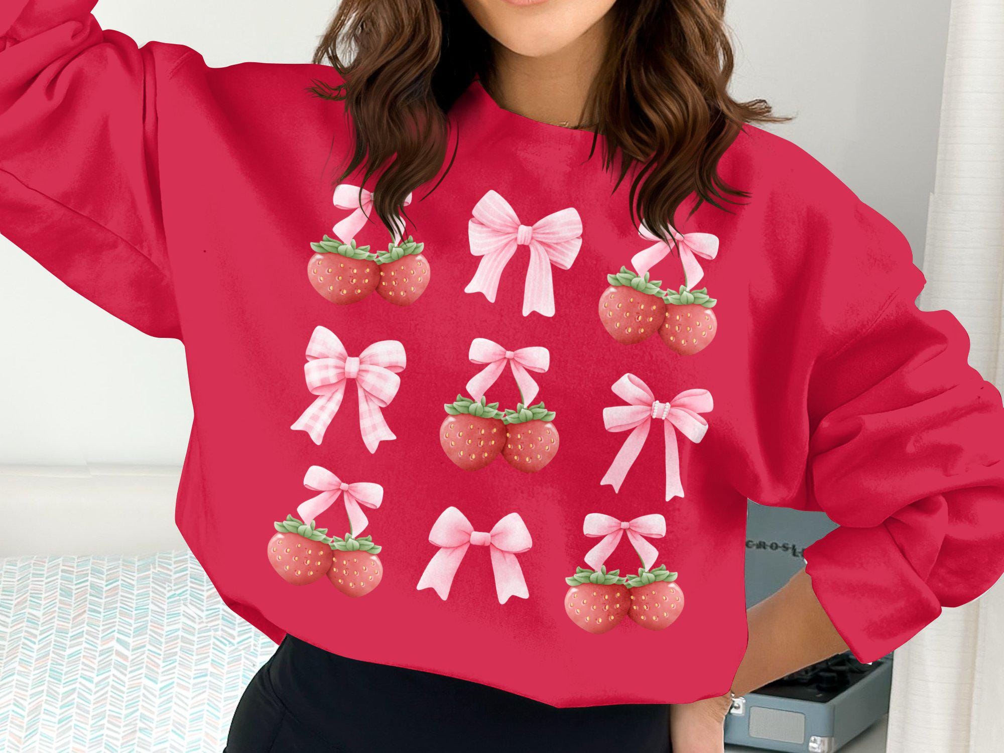 This adorable strawberry and pink bow print sweatshirt brings a touch of kawaii fashion to your casual wardrobe. Ideal for lounging or stepping out, this cozy sweater sports a delightful graphic design, perfect for adding a playful and aesthetic vibe to any outfit. Embrace cute and comfortable style with this unique and charming piece!