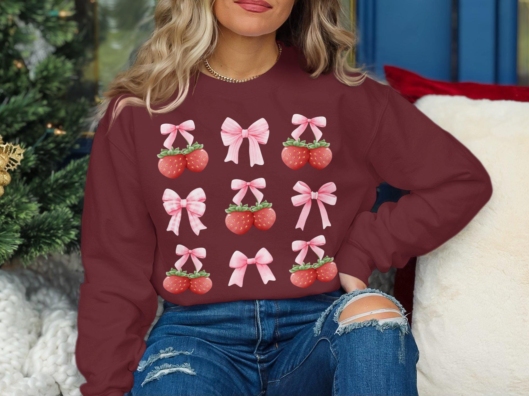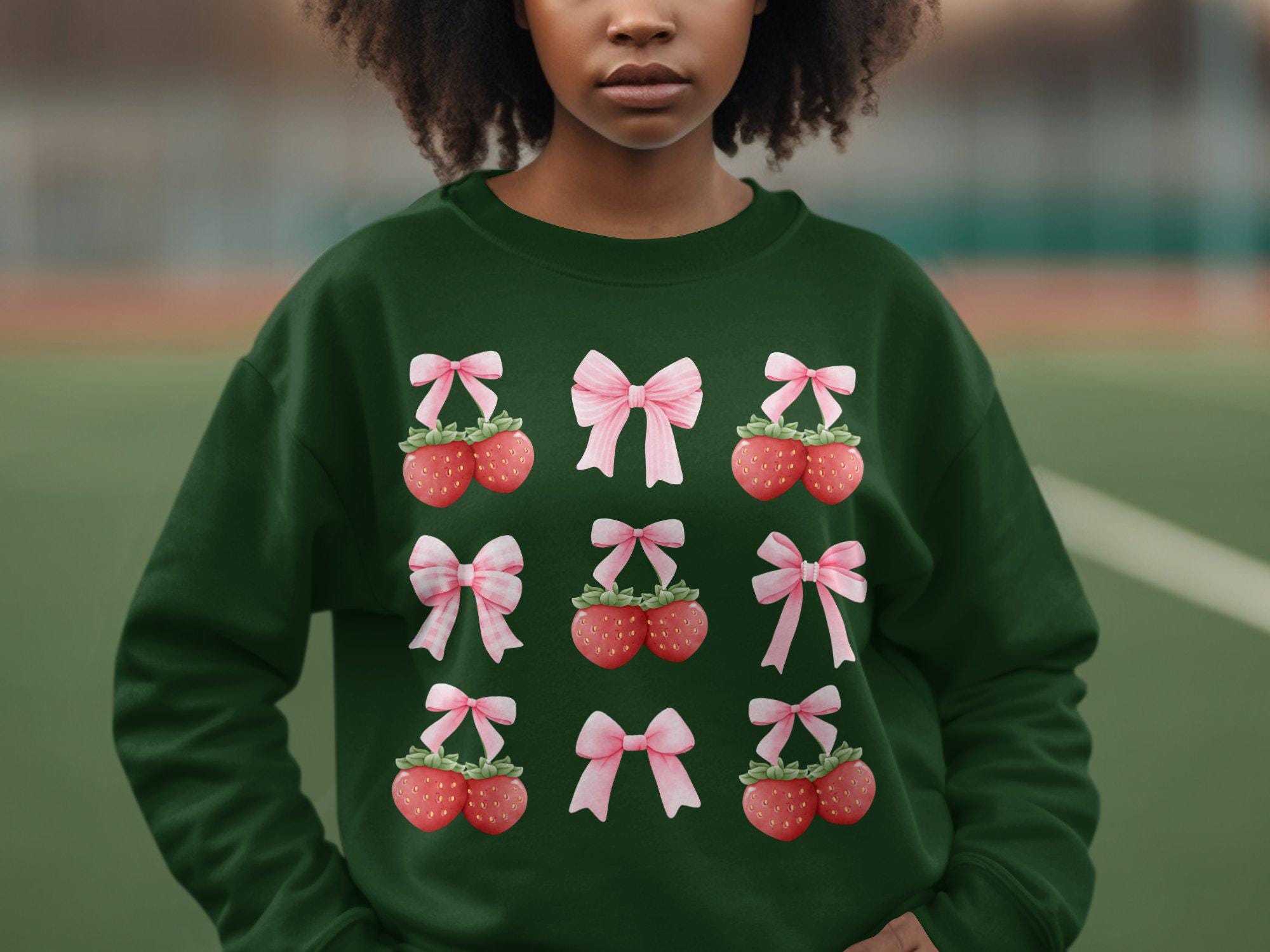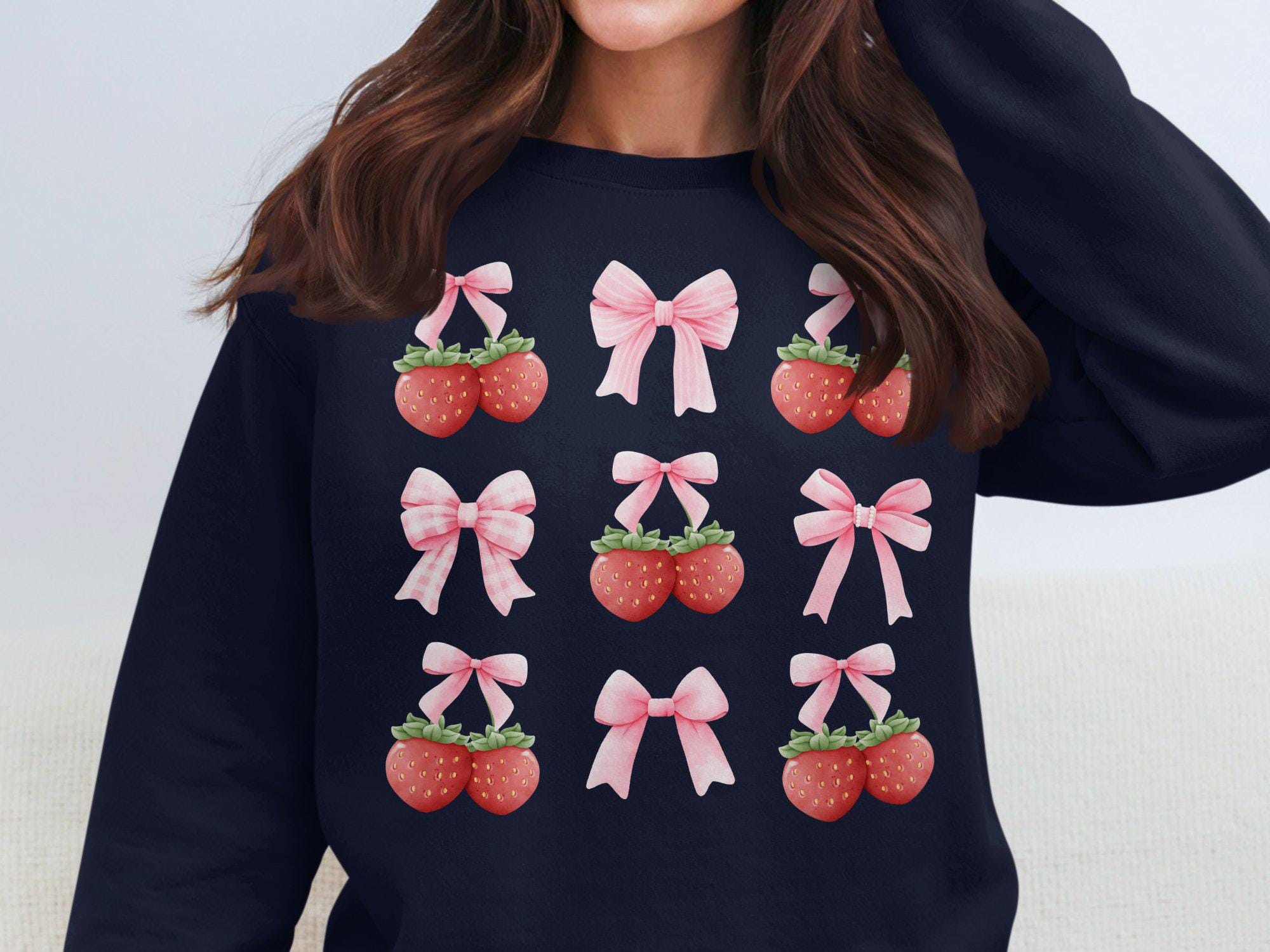 This adorable strawberry and pink bow print sweatshirt brings a touch of kawaii fashion to your casual wardrobe. Ideal for lounging or stepping out, this cozy sweater sports a delightful graphic design, perfect for adding a playful and aesthetic vibe to any outfit. Embrace cute and comfortable style with this unique and charming piece!