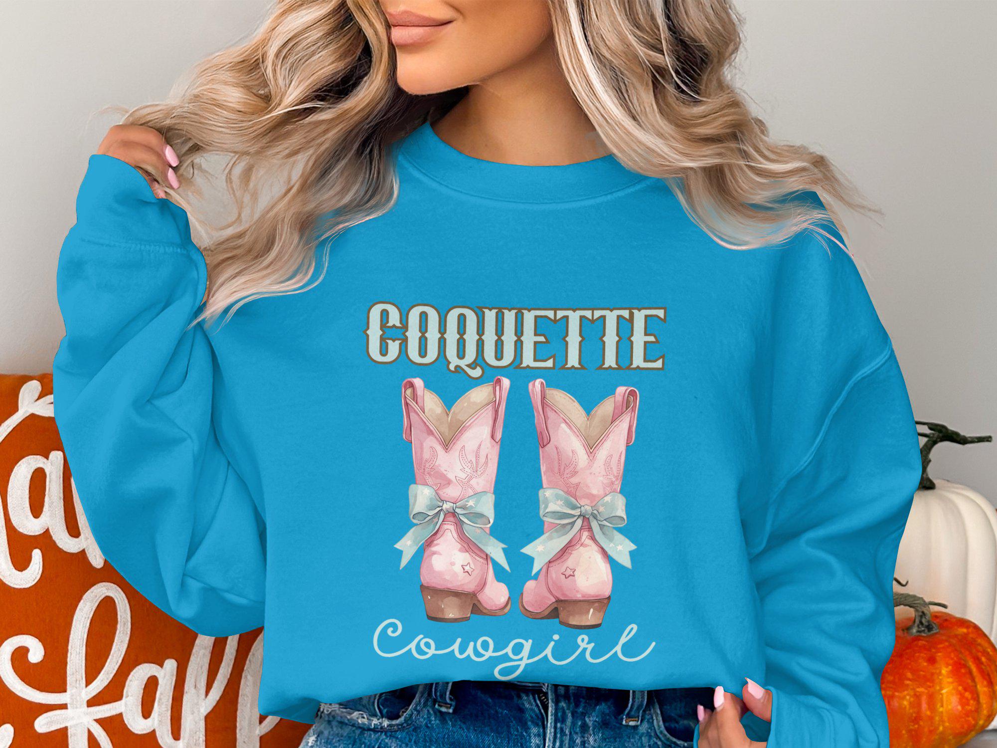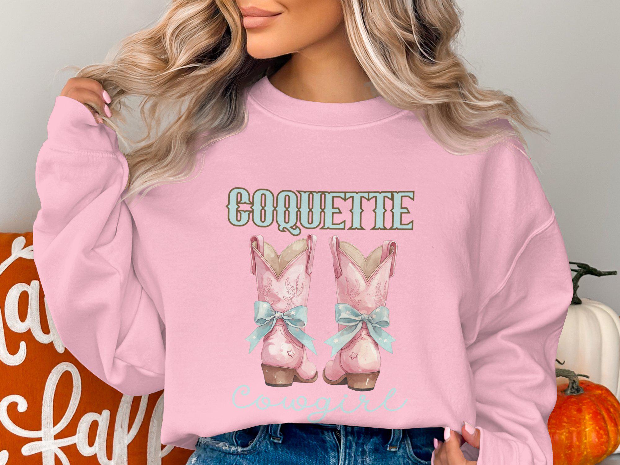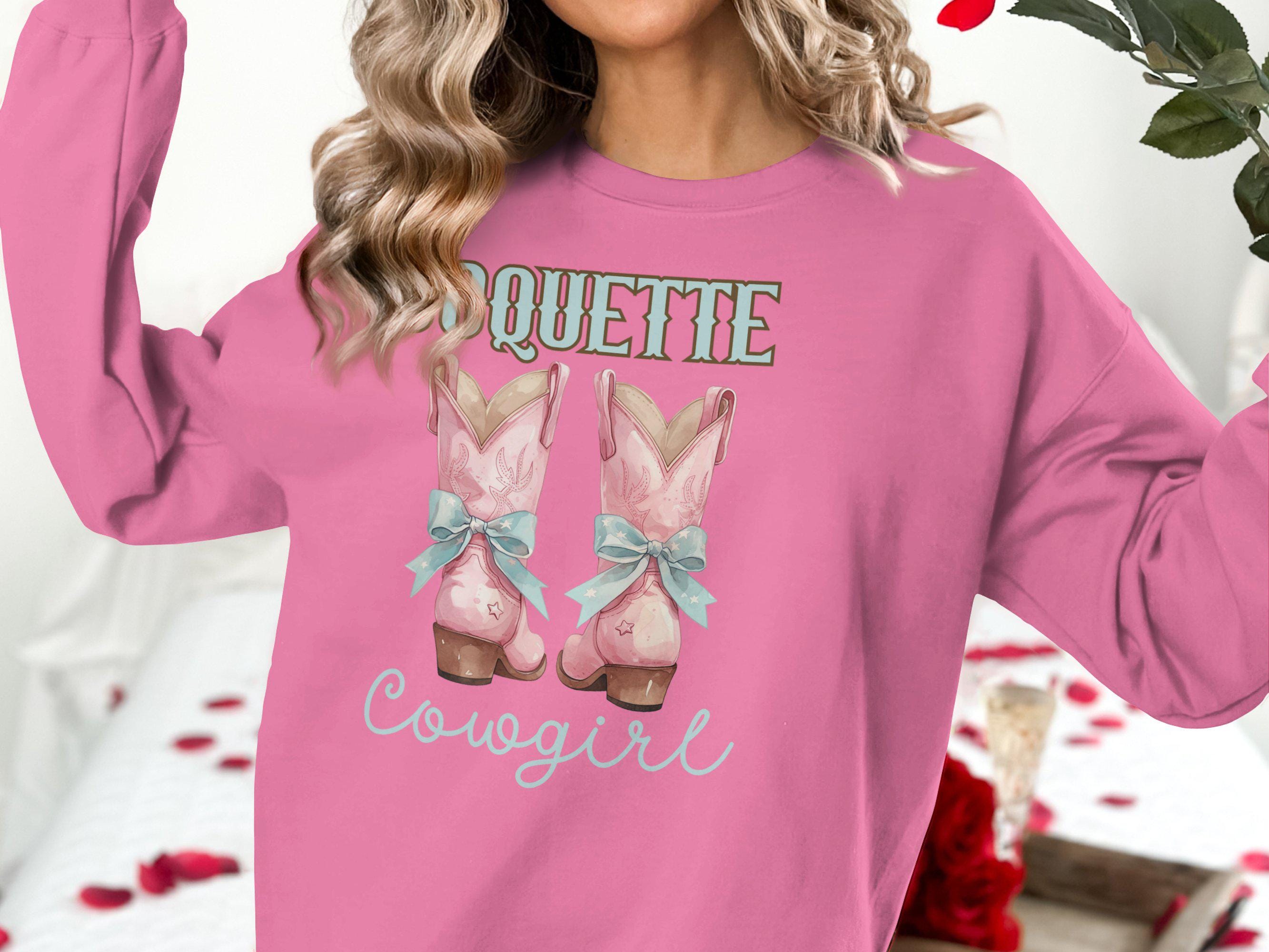 Embrace your inner cowgirl with this Coquette Cowgirl Sweatshirt! Featuring a stylish design of cute pink cowgirl boots with blue bows, it's perfect for country western fashion lovers. This trendy rodeo fashion sweatshirt is ideal for adding a touch of vintage style to your wardrobe. Whether you are heading to a country concert or just love the unique look, this sweatshirt is a fashionable choice. Stand out with this charming and comfortable piece that is sure to draw compliments.