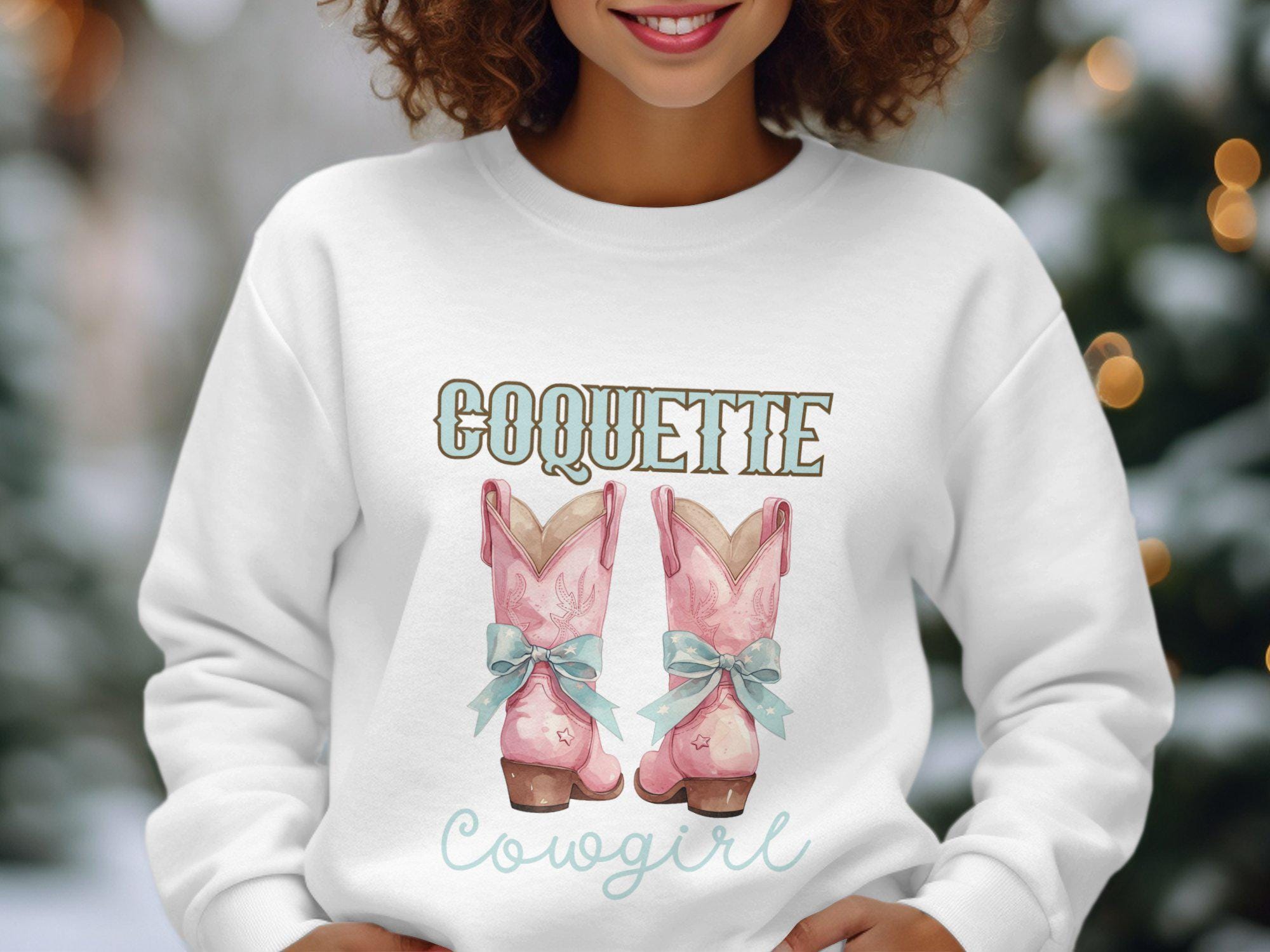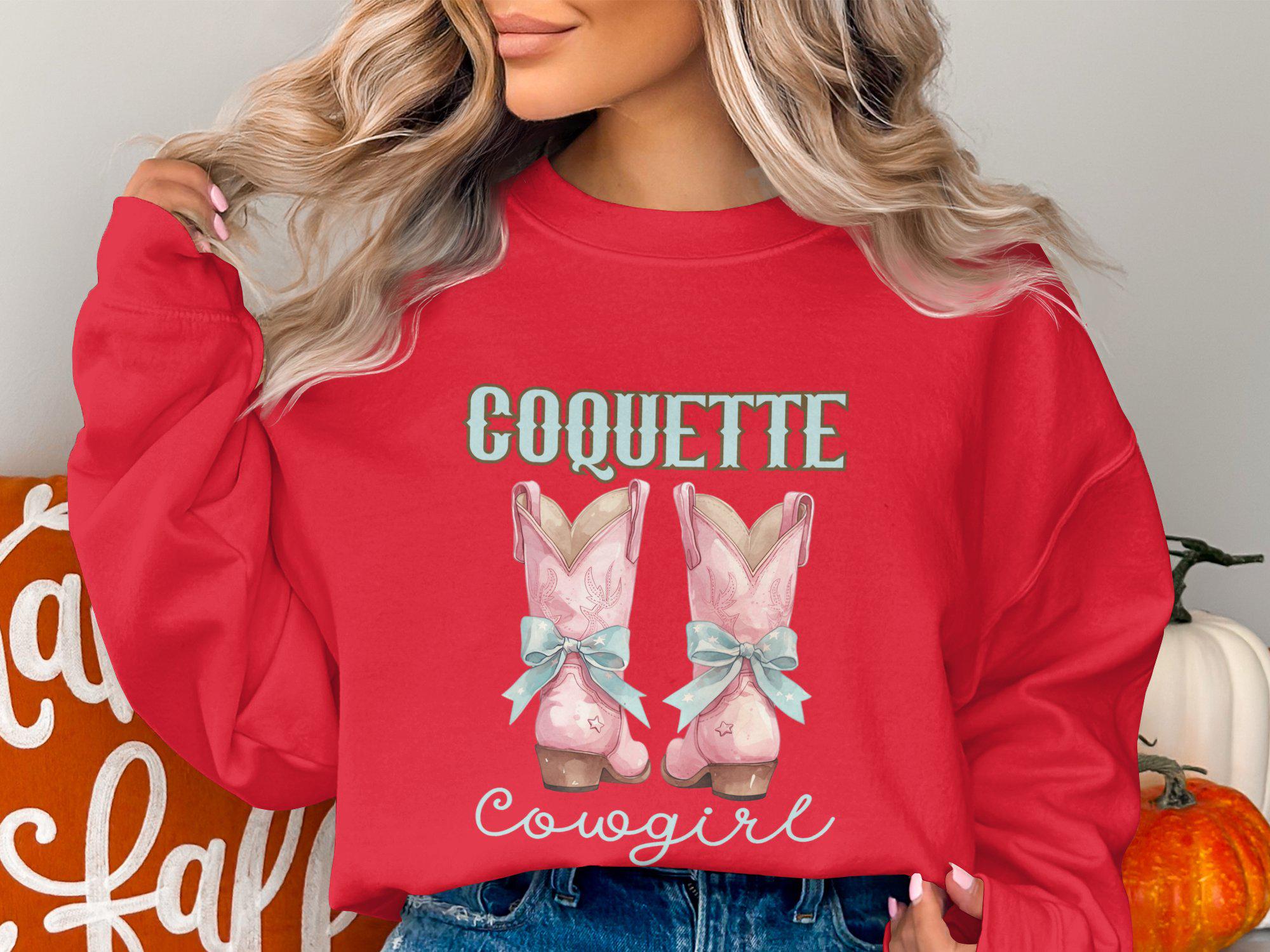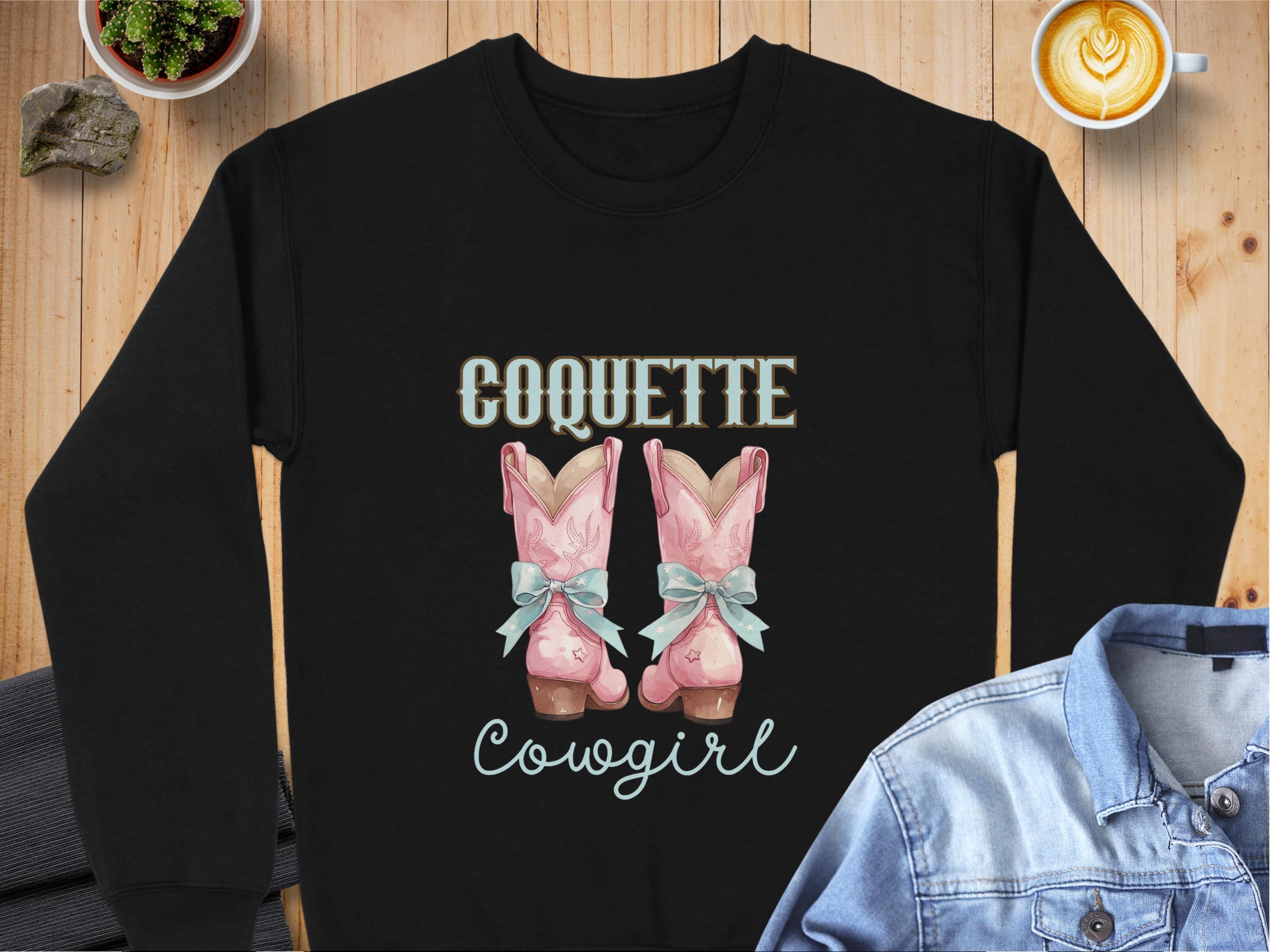 Embrace your inner cowgirl with this Coquette Cowgirl Sweatshirt! Featuring a stylish design of cute pink cowgirl boots with blue bows, it's perfect for country western fashion lovers. This trendy rodeo fashion sweatshirt is ideal for adding a touch of vintage style to your wardrobe. Whether you are heading to a country concert or just love the unique look, this sweatshirt is a fashionable choice. Stand out with this charming and comfortable piece that is sure to draw compliments.