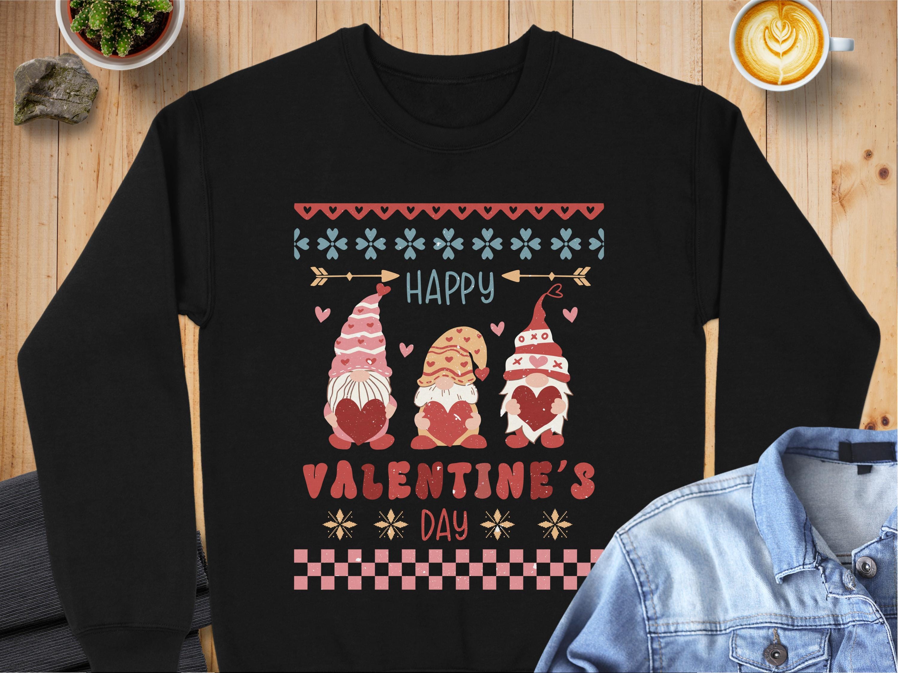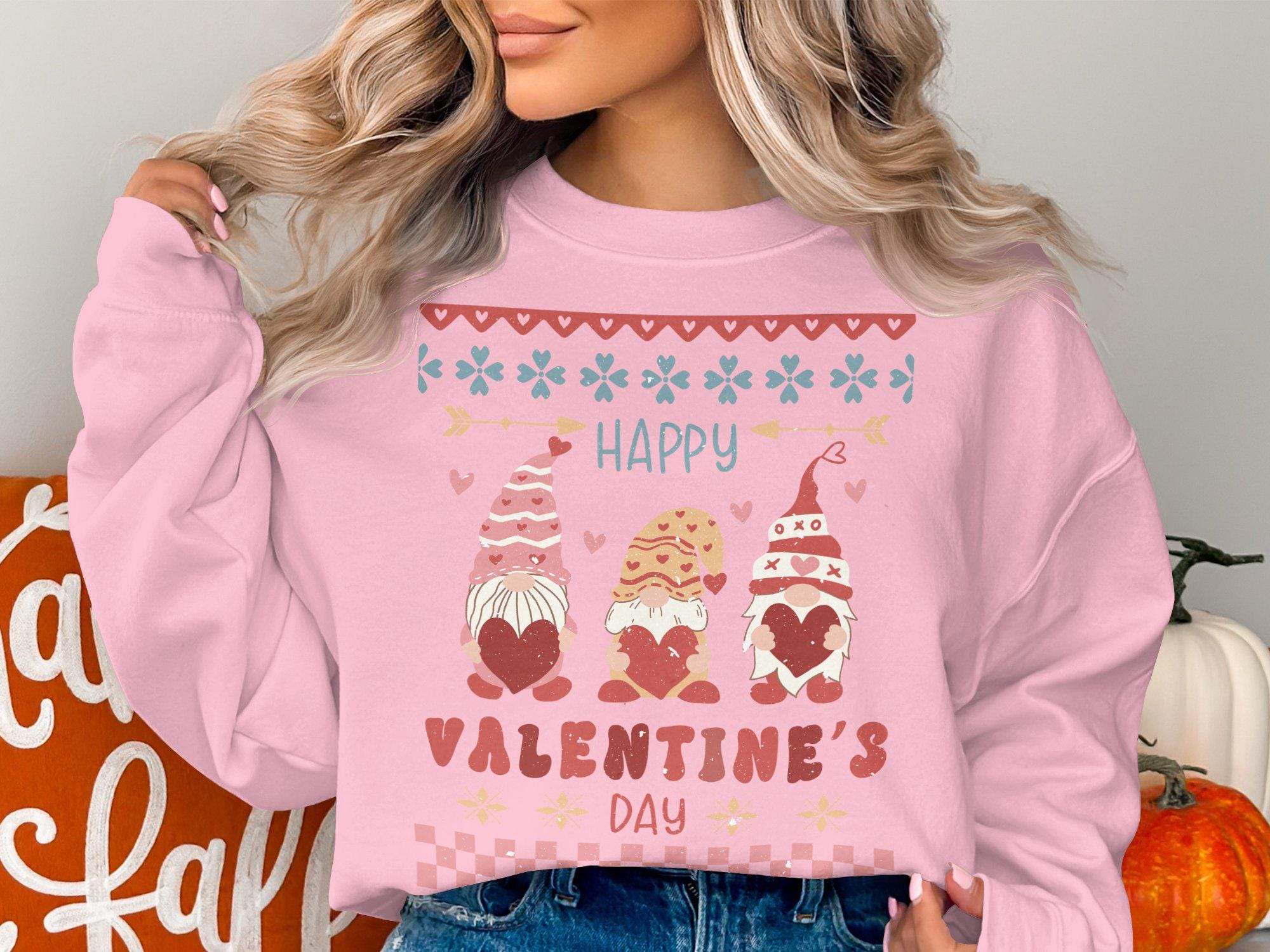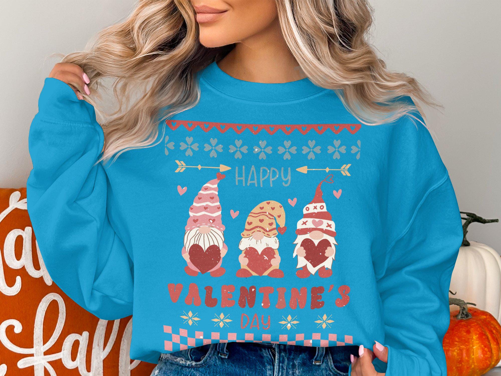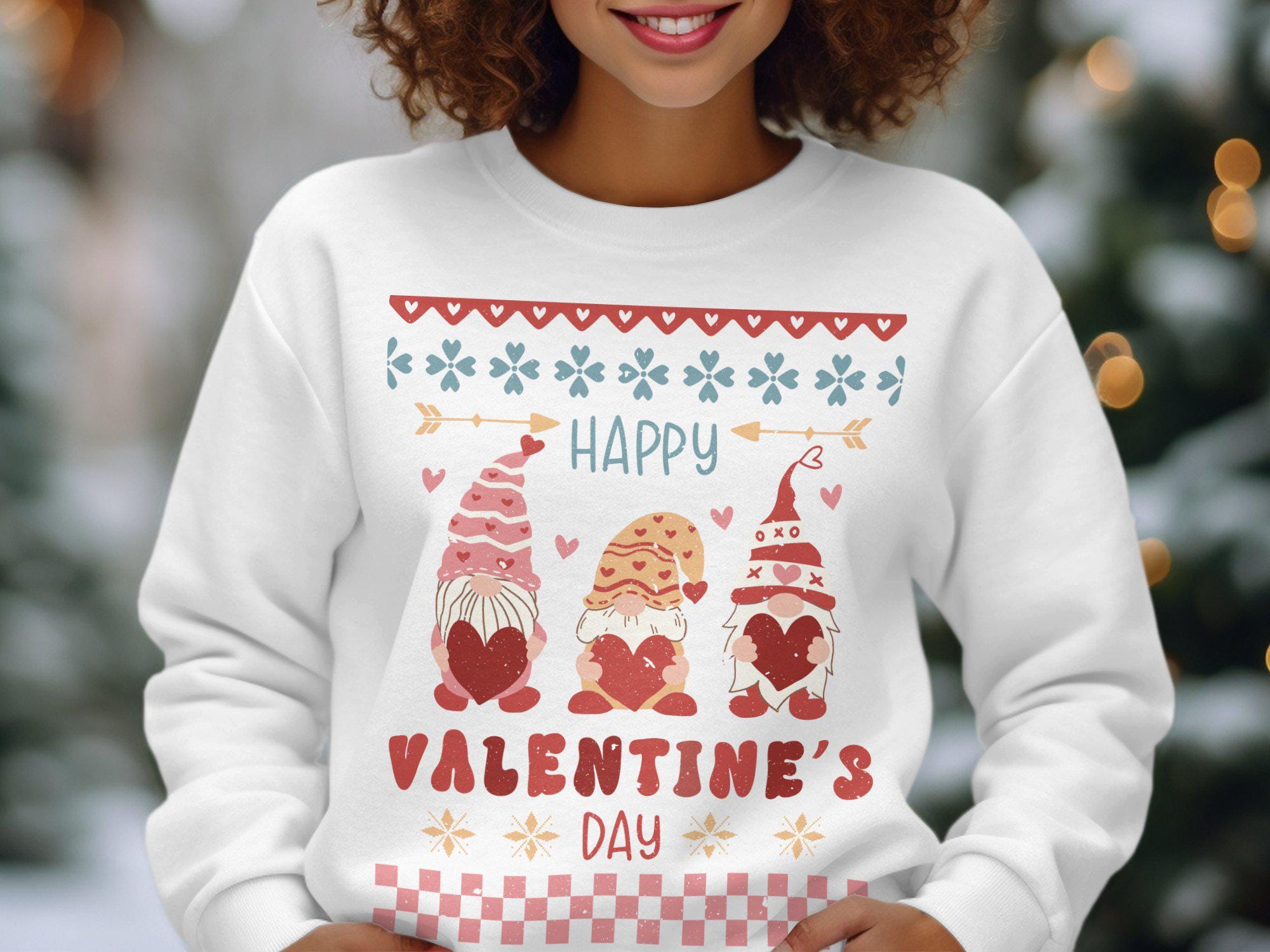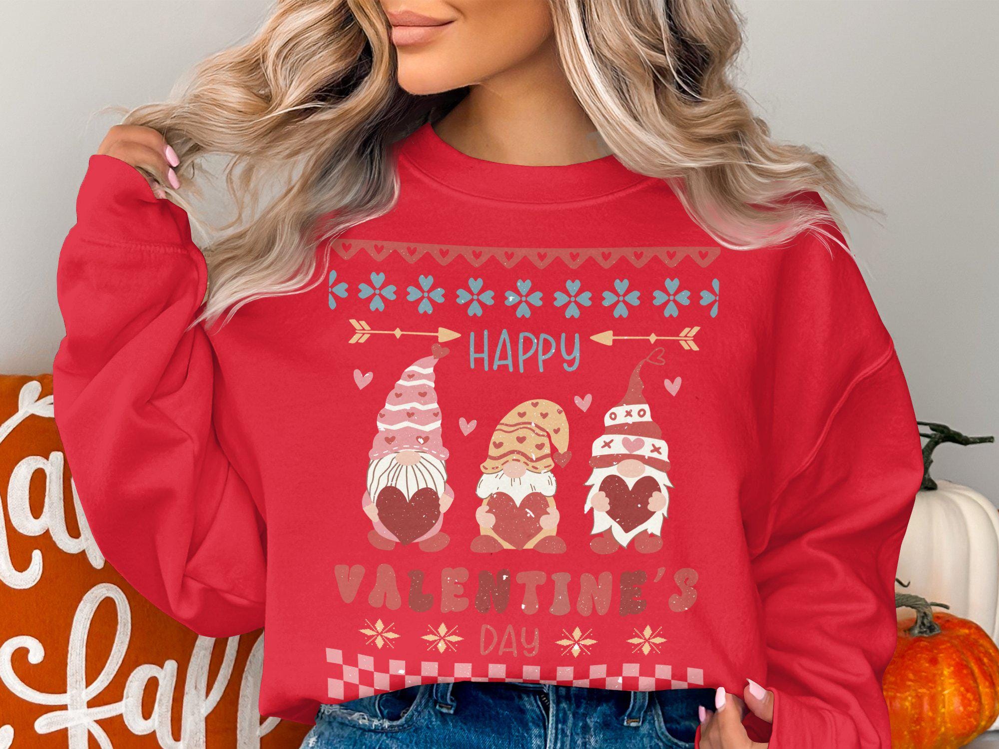 This adorable Valentines Day gnomes sweatshirt features three cute gnomes holding hearts, making it the perfect festive attire for spreading love and joy. Whether you're celebrating with friends, family, or that special someone, this cozy pullover adds a whimsical touch to your Valentines Day outfit. Embrace the season of love with this charming and comfortable sweatshirt, ideal for casual wear or as a thoughtful gift.