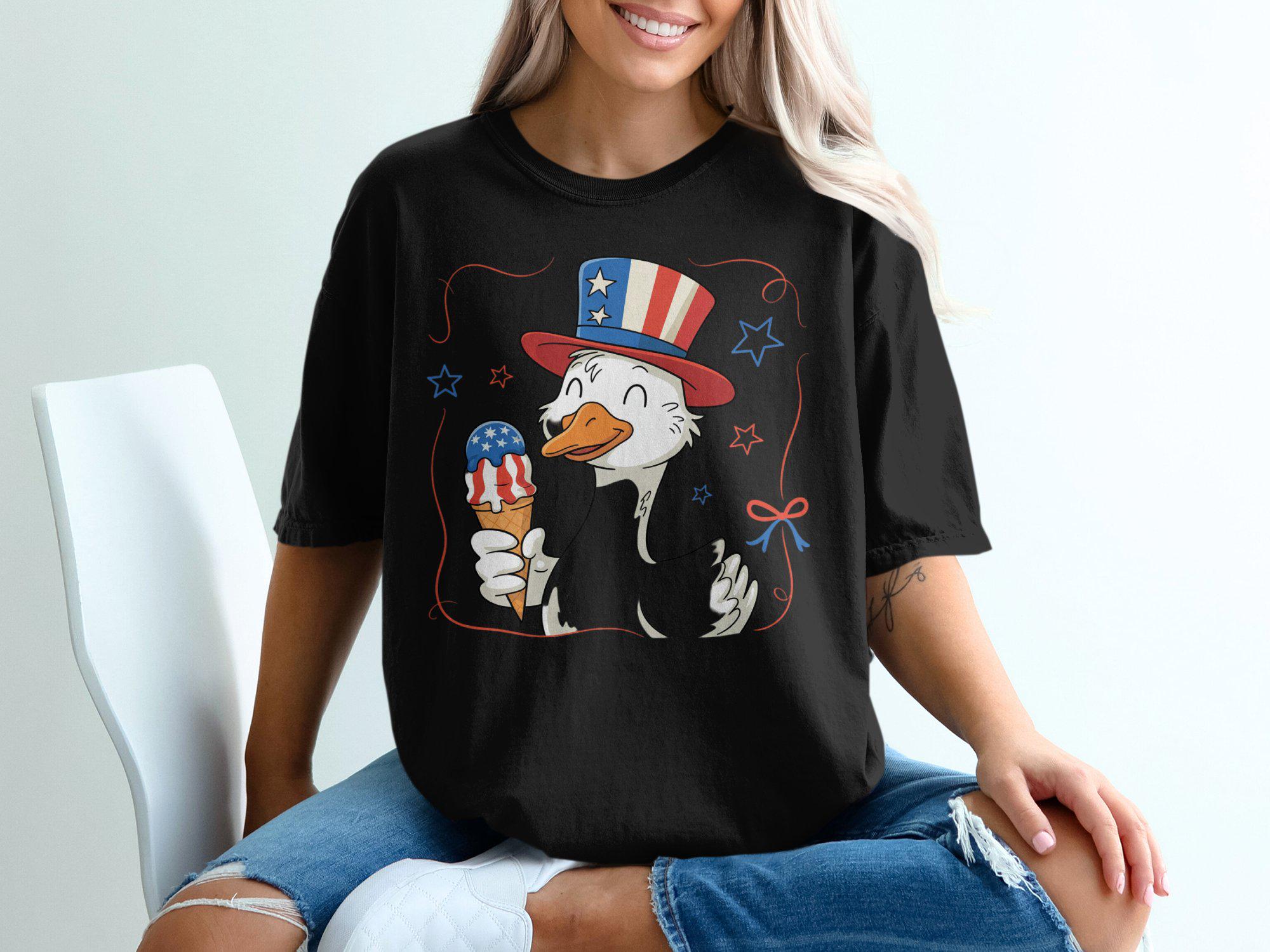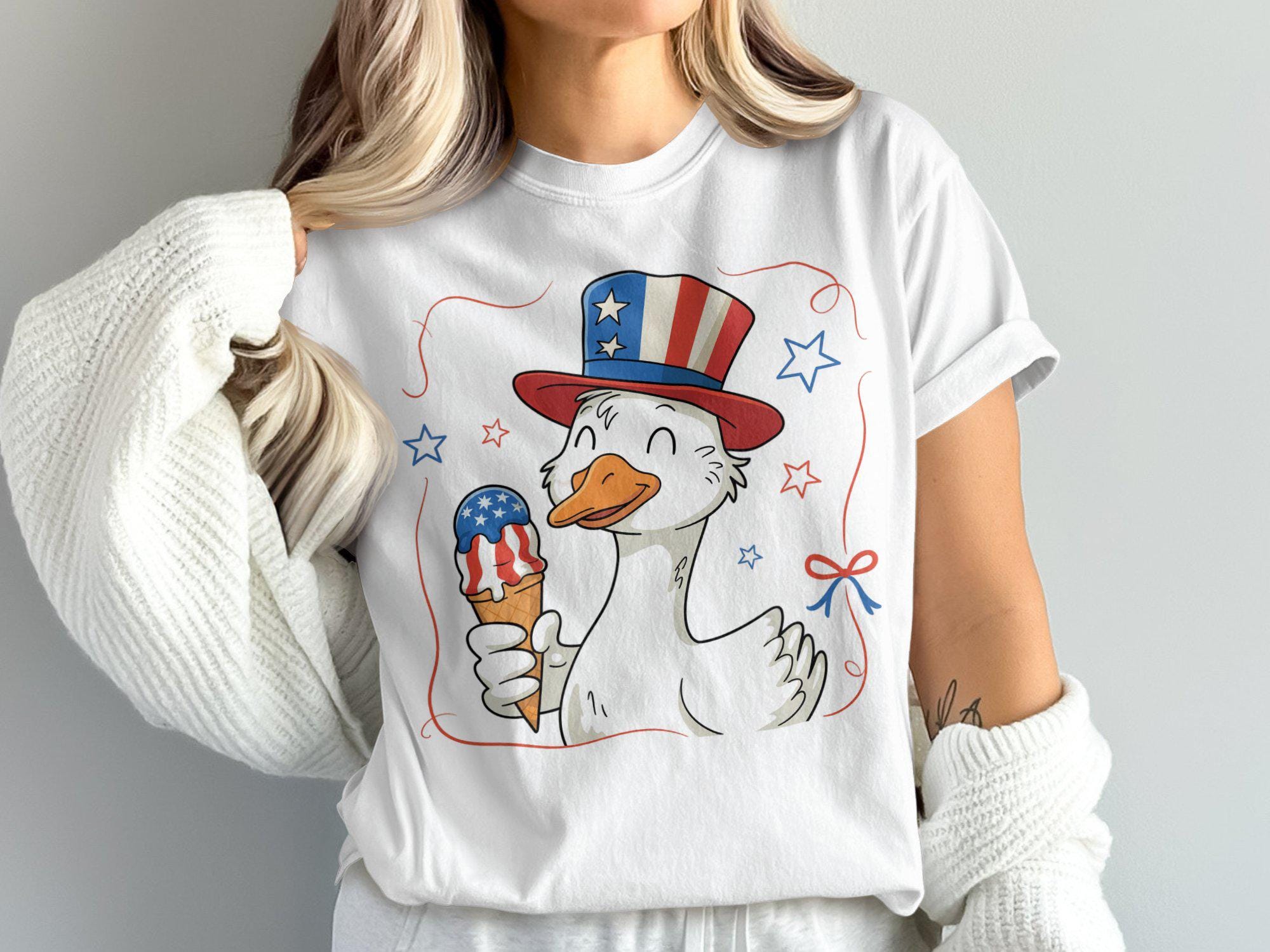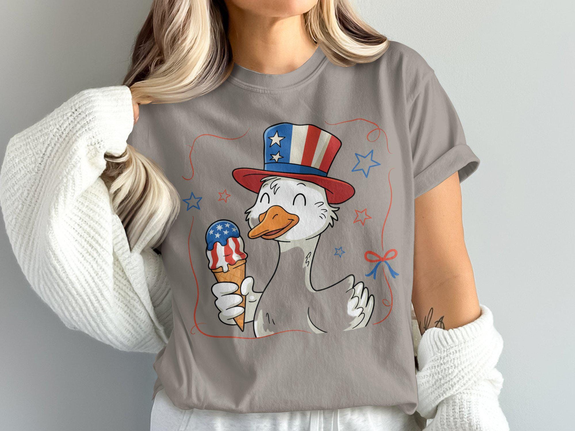 Celebrate Independence Day with this adorable Patriotic Goose T-Shirt. Featuring a charming goose wearing an Uncle Sam hat and holding an American flag ice cream cone. This unique design is perfect for 4th of July celebrations, patriotic events, or anyone who loves geese and American pride. Get yours today and show your love for the USA.