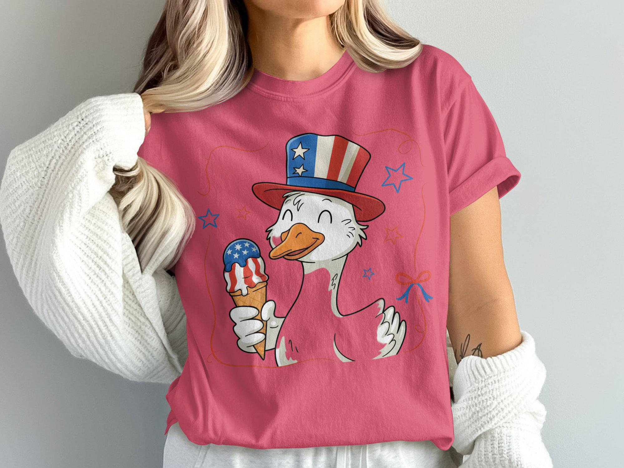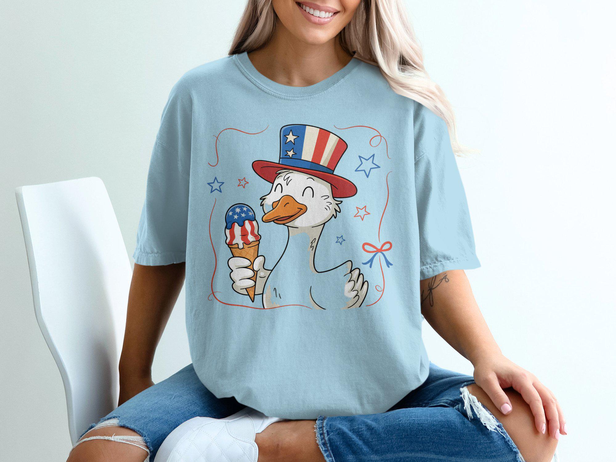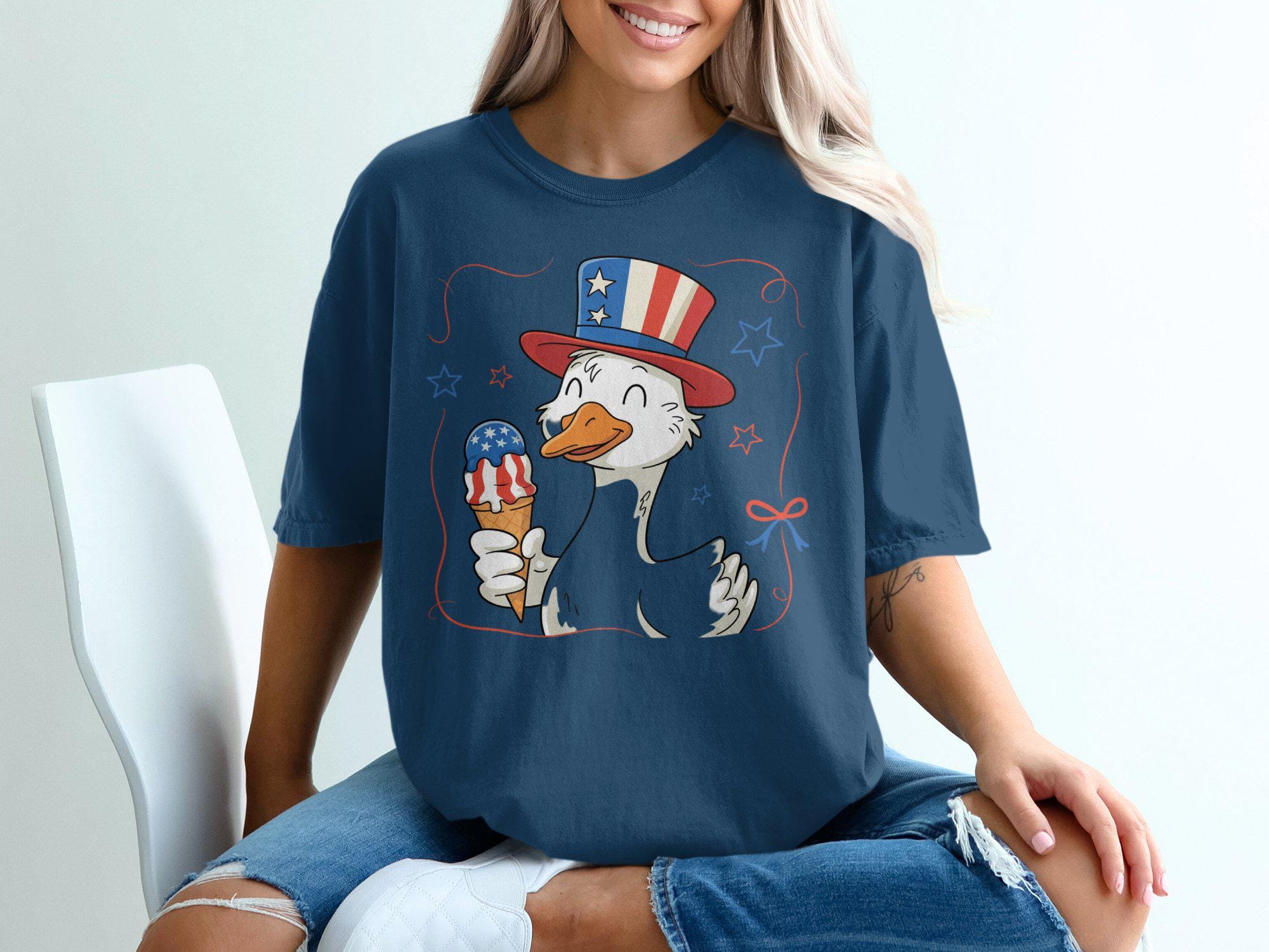 Celebrate Independence Day with this adorable Patriotic Goose T-Shirt. Featuring a charming goose wearing an Uncle Sam hat and holding an American flag ice cream cone. This unique design is perfect for 4th of July celebrations, patriotic events, or anyone who loves geese and American pride. Get yours today and show your love for the USA.