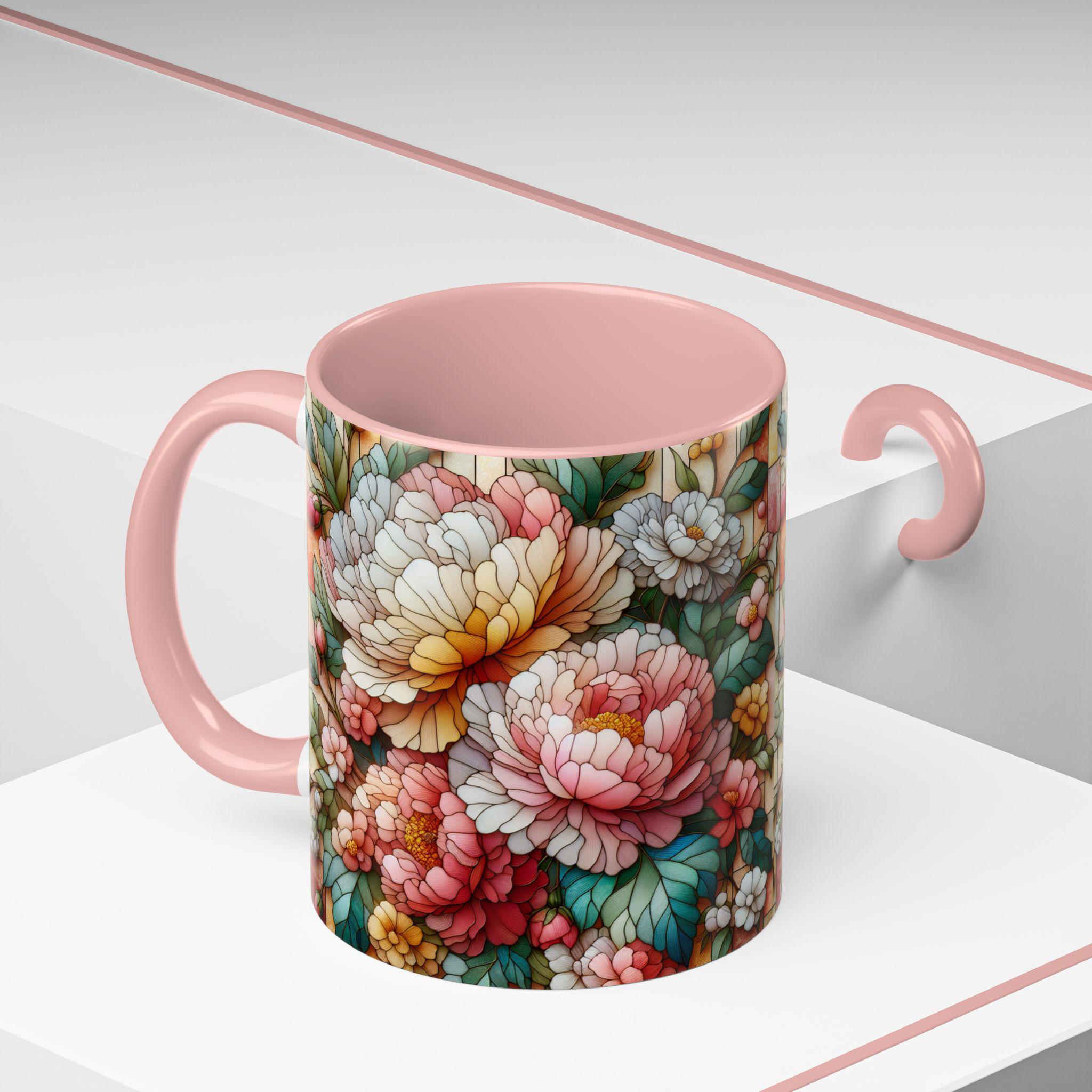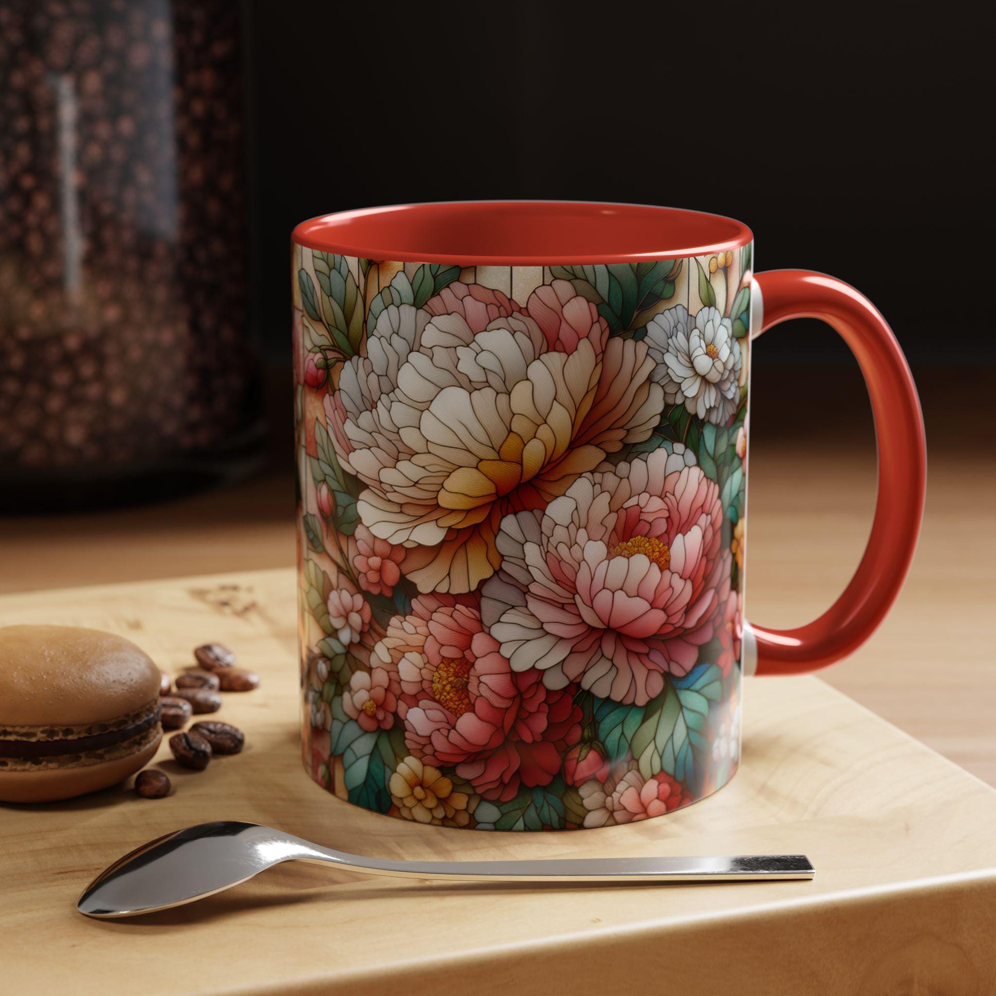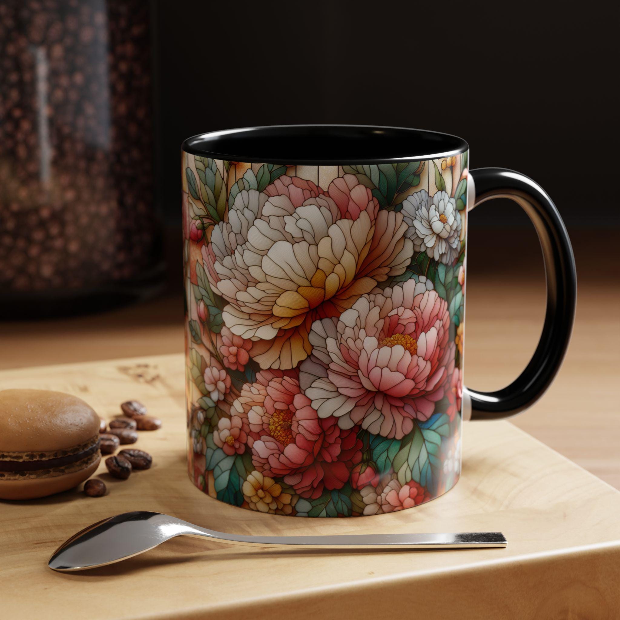 The Stained Glass Peonies Mug gives off a cozy and elegant vibe, perfect for enjoying a warm beverage at home or in the office. Ideal for flower lovers and those who appreciate artistic designs. Relevant for Mother's Day, birthdays, and special occasions.