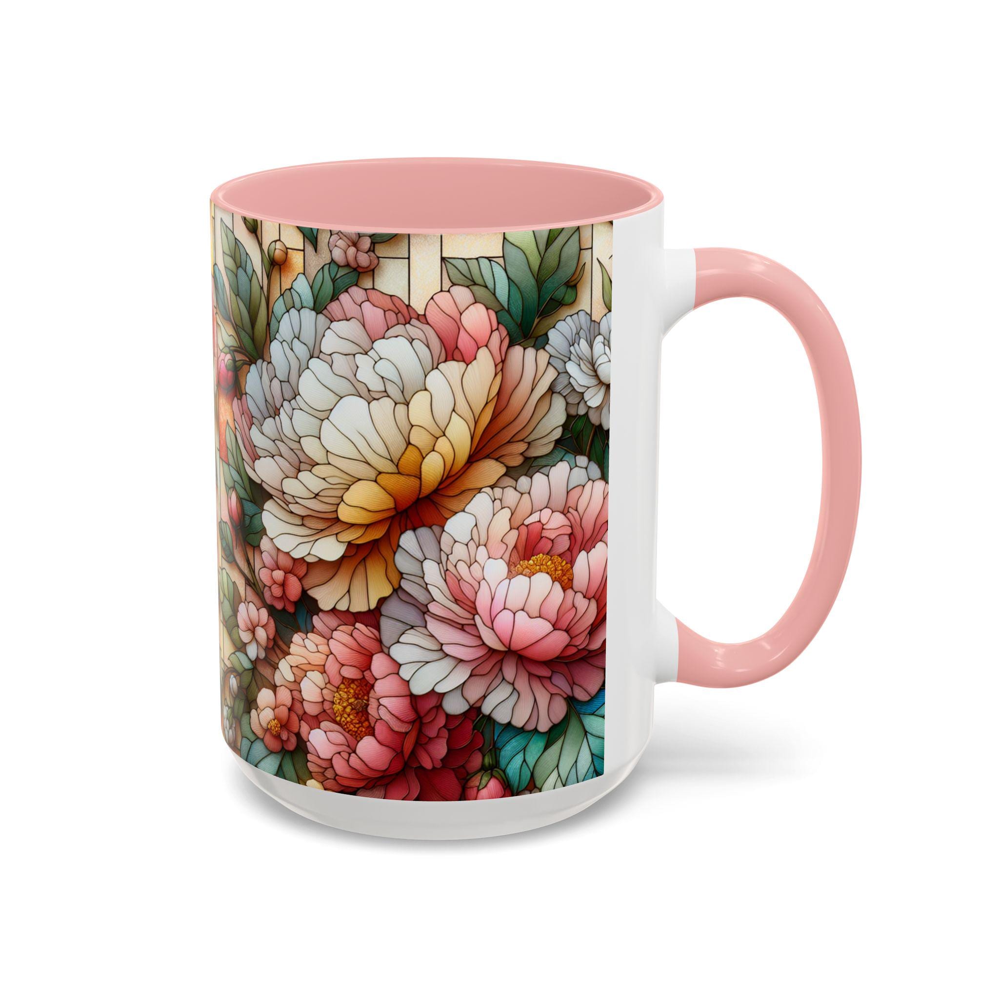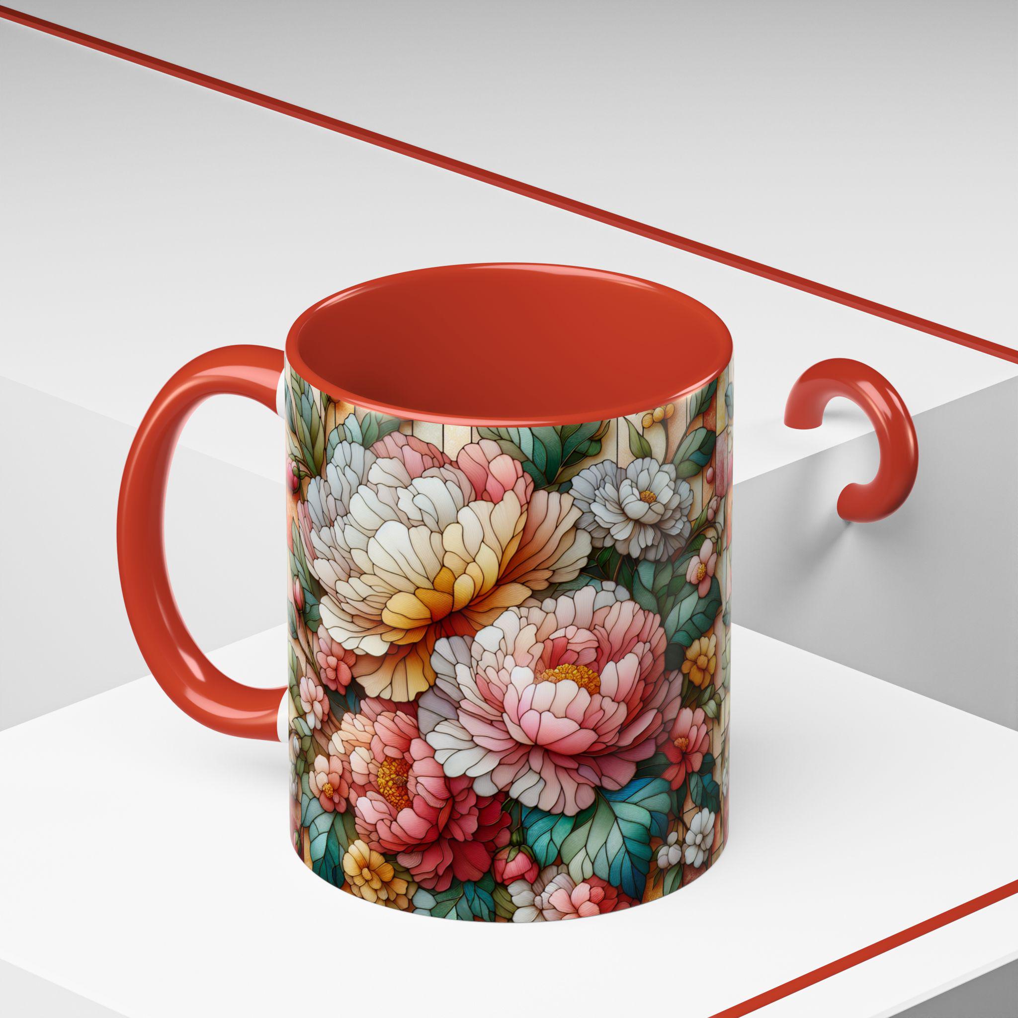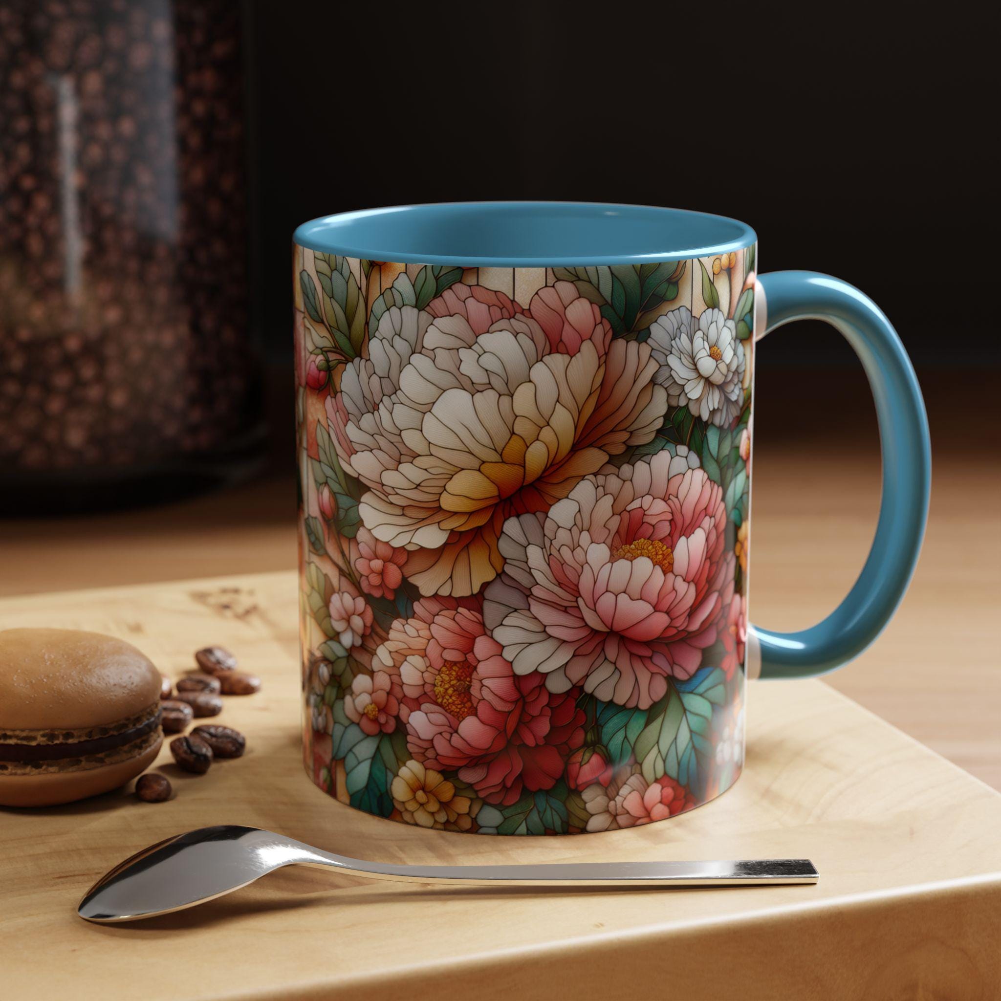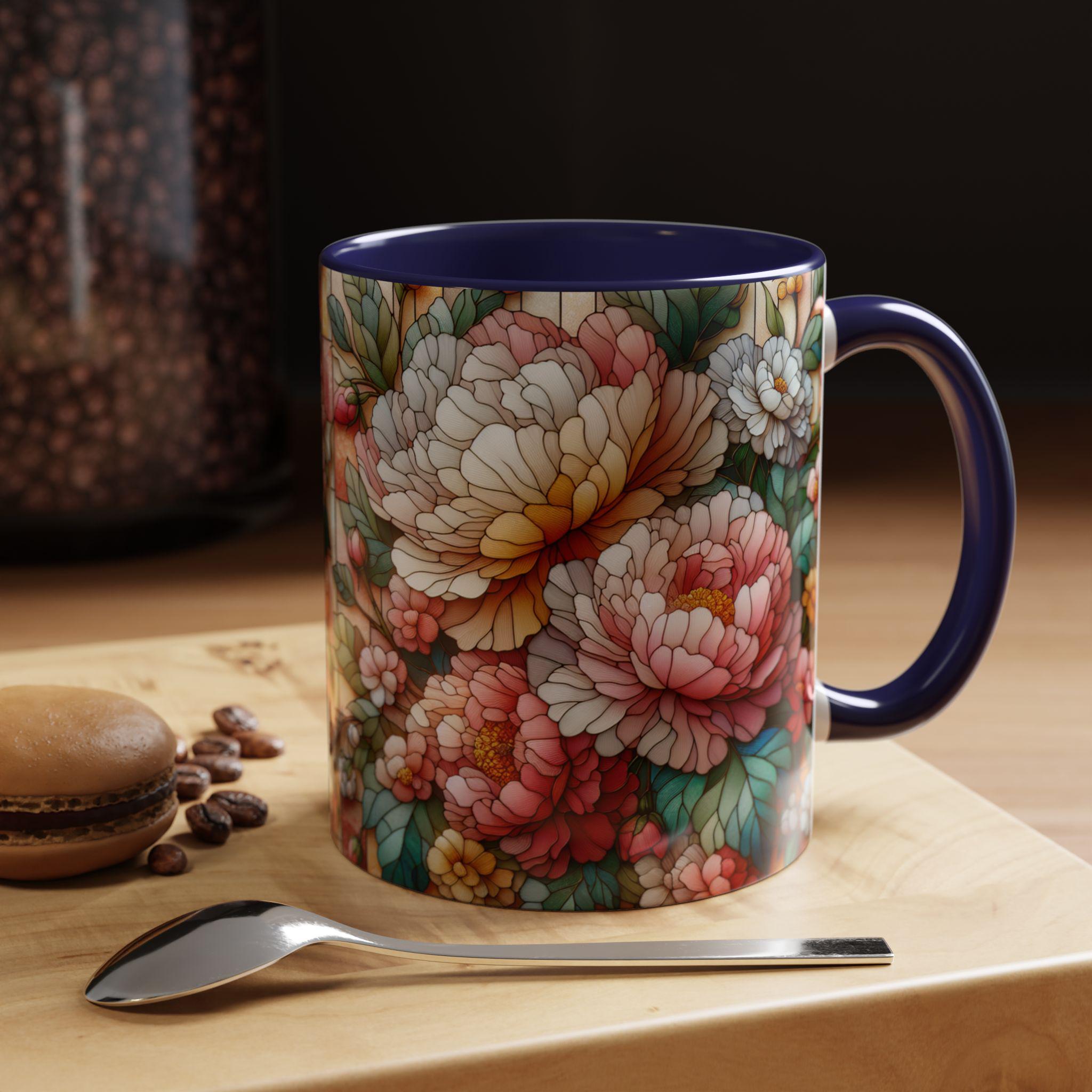 The Stained Glass Peonies Mug gives off a cozy and elegant vibe, perfect for enjoying a warm beverage at home or in the office. Ideal for flower lovers and those who appreciate artistic designs. Relevant for Mother's Day, birthdays, and special occasions.