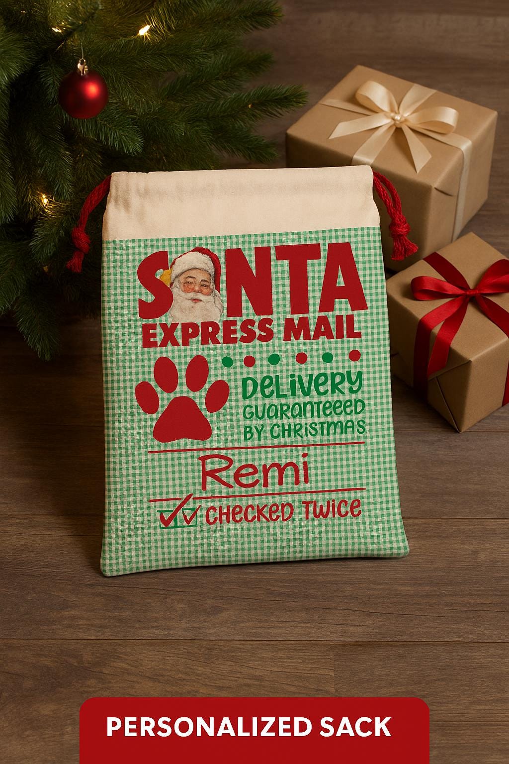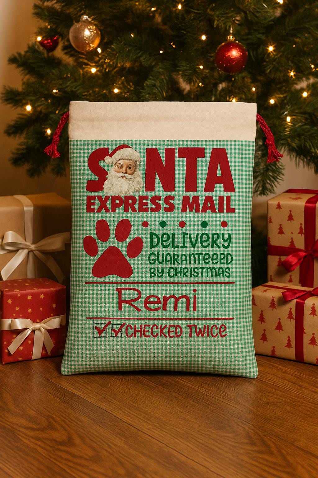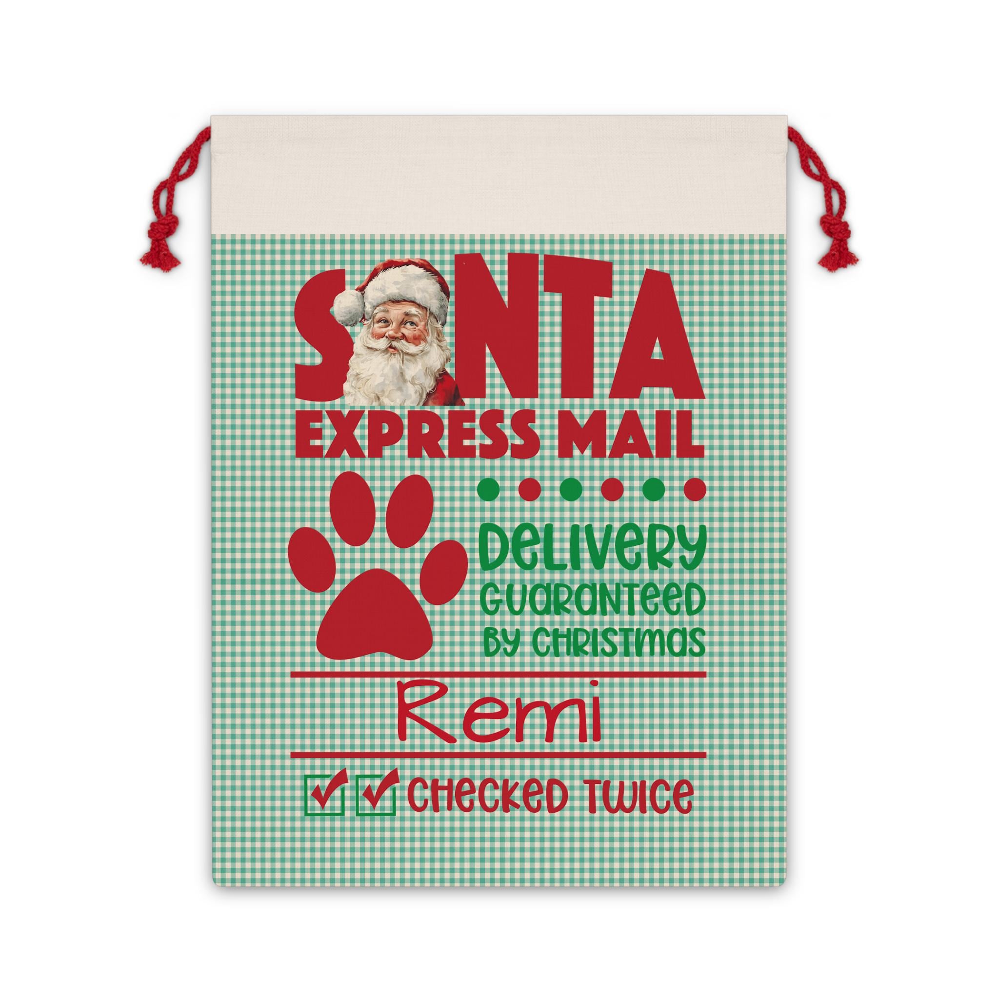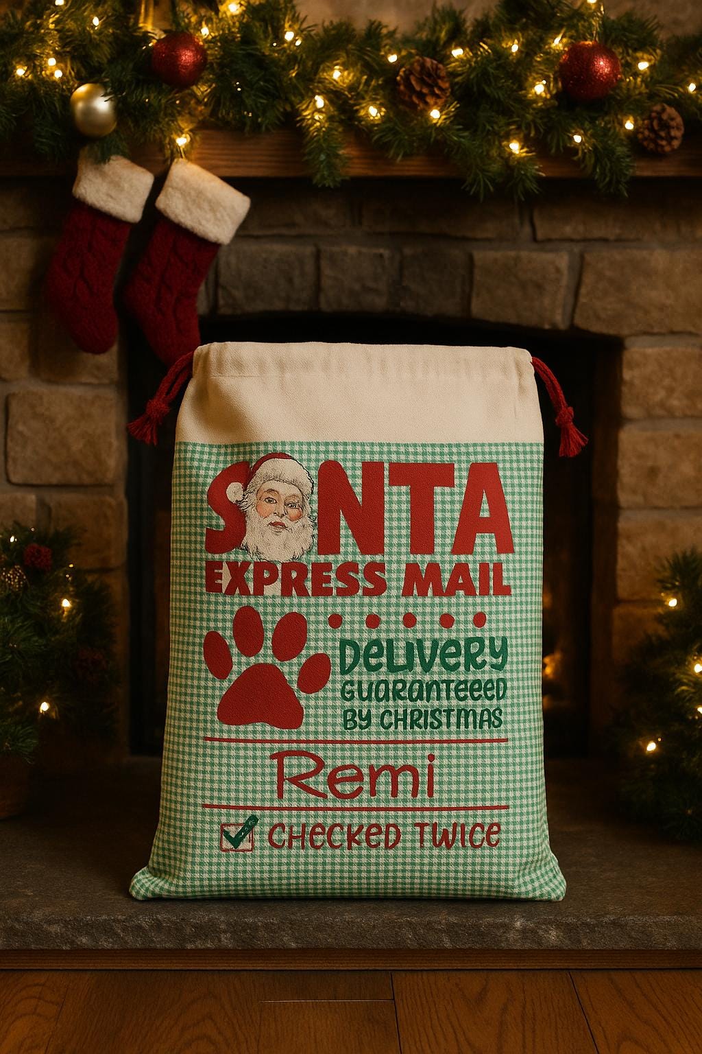 Make your pup feel extra special this holiday season with their very own Santa Express Mail Sack! Customized with your dog’s name, this festive Christmas gift bag is perfect for holding treats, toys, and holiday surprises. Featuring a nostalgic vintage design with Santa, a paw print, and playful Christmas details, this sack is both decorative and practical.
