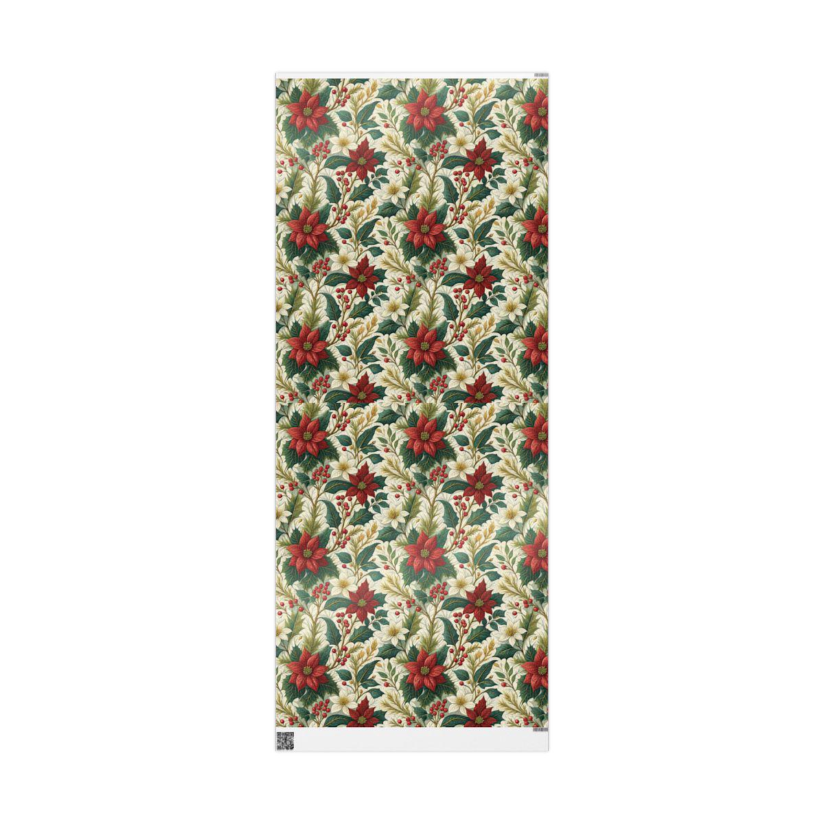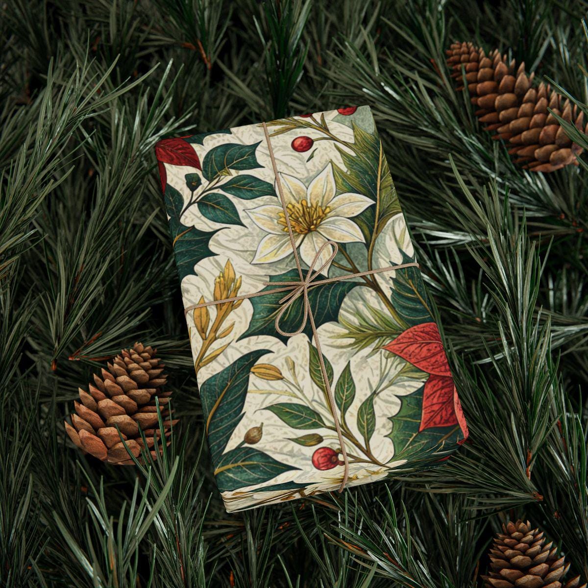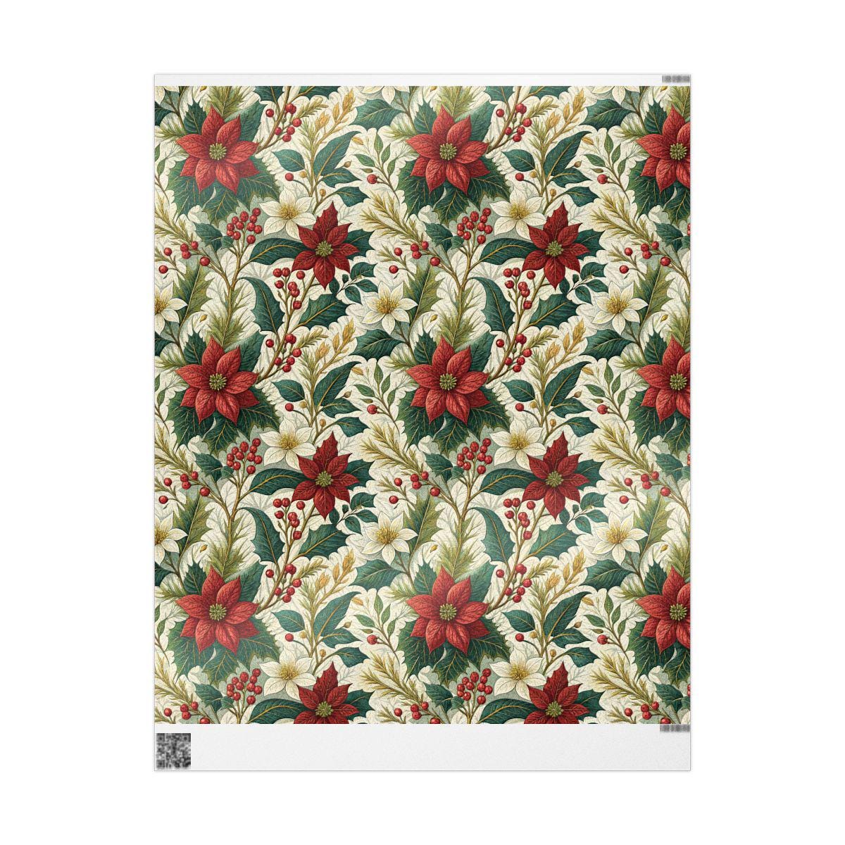 Elevate your holiday gift-giving with our luxurious Christmas wrapping paper. This premium quality gift wrap features a festive botanical design with rich red poinsettias, green holly leaves, and elegant white flowers, perfect for any Christmas celebration. Our eco-friendly wrapping paper not only adds a touch of elegance to your presents but also supports sustainable practices. Make your gifts stand out with this stunning holiday paper.