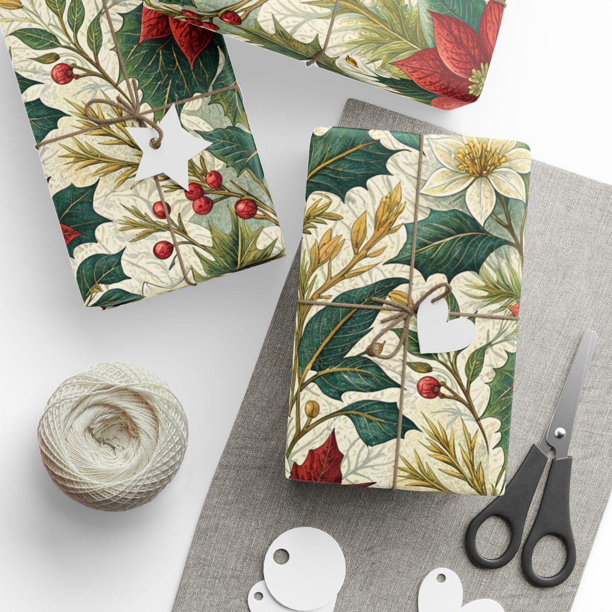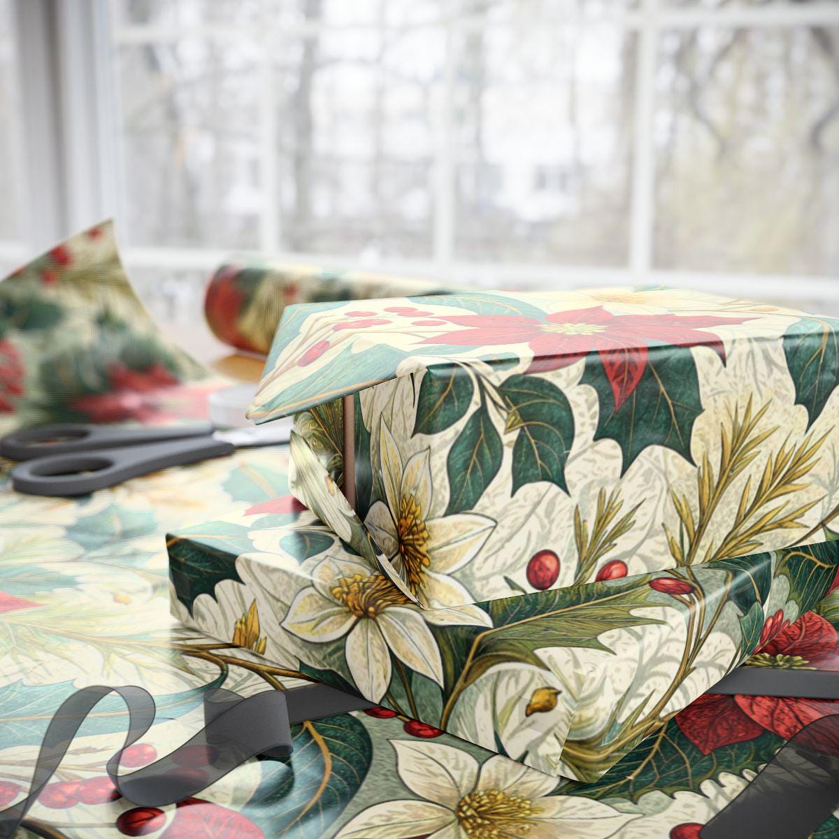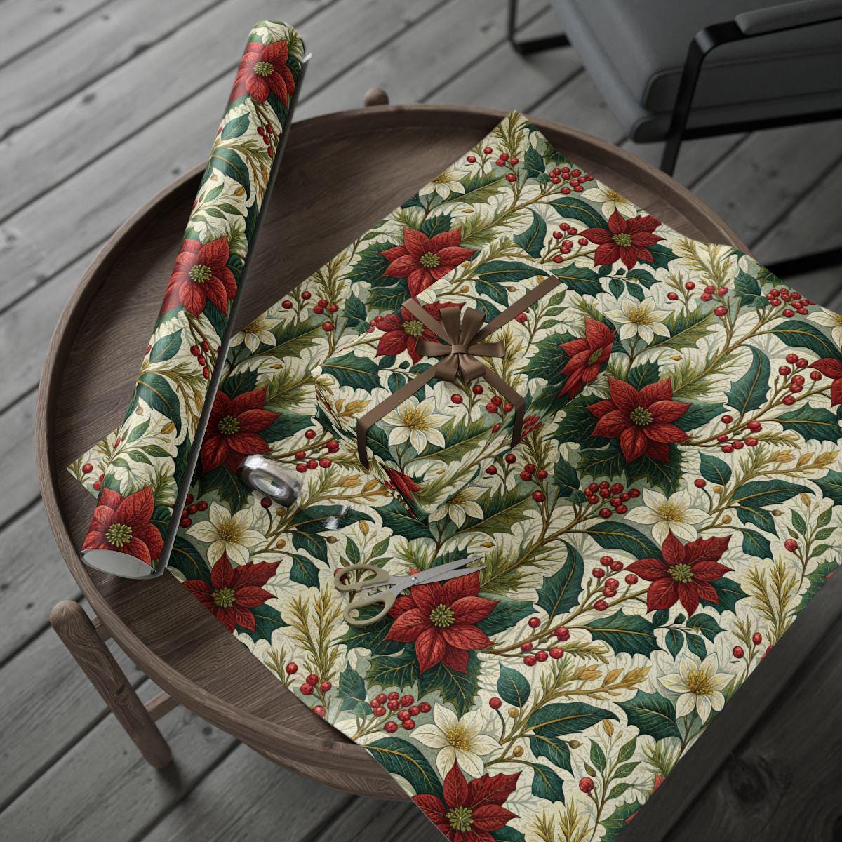 Elevate your holiday gift-giving with our luxurious Christmas wrapping paper. This premium quality gift wrap features a festive botanical design with rich red poinsettias, green holly leaves, and elegant white flowers, perfect for any Christmas celebration. Our eco-friendly wrapping paper not only adds a touch of elegance to your presents but also supports sustainable practices. Make your gifts stand out with this stunning holiday paper.