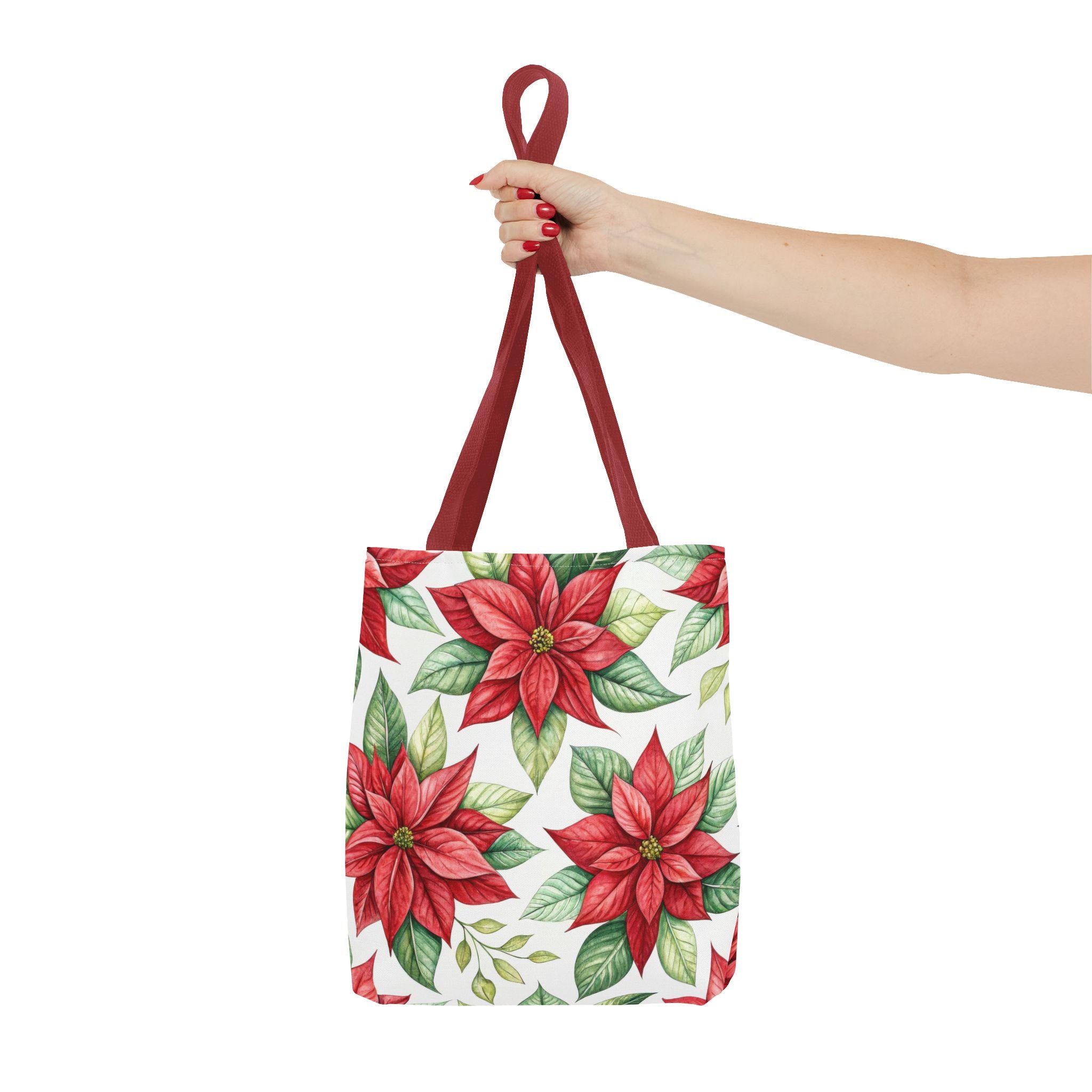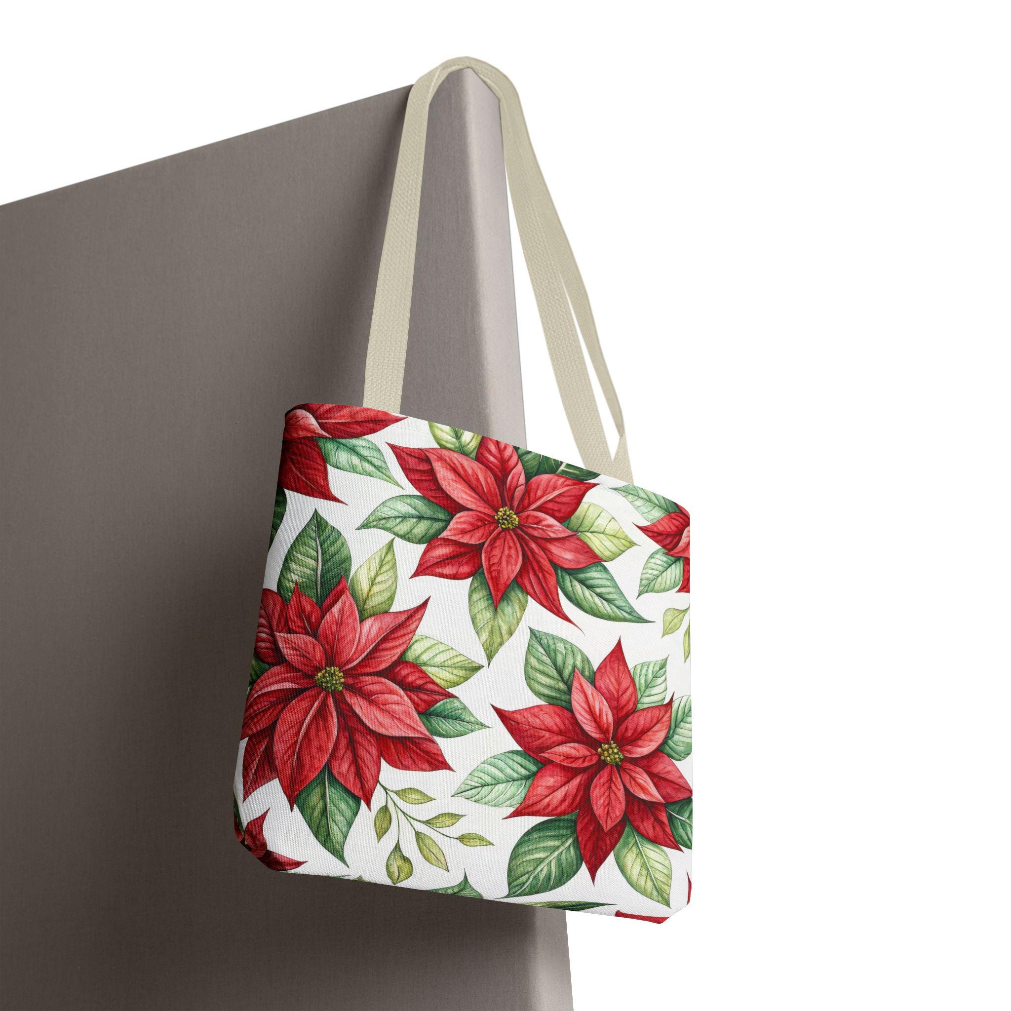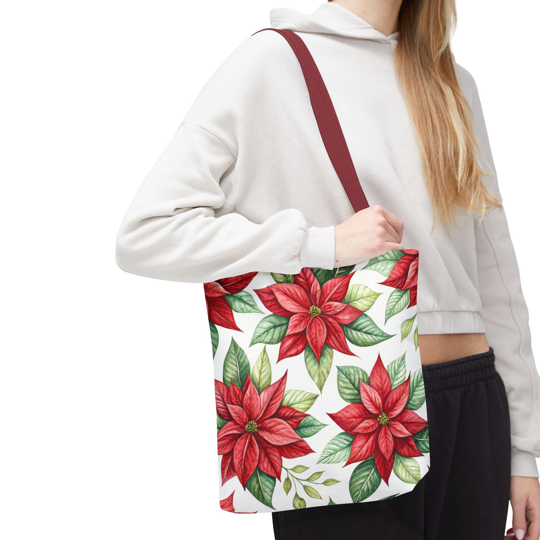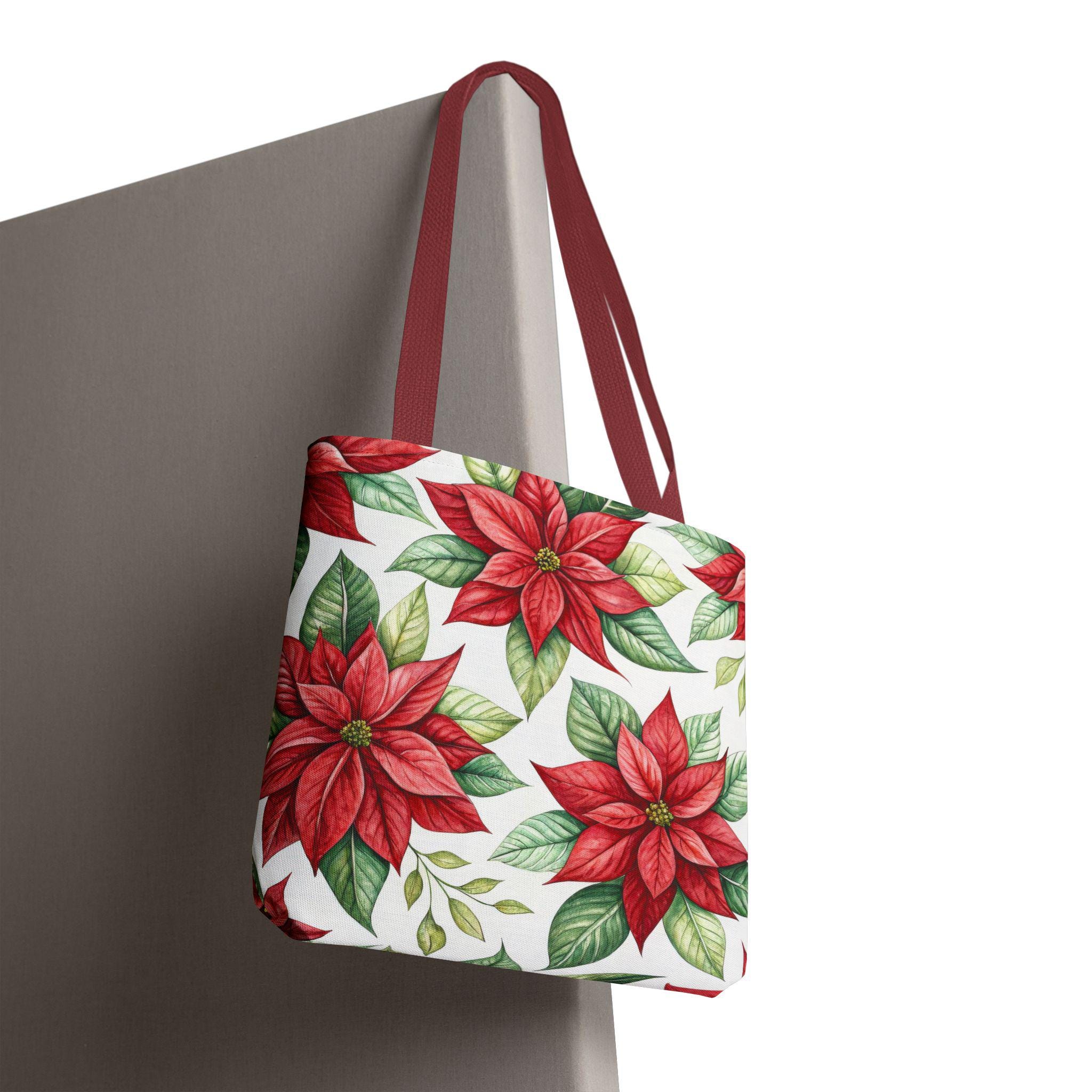 Vibrant red poinsettia floral tote bag with various color accent strap, perfect for adding a pop of color to your outfit. This durable and versatile tote bag is ideal for everyday use, whether you're running errands or heading to the beach. A great gift for botanical enthusiasts or anyone who loves floral patterns. Perfect for Christmas, winter holidays, and everyday use.