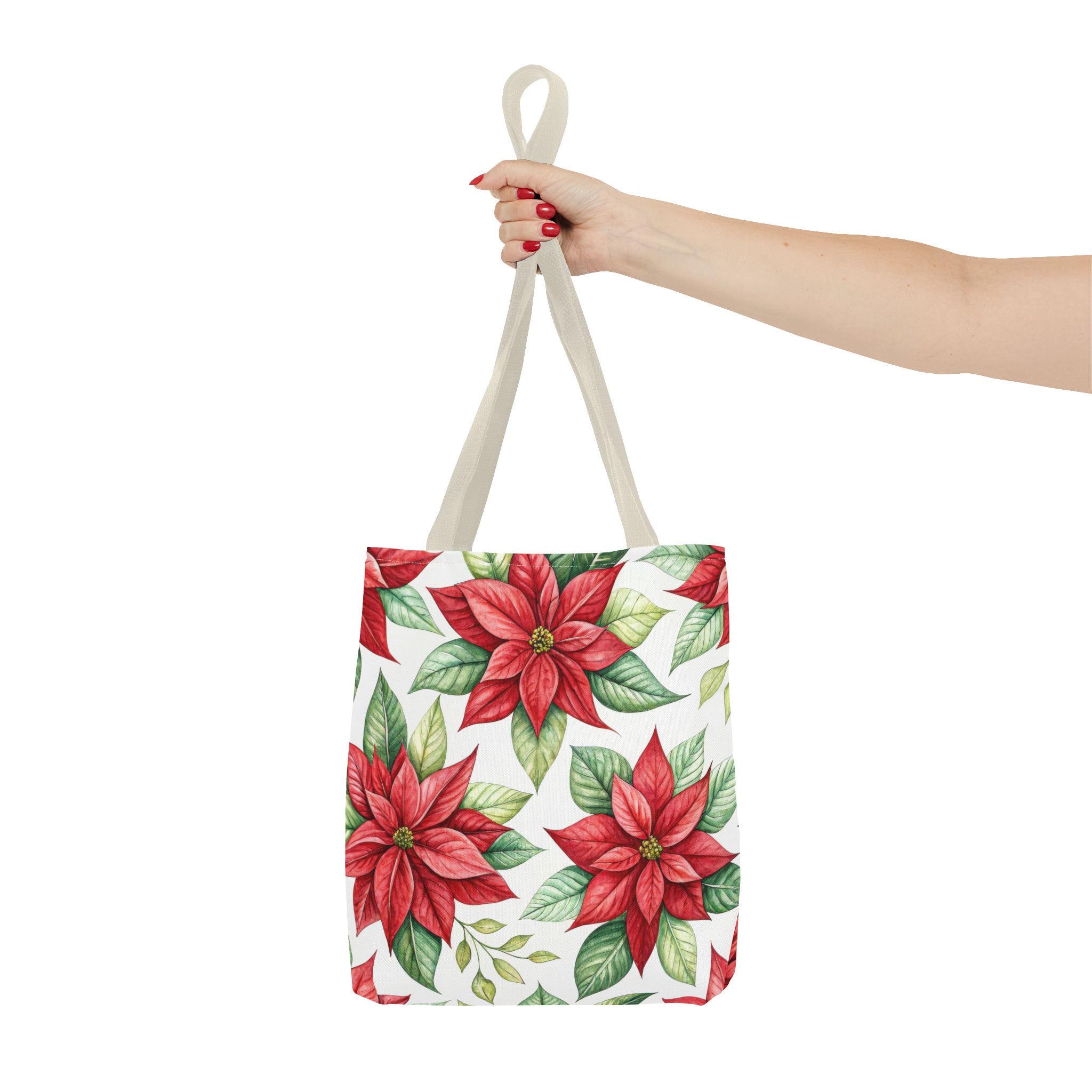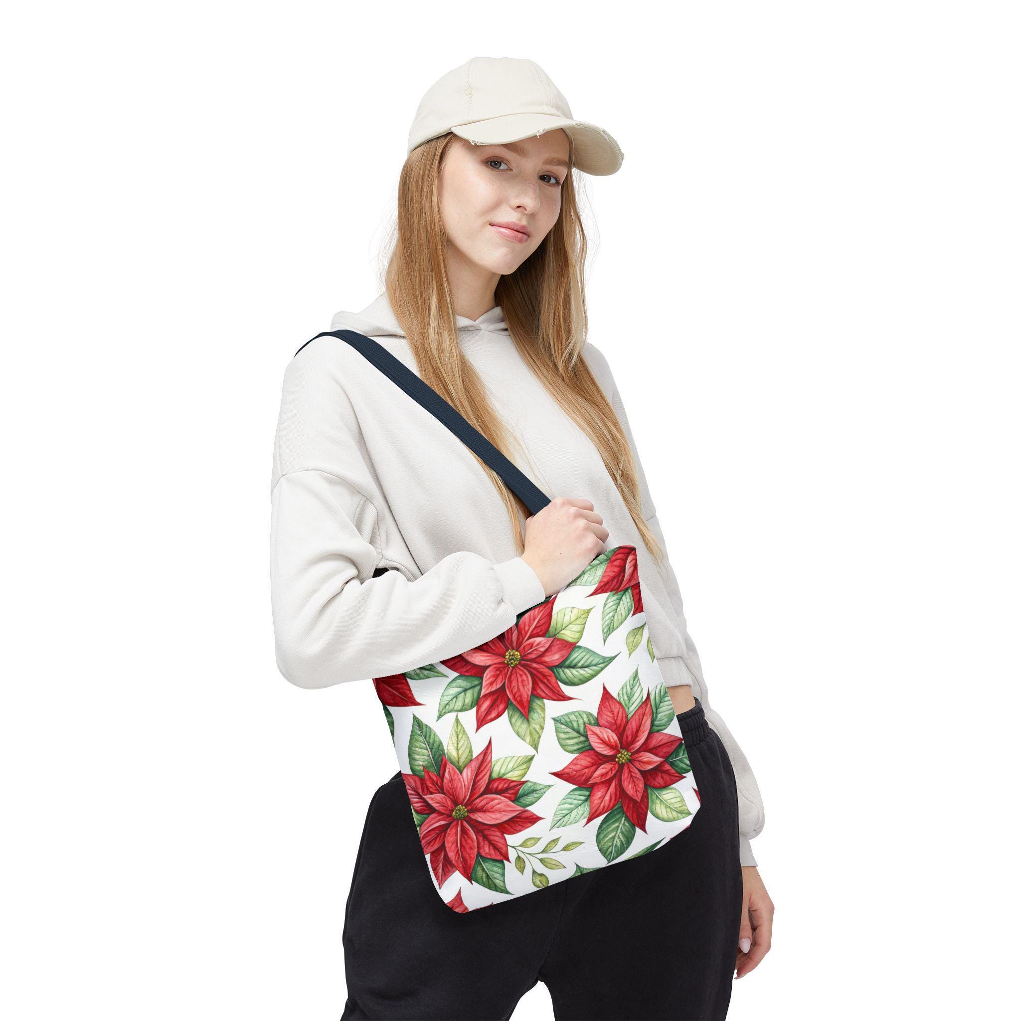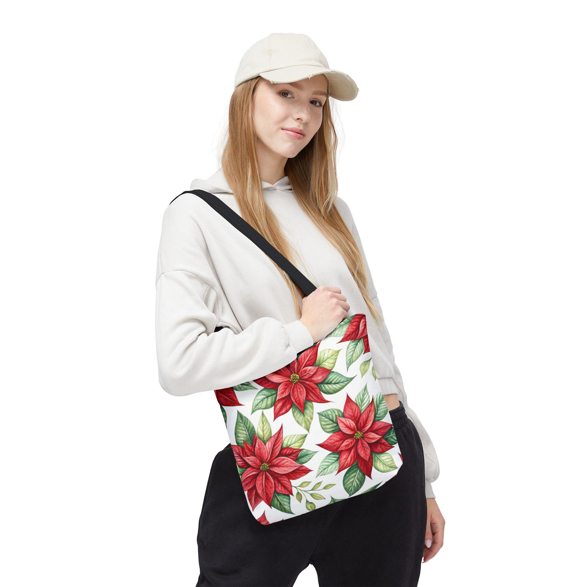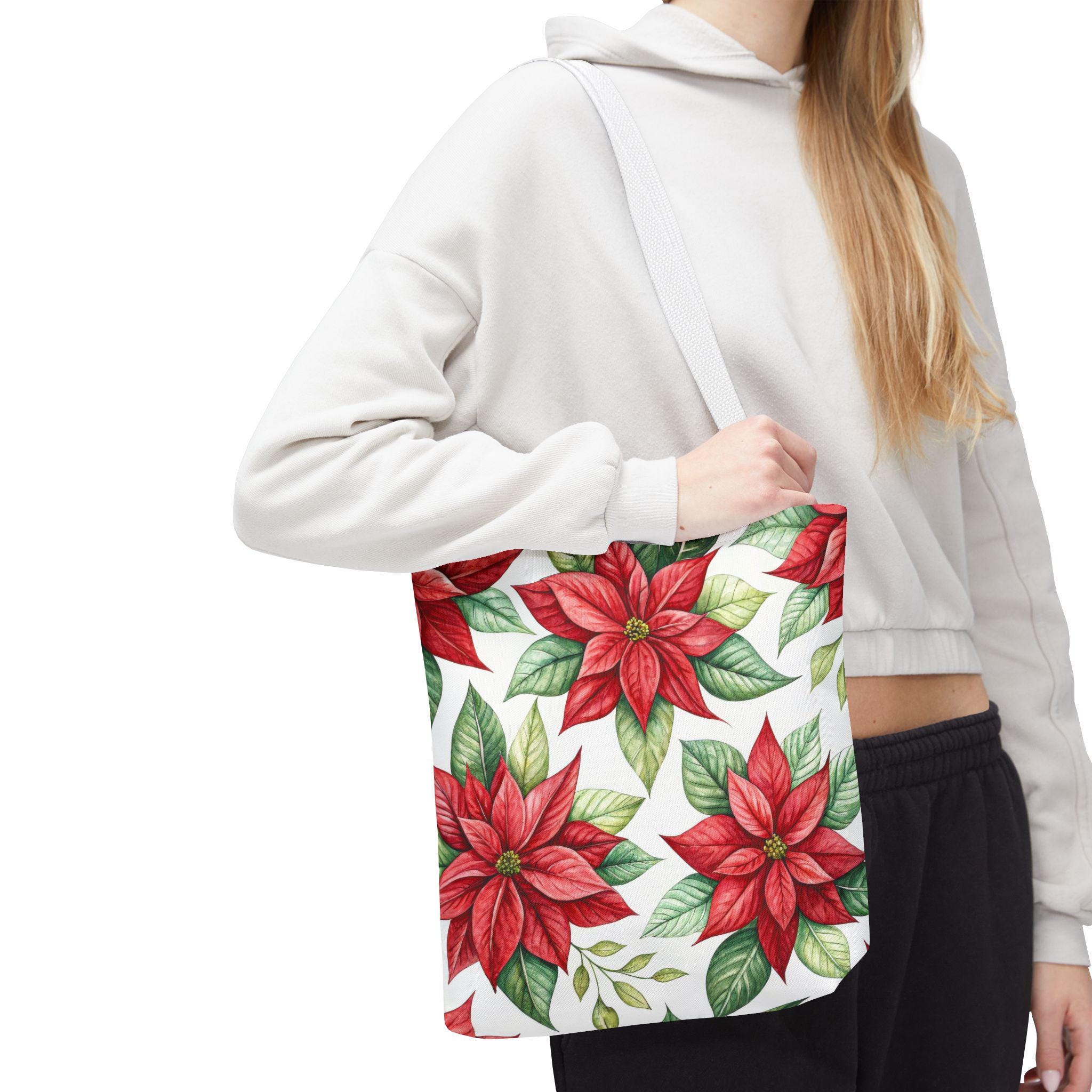 Vibrant red poinsettia floral tote bag with various color accent strap, perfect for adding a pop of color to your outfit. This durable and versatile tote bag is ideal for everyday use, whether you're running errands or heading to the beach. A great gift for botanical enthusiasts or anyone who loves floral patterns. Perfect for Christmas, winter holidays, and everyday use.