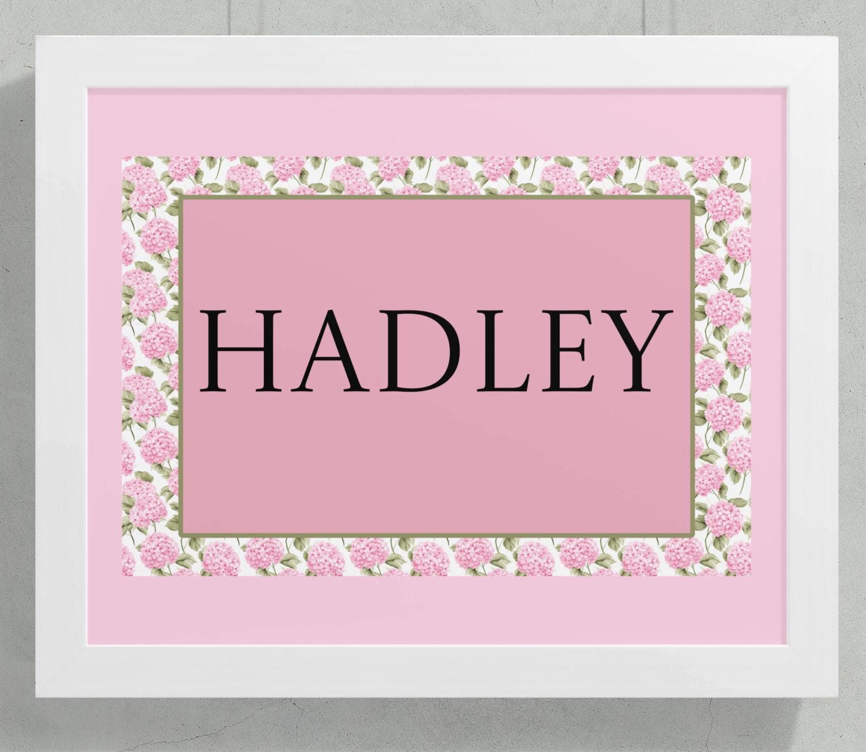 This beautiful framed poster with custom name surrounded by a delicate pink hydrangea floral design. It makes a wonderful personalized gift for a baby girl or a lovely addition to a nursery, or girl's room decor. The custom name adds a special touch, making it a unique piece of wall art.