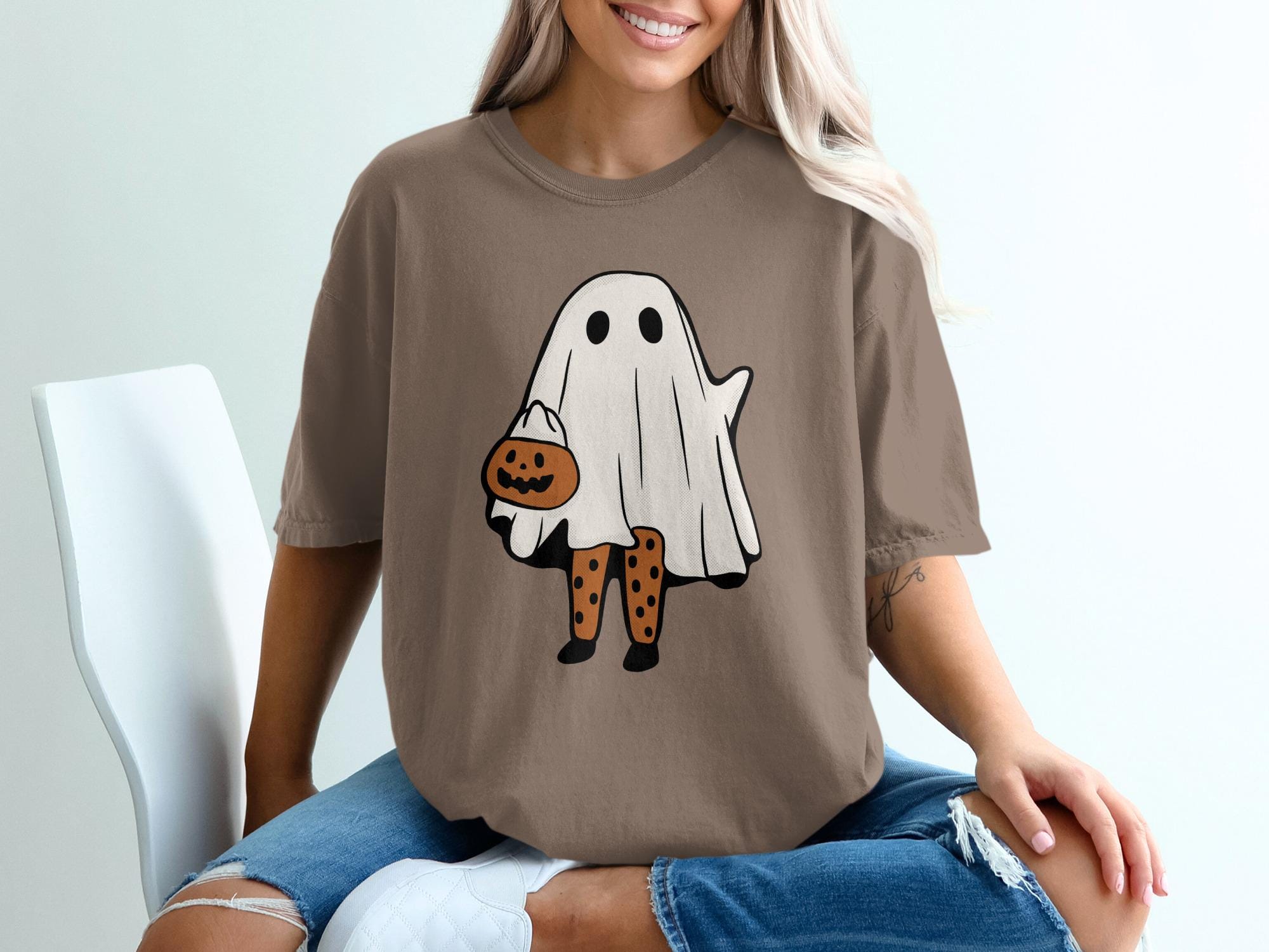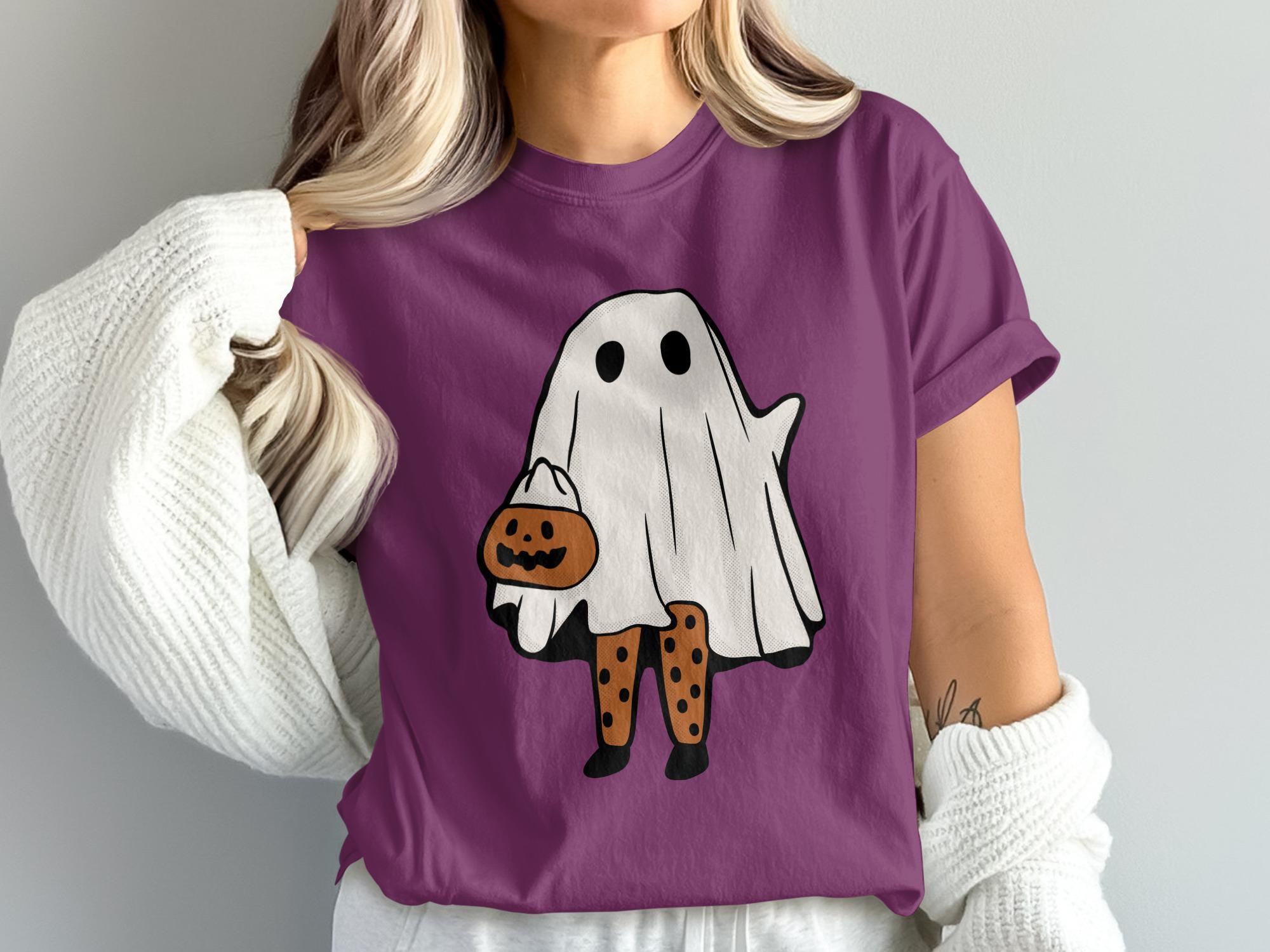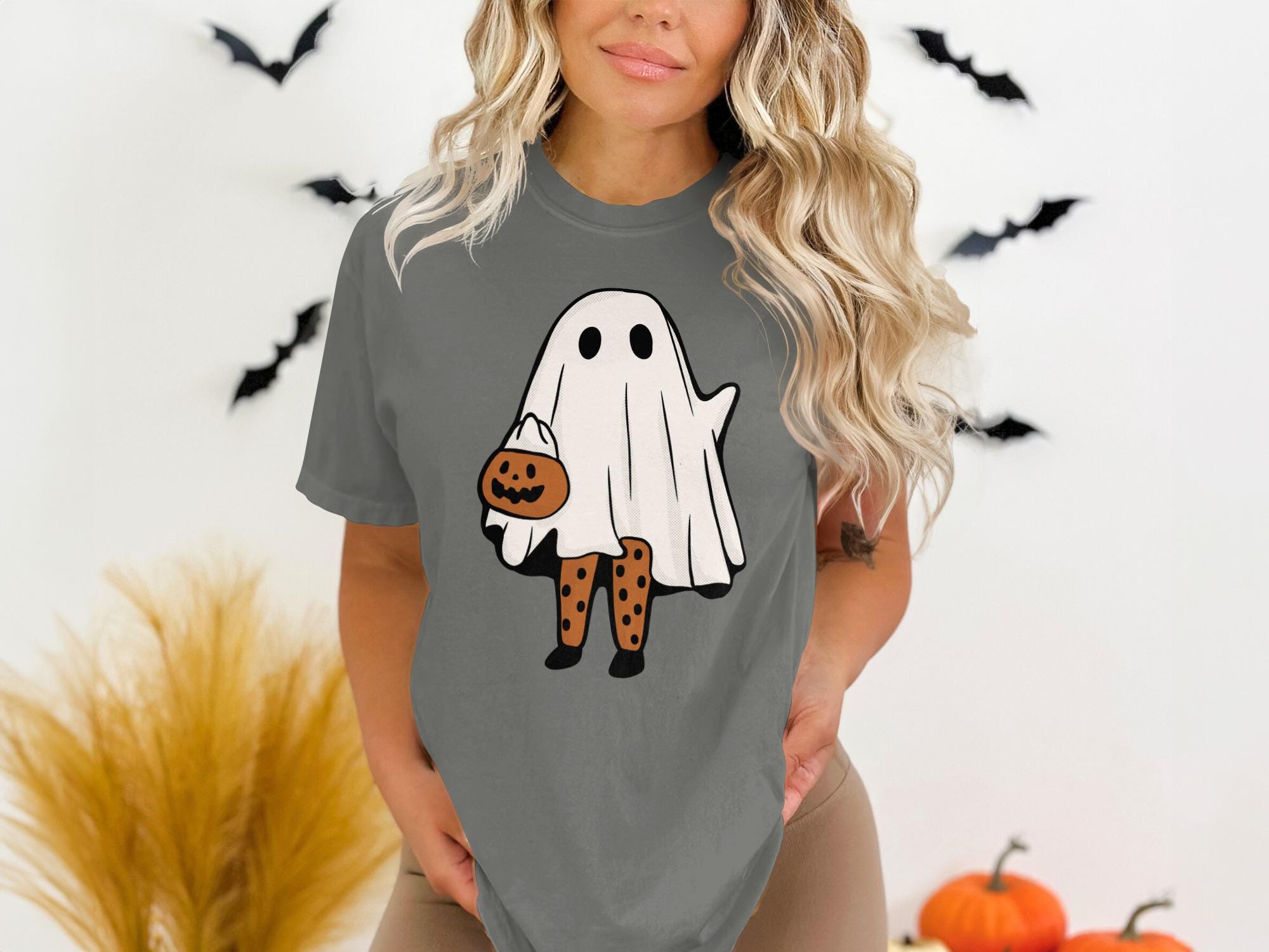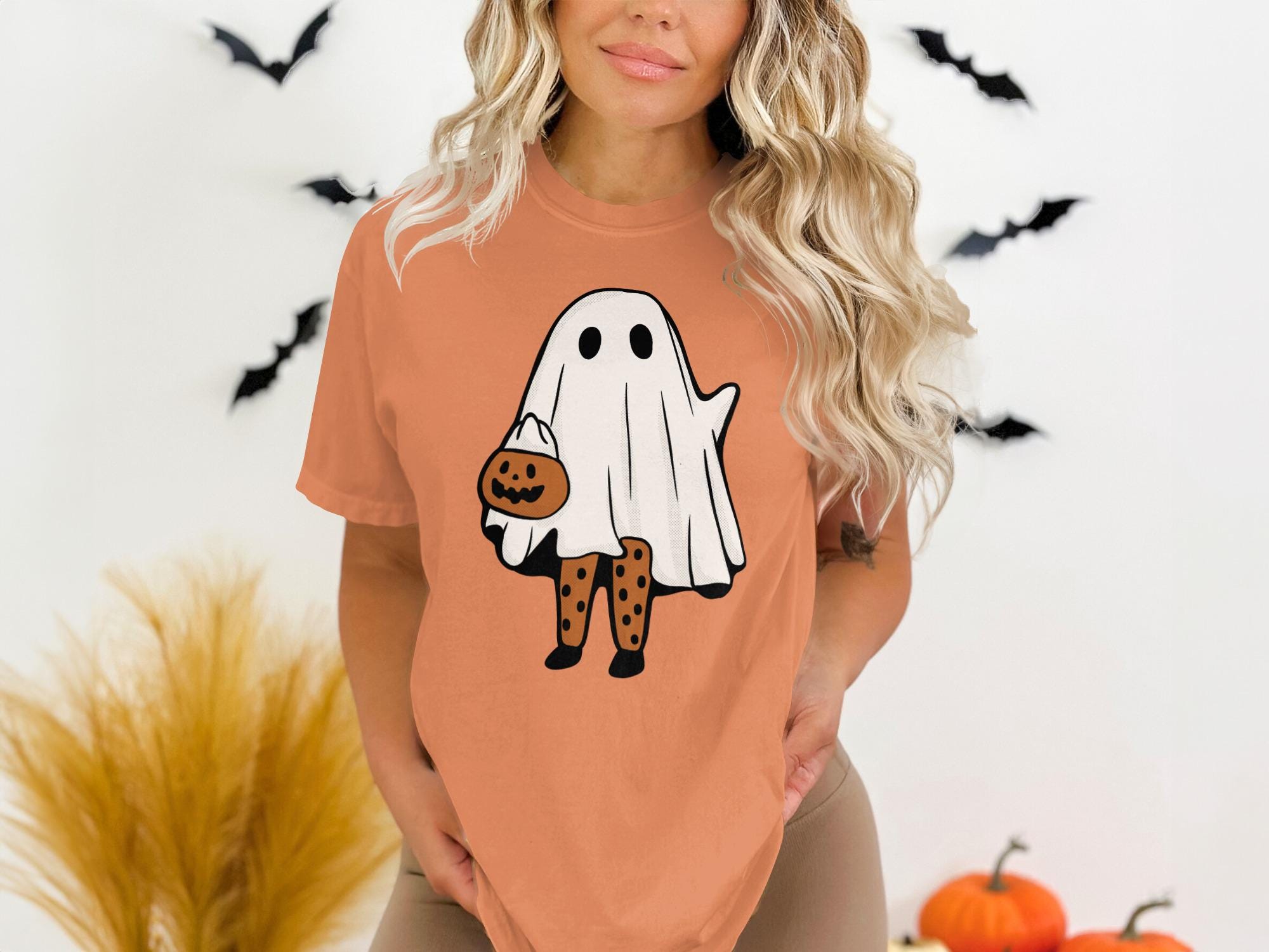 Get ready for Halloween with this adorable ghost T-shirt! Featuring a cute ghost holding a pumpkin bag, this design is perfect for spooky season. A fun, festive, and fashionable way to celebrate Halloween, this unique design is sure to turn heads and spread some Halloween cheer.