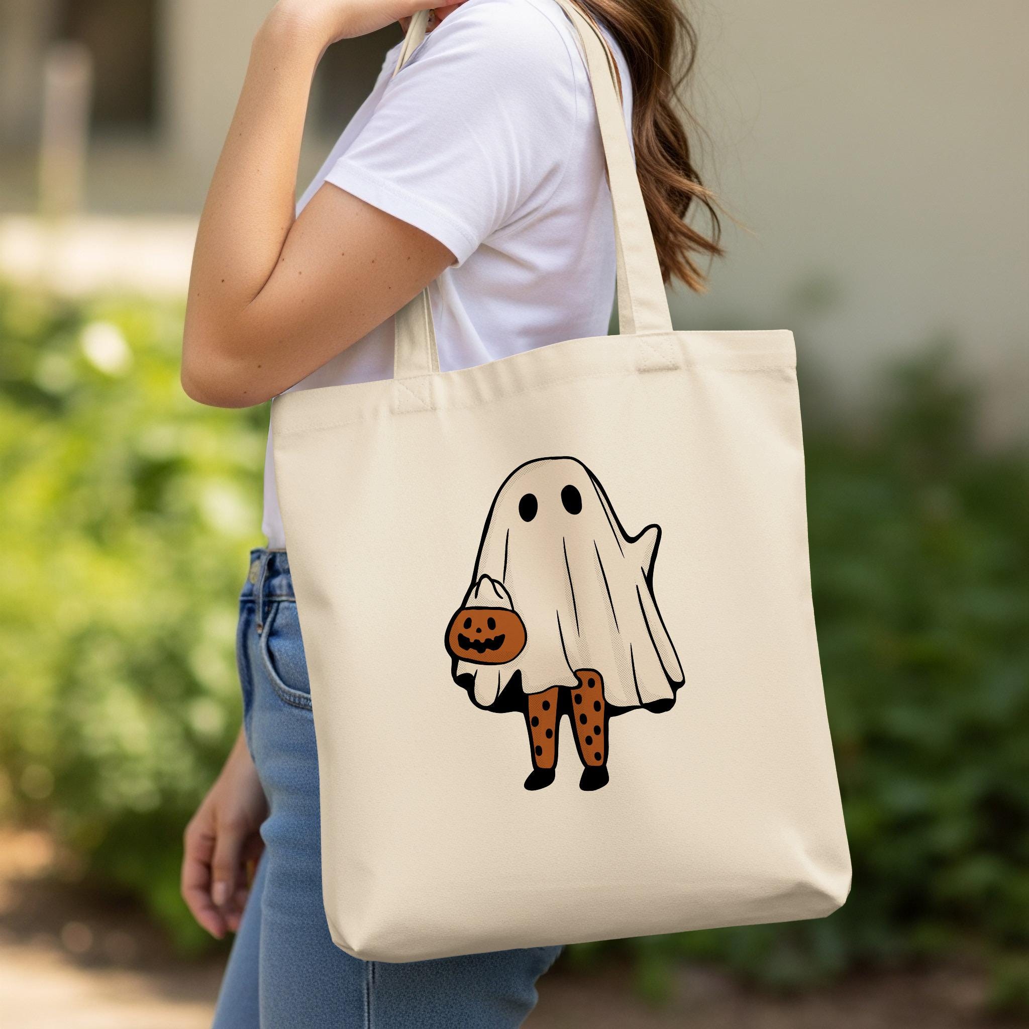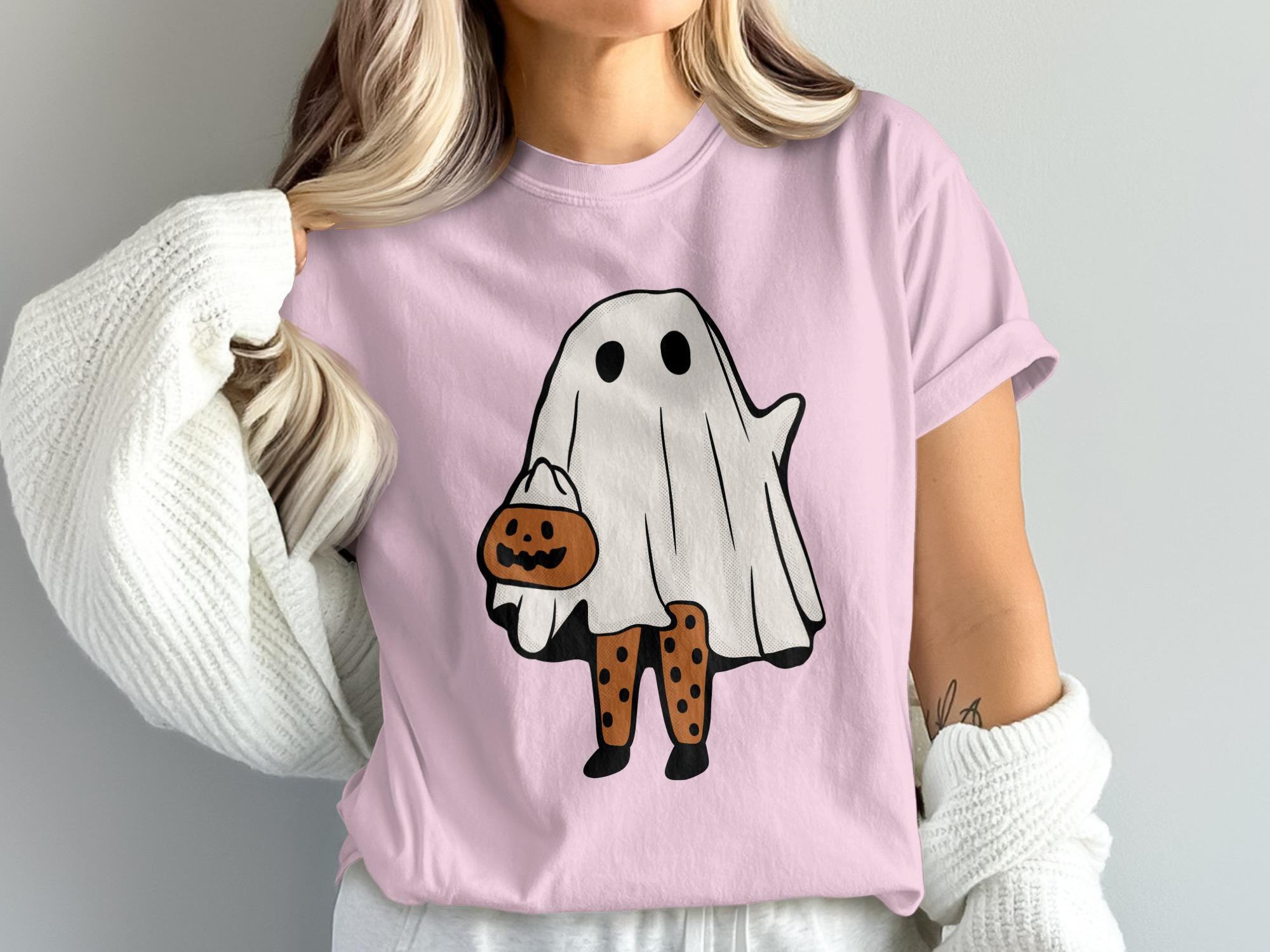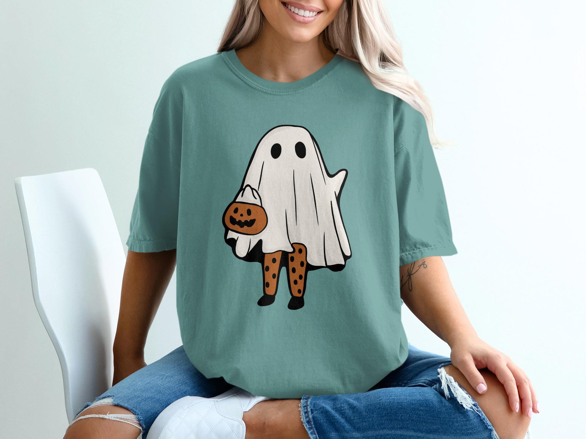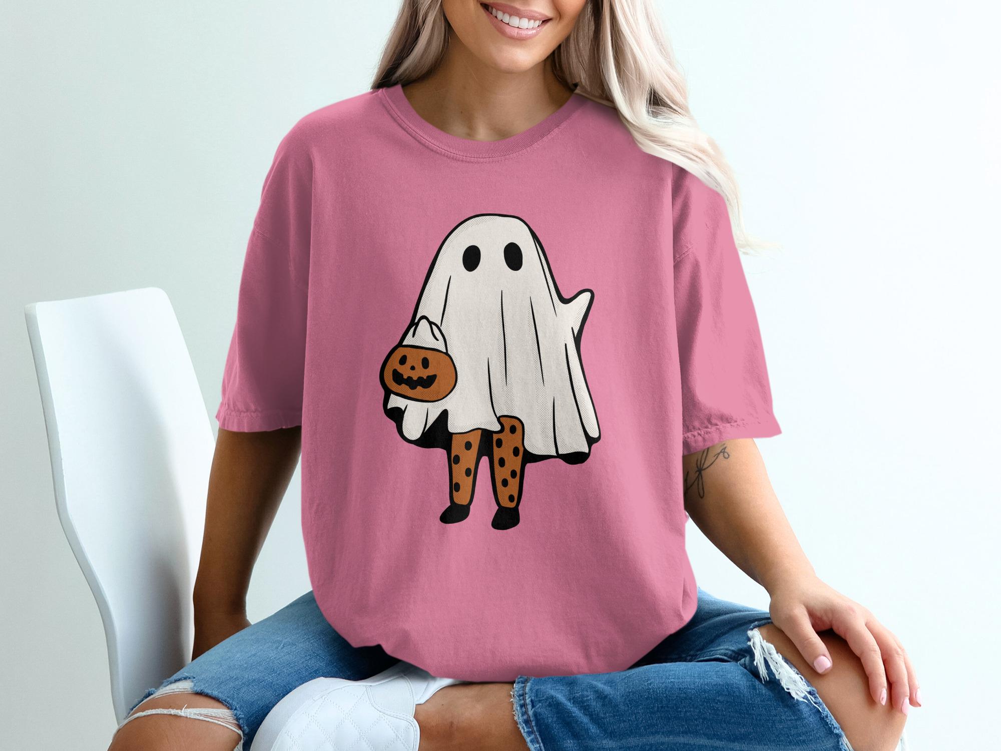 Get ready for Halloween with this adorable ghost T-shirt! Featuring a cute ghost holding a pumpkin bag, this design is perfect for spooky season. A fun, festive, and fashionable way to celebrate Halloween, this unique design is sure to turn heads and spread some Halloween cheer.